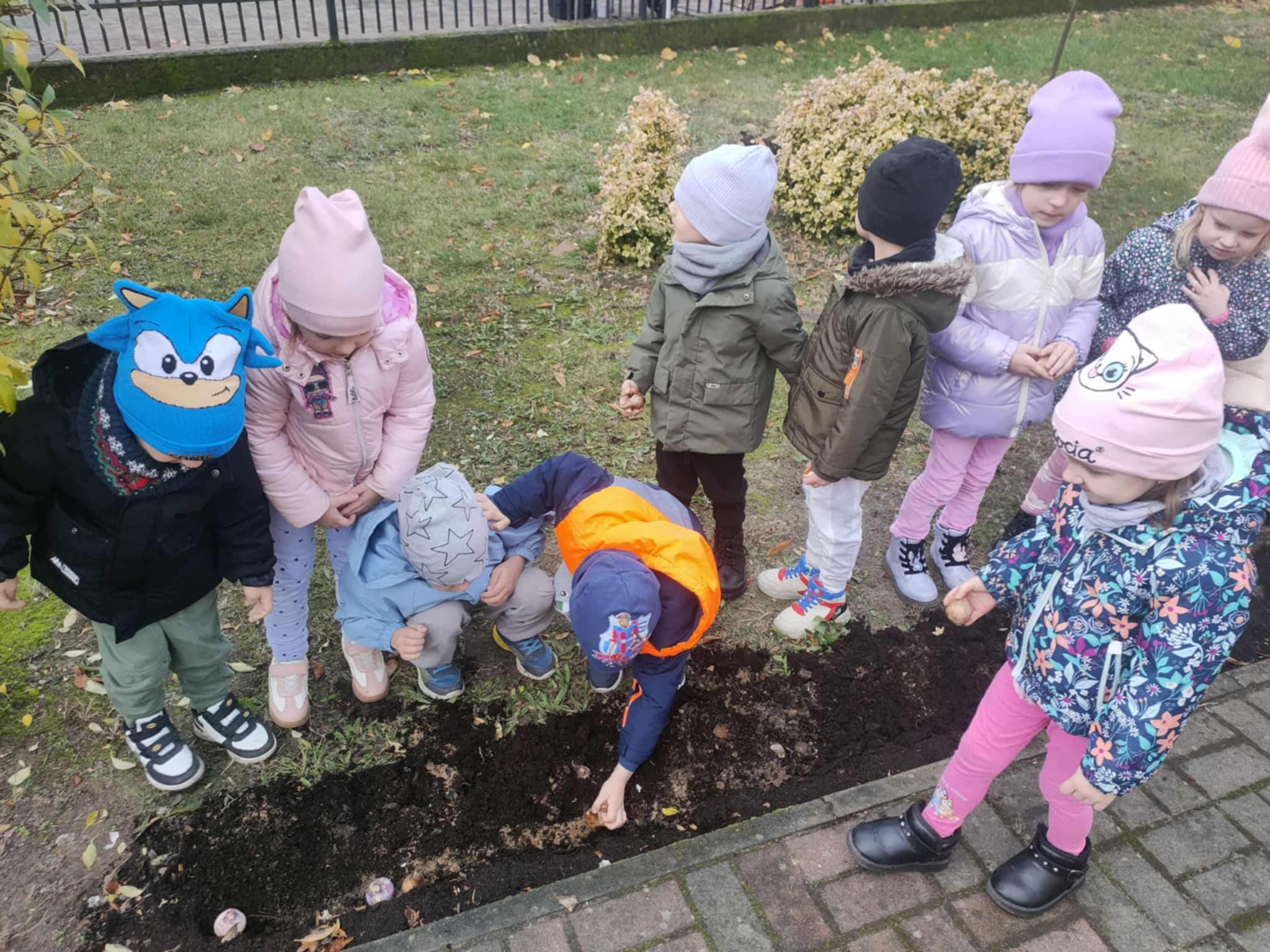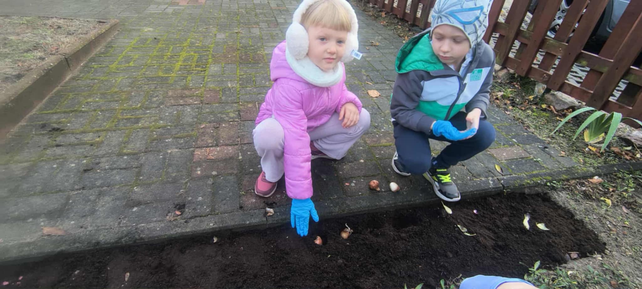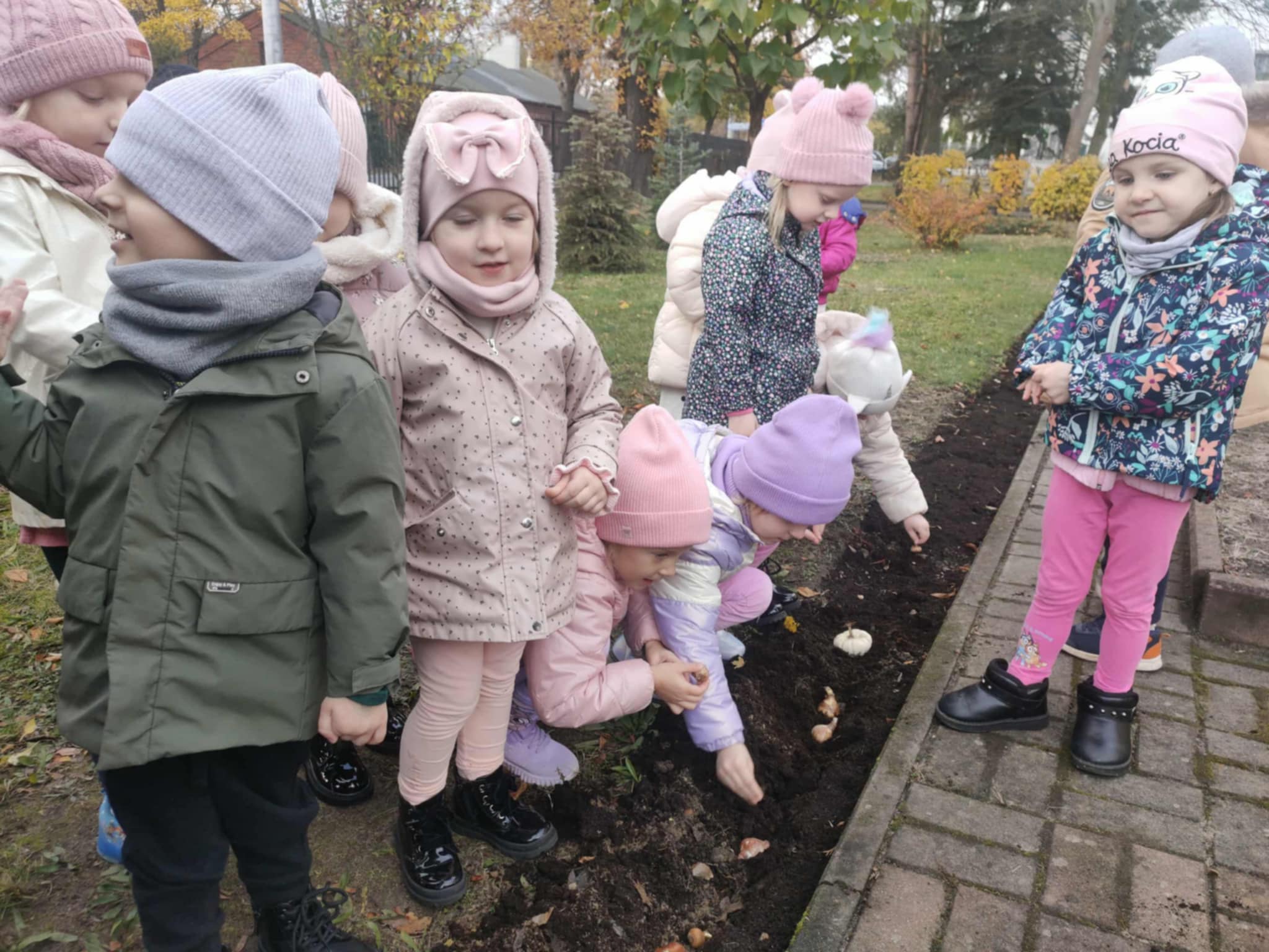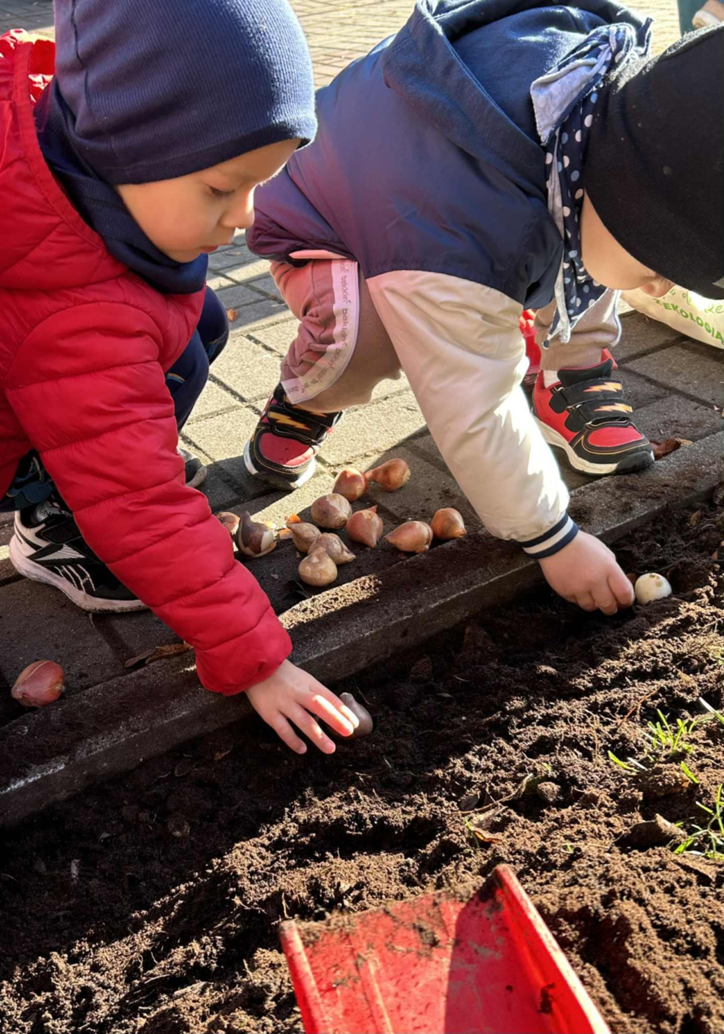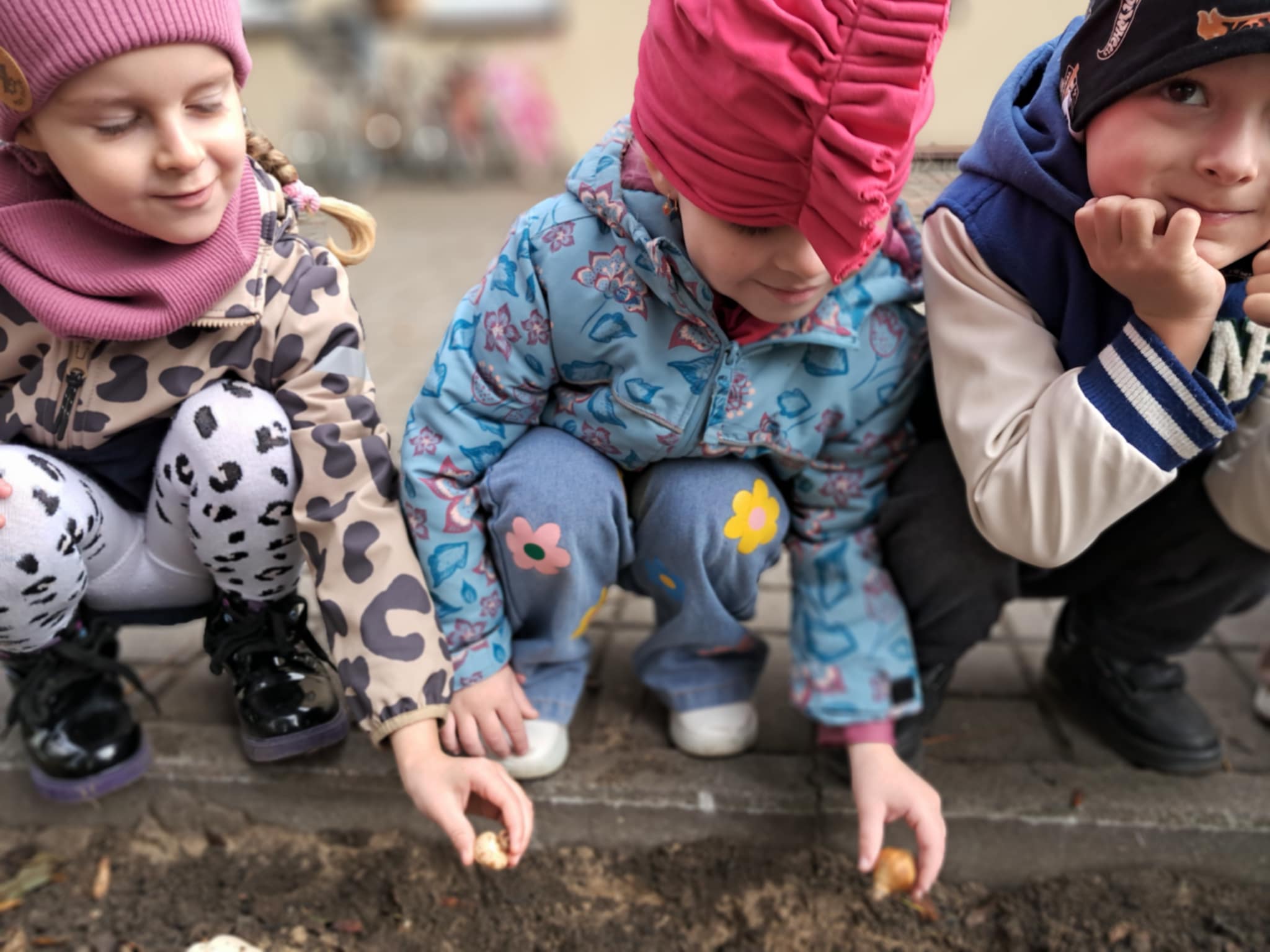 Jesienią przedszkolaki wzięły się do pracy — sadziły cebulki tulipanów, żonkili i krokusów. Teraz ogródek odpoczywa pod zimową kołderką, a wiosną zakwitnie kolorami! Dzieci już nie mogą się doczekać, by zobaczyć efekty swojej pracy.