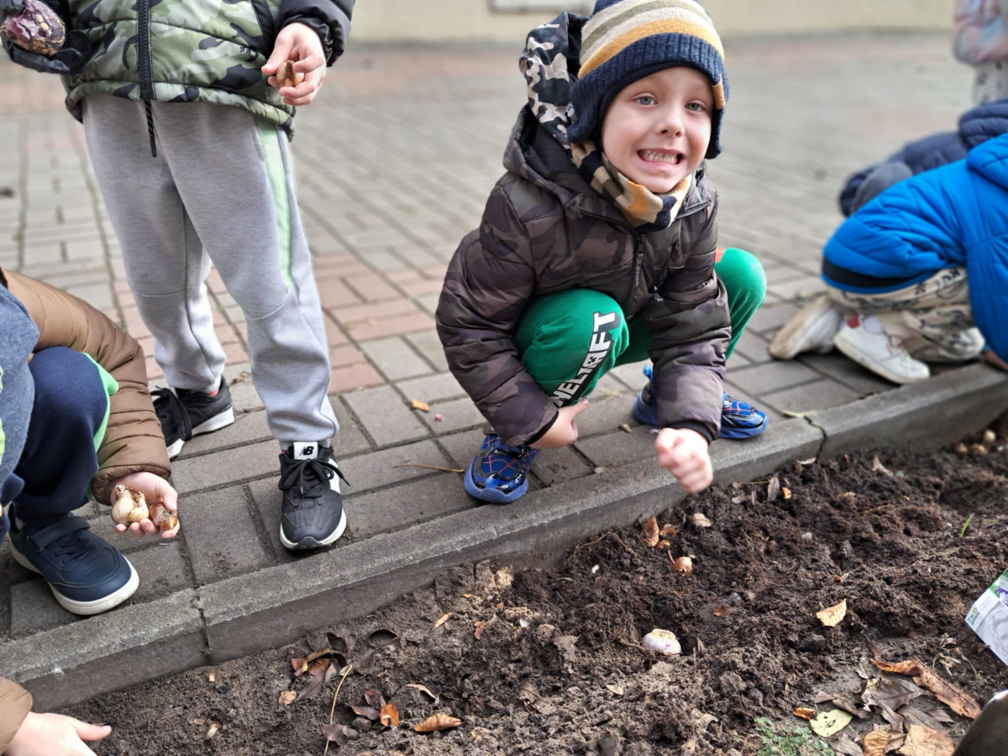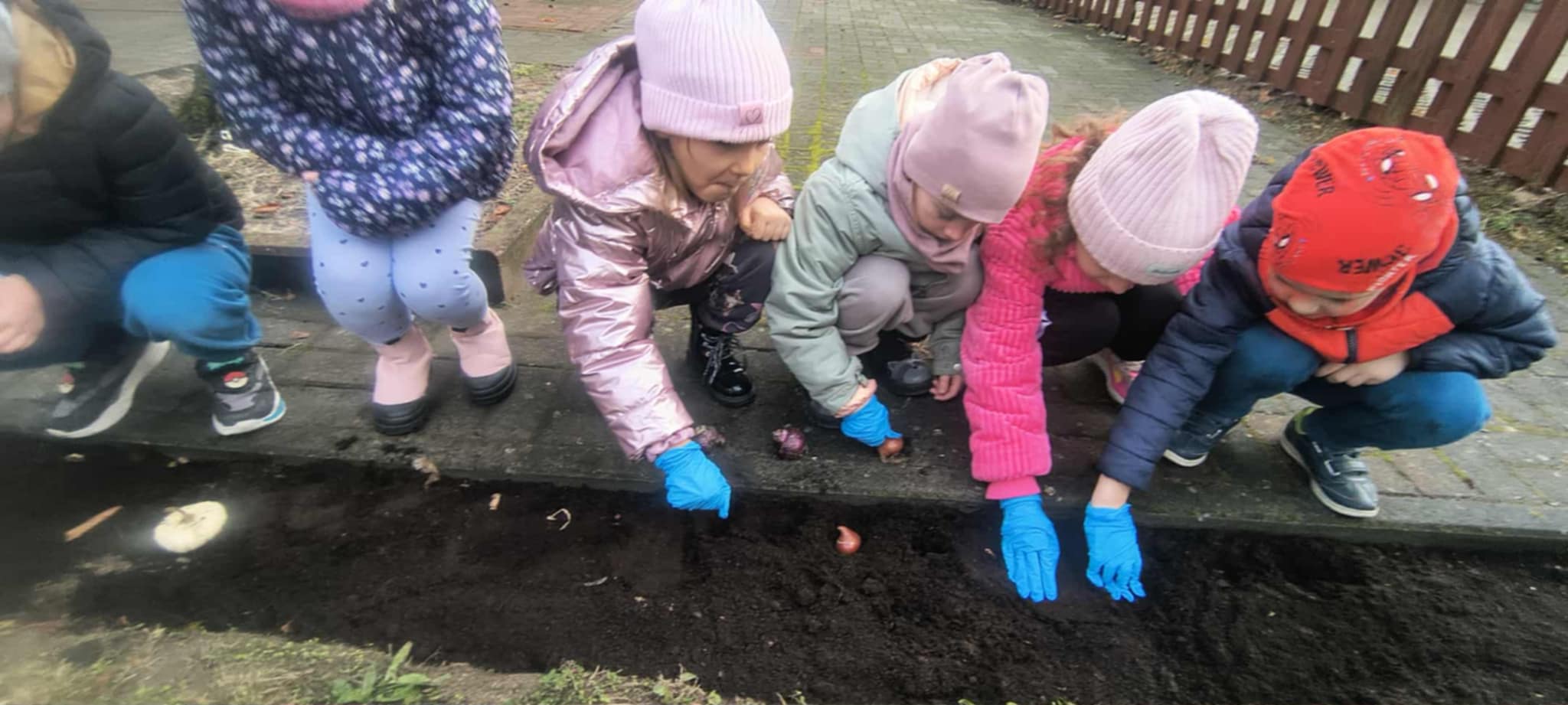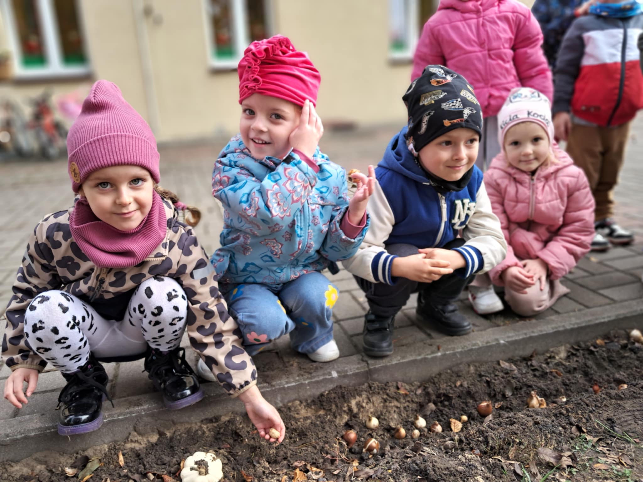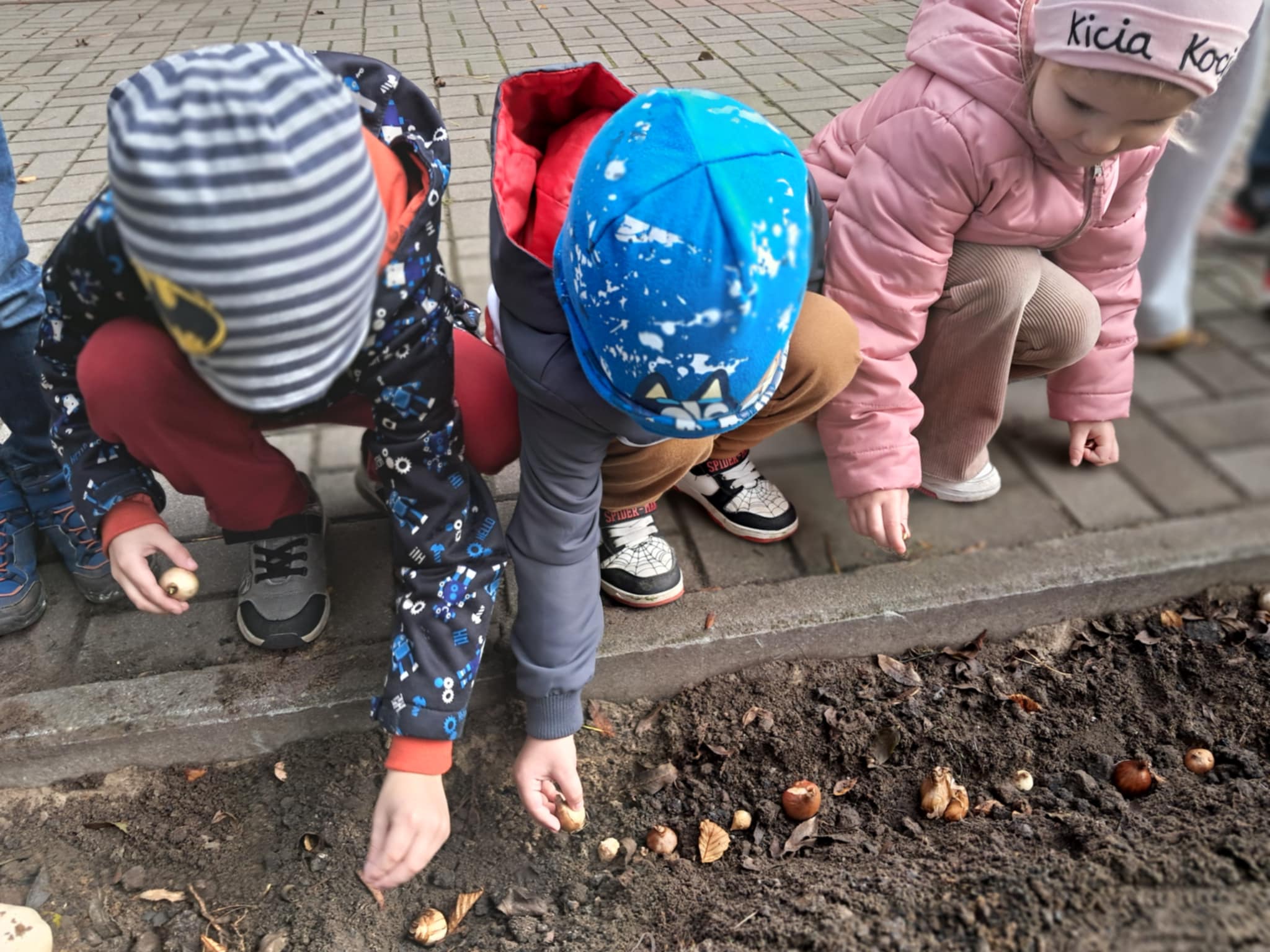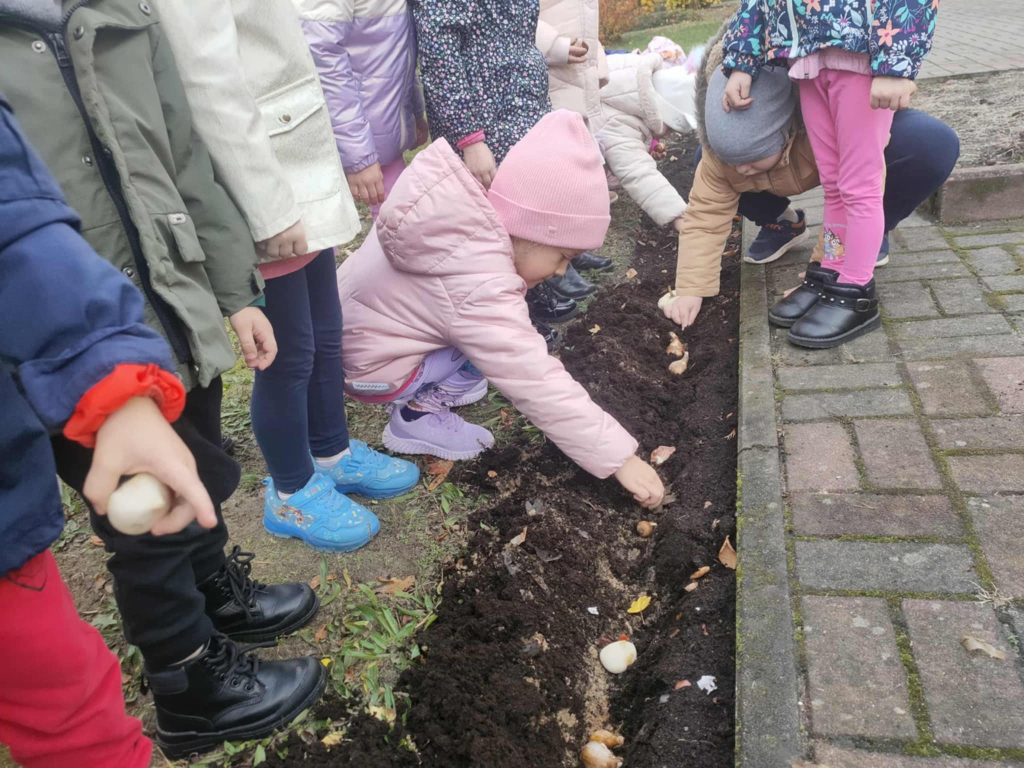 Jesienią przedszkolaki wzięły się do pracy — sadziły cebulki tulipanów, żonkili i krokusów. Teraz ogródek odpoczywa pod zimową kołderką, a wiosną zakwitnie kolorami! Dzieci już nie mogą się doczekać, by zobaczyć efekty swojej pracy.