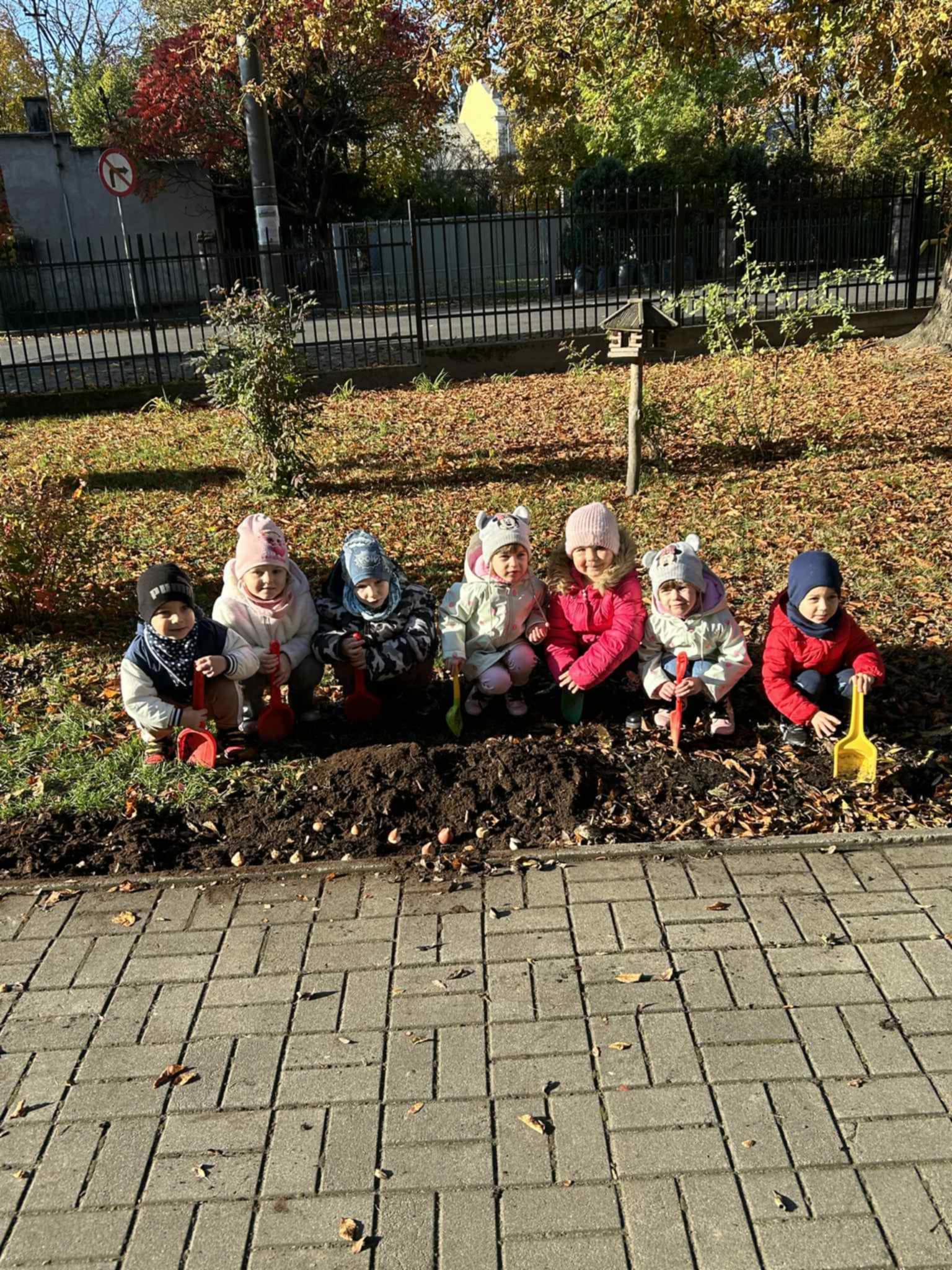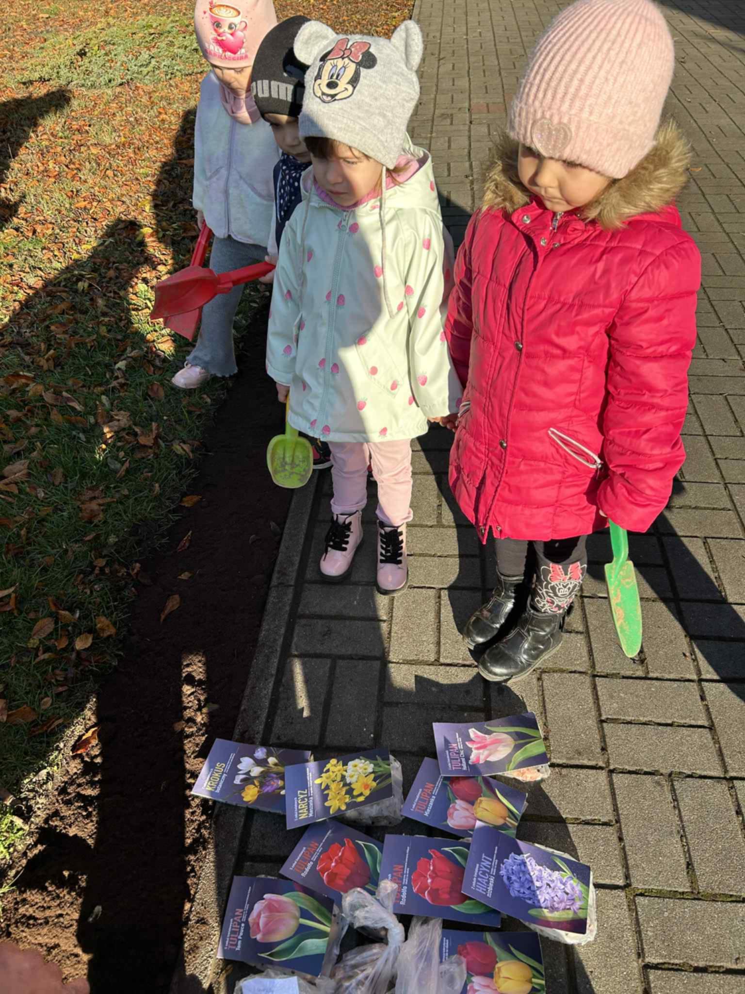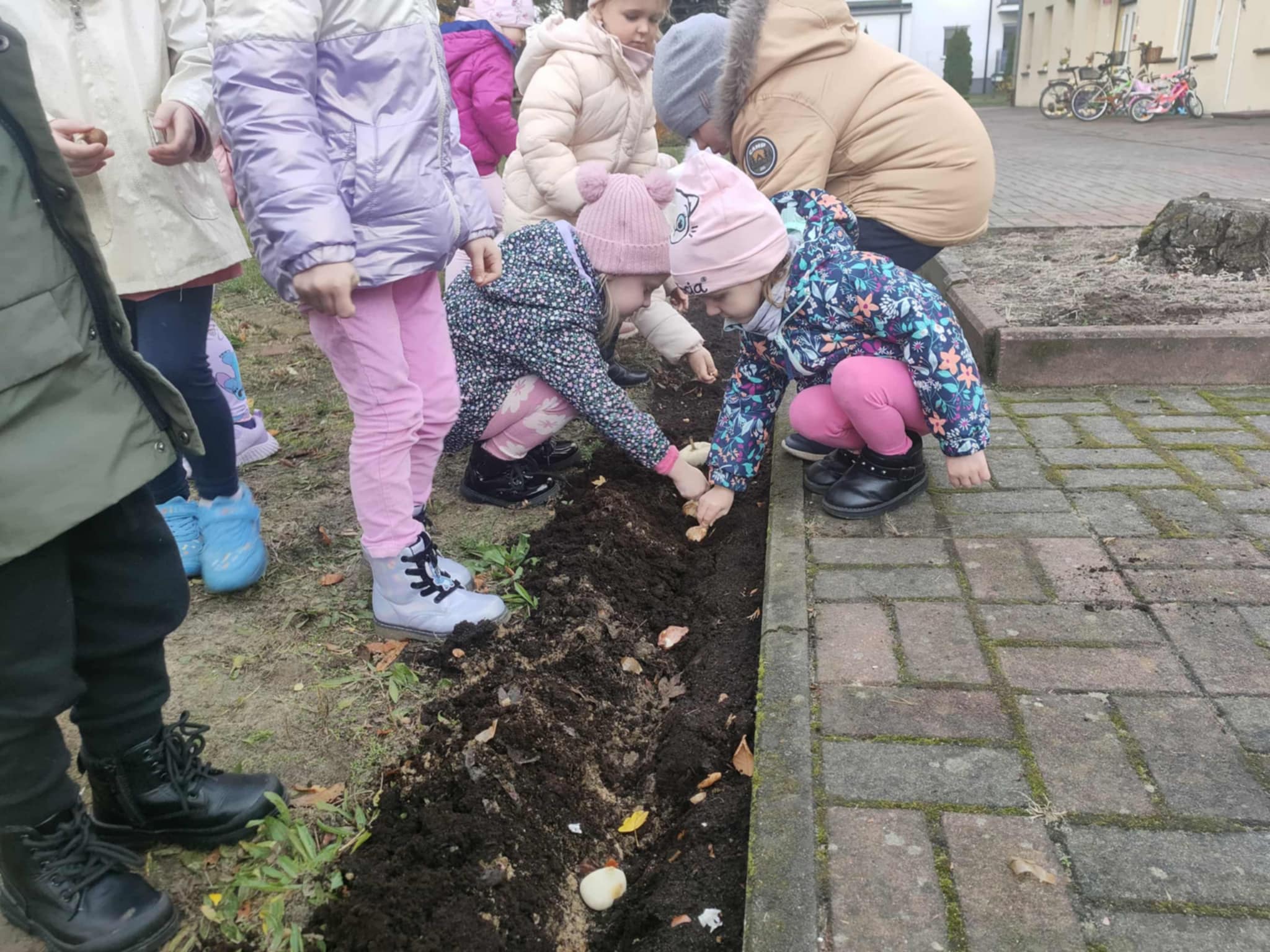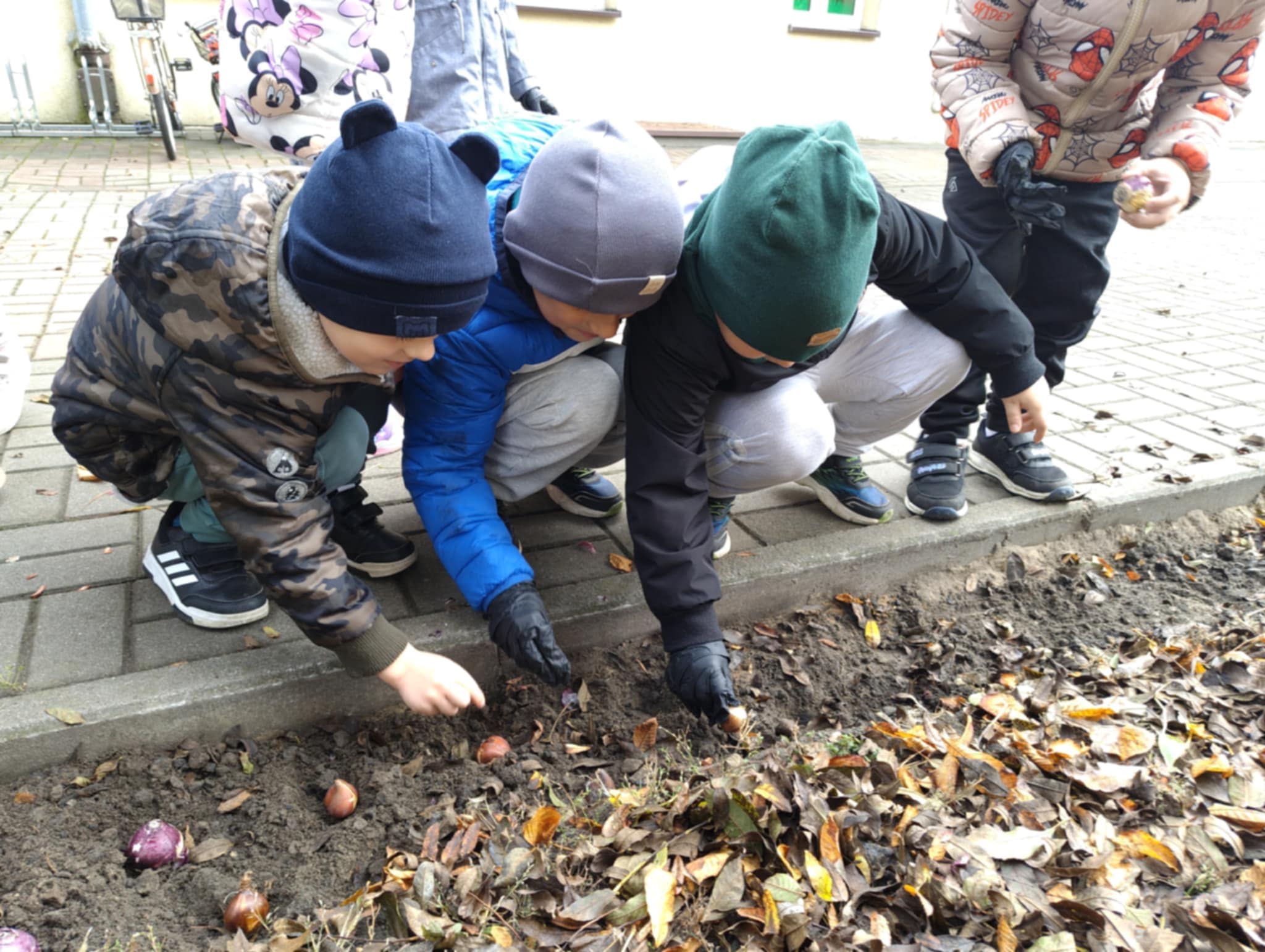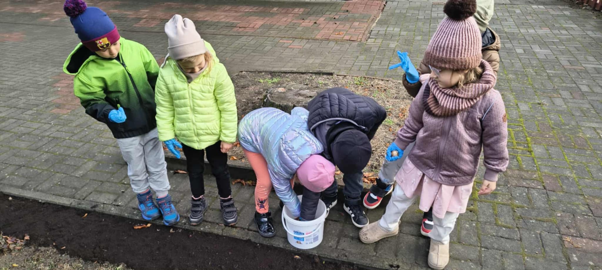 Jesienią przedszkolaki wzięły się do pracy — sadziły cebulki tulipanów, żonkili i krokusów. Teraz ogródek odpoczywa pod zimową kołderką, a wiosną zakwitnie kolorami! Dzieci już nie mogą się doczekać, by zobaczyć efekty swojej pracy.