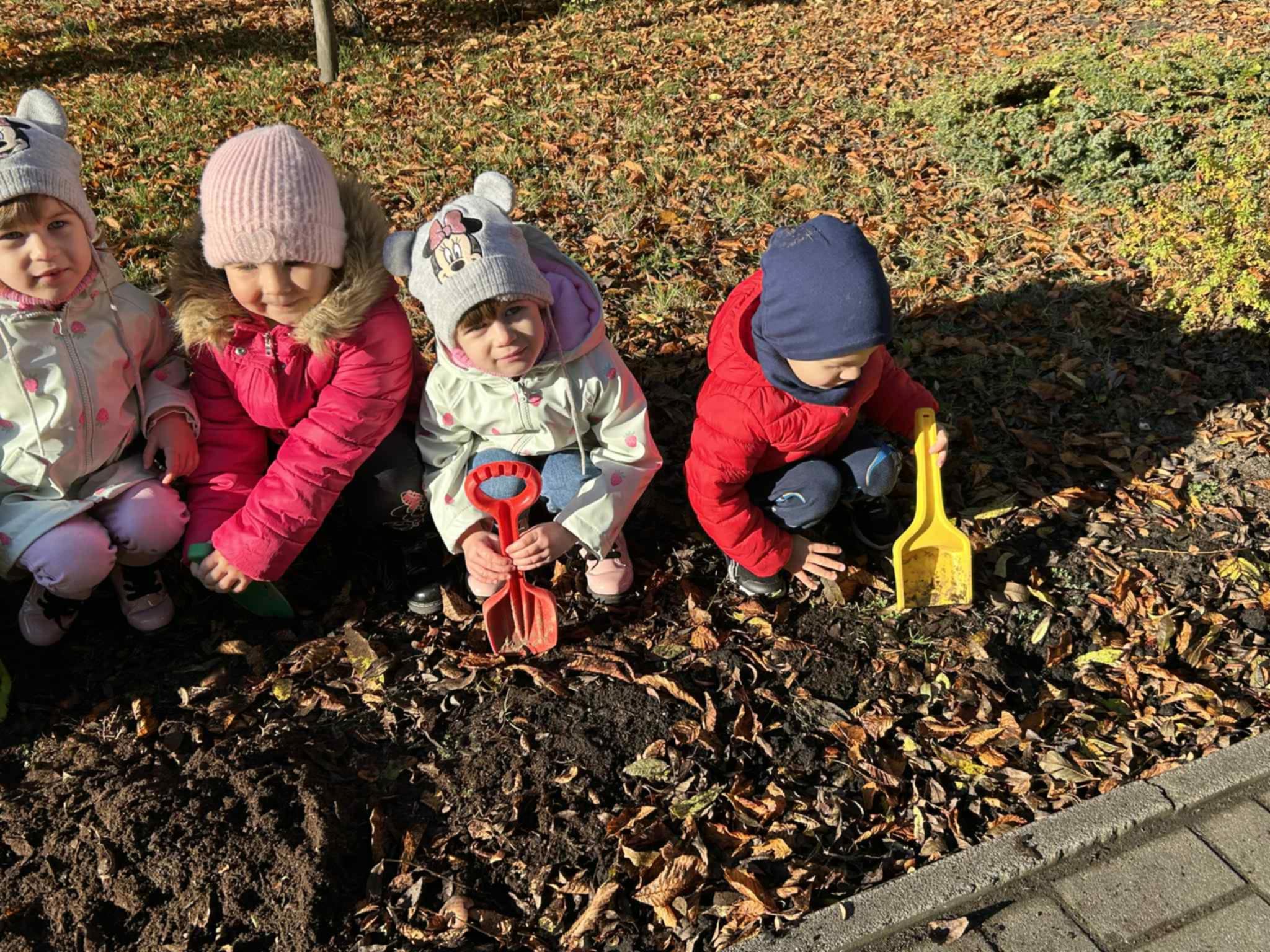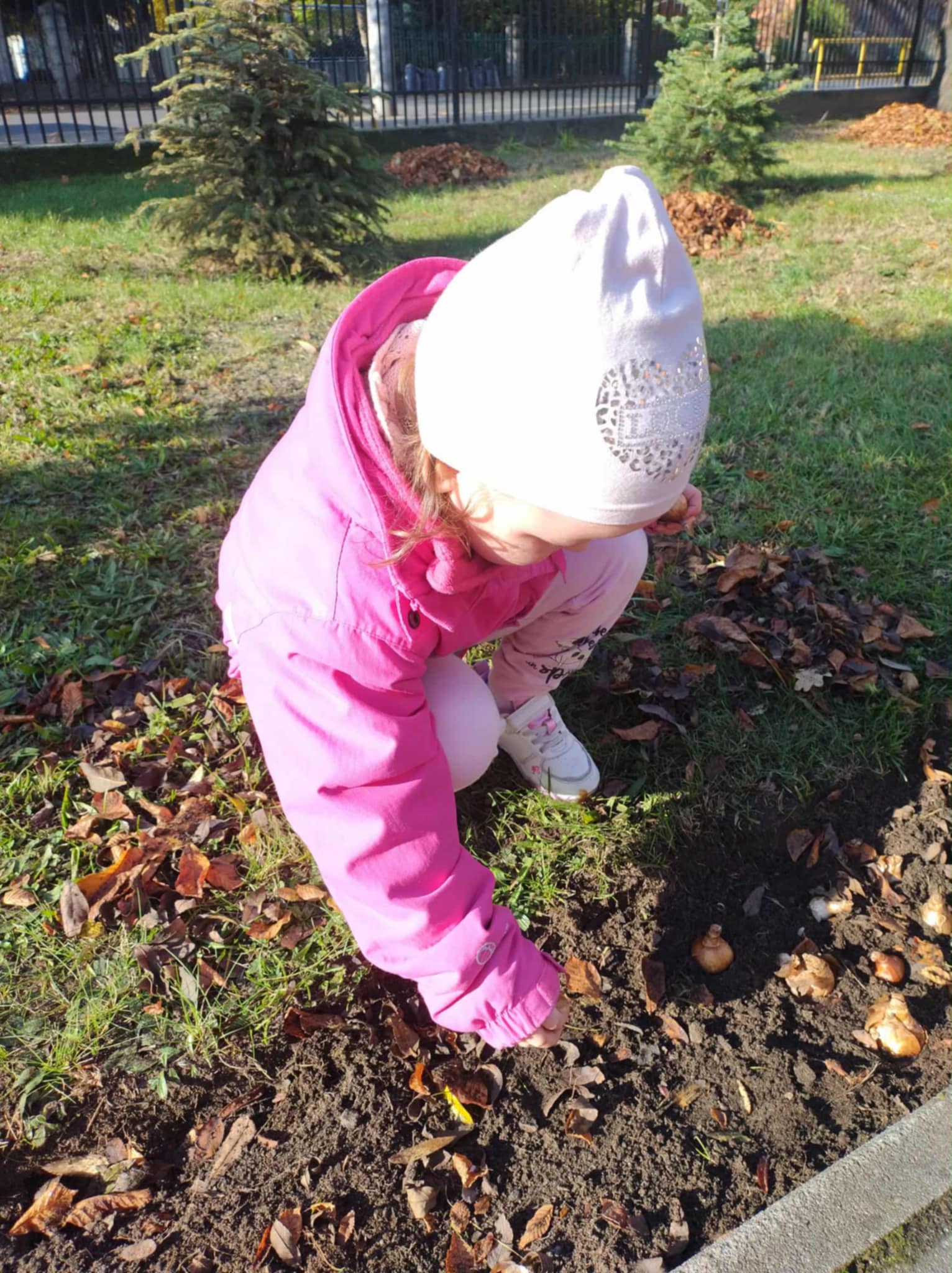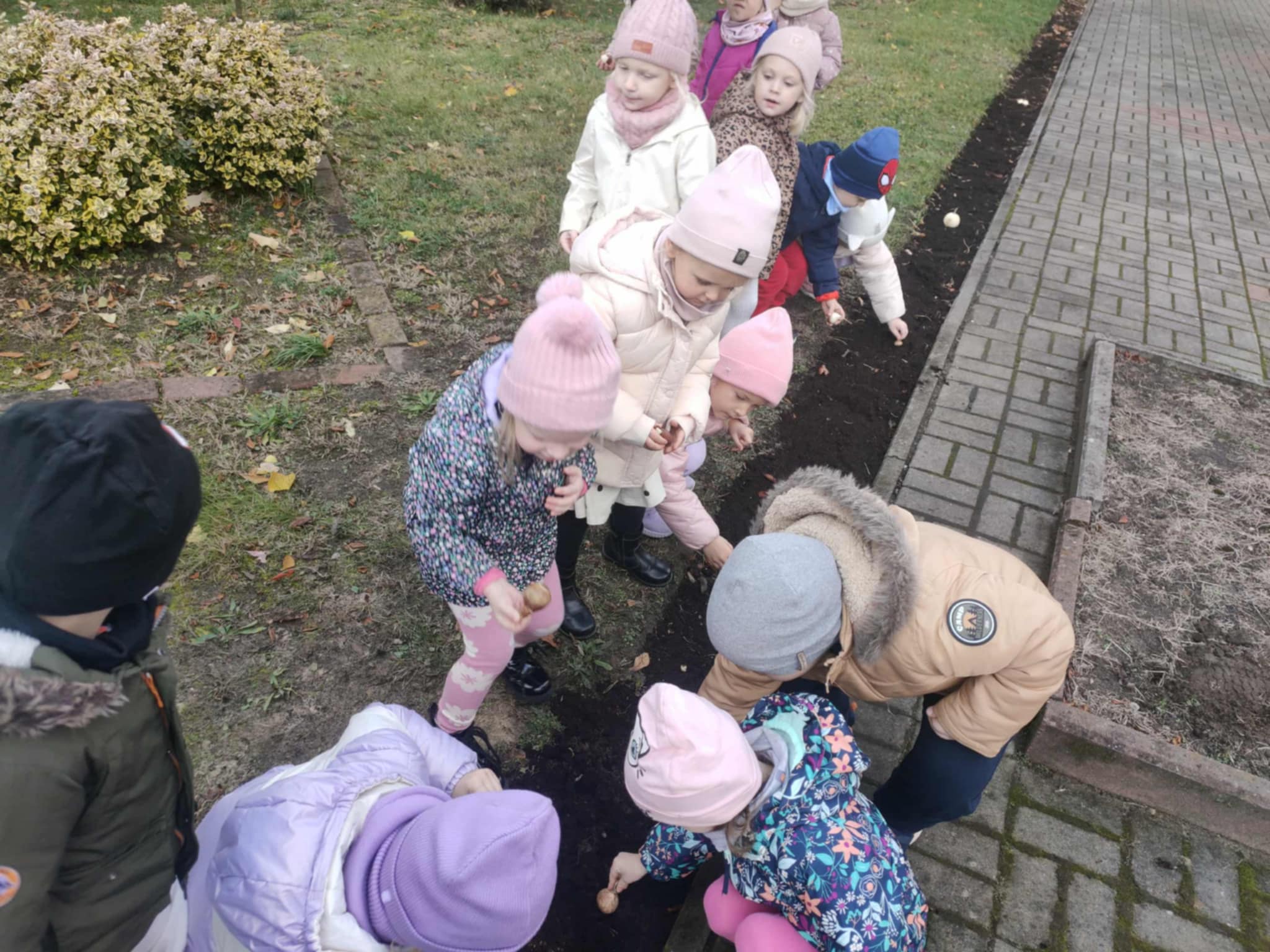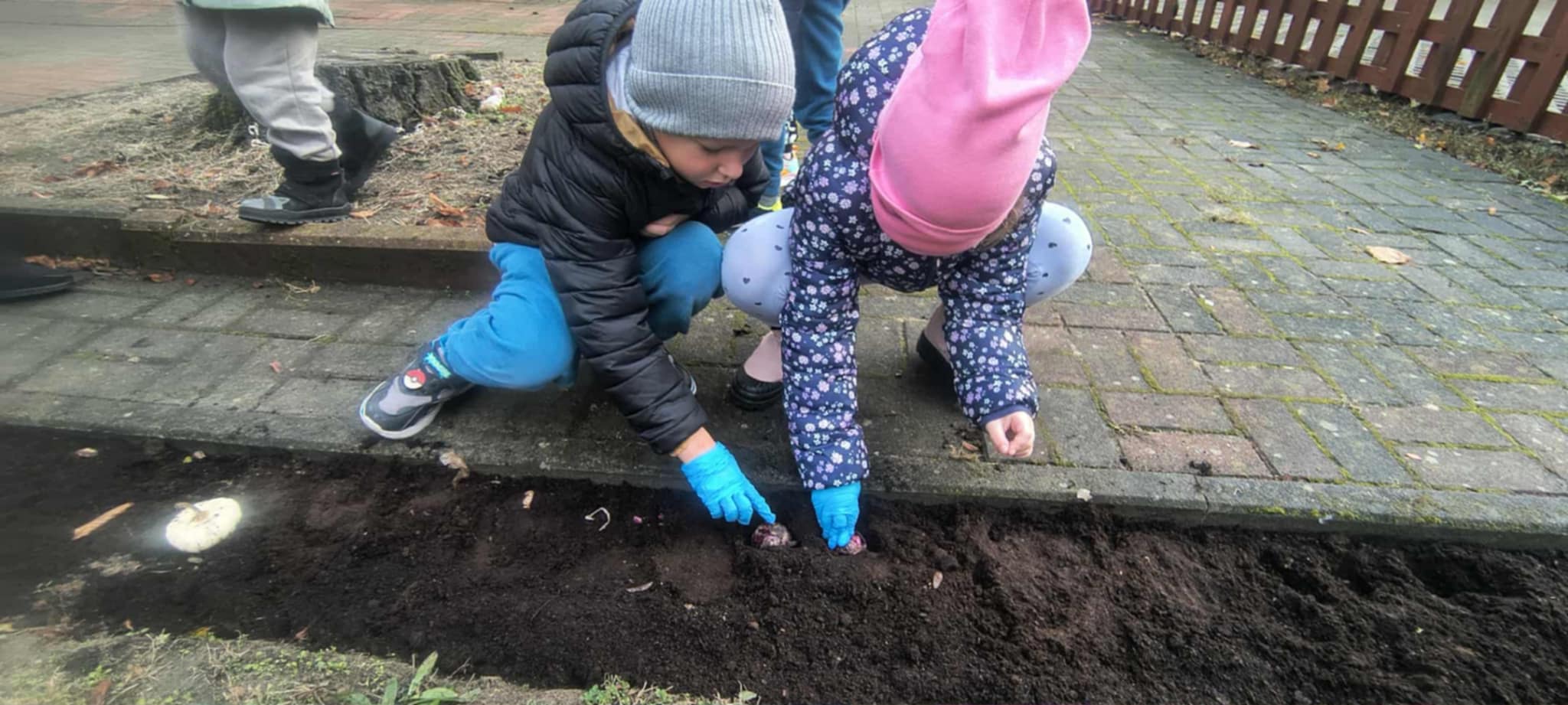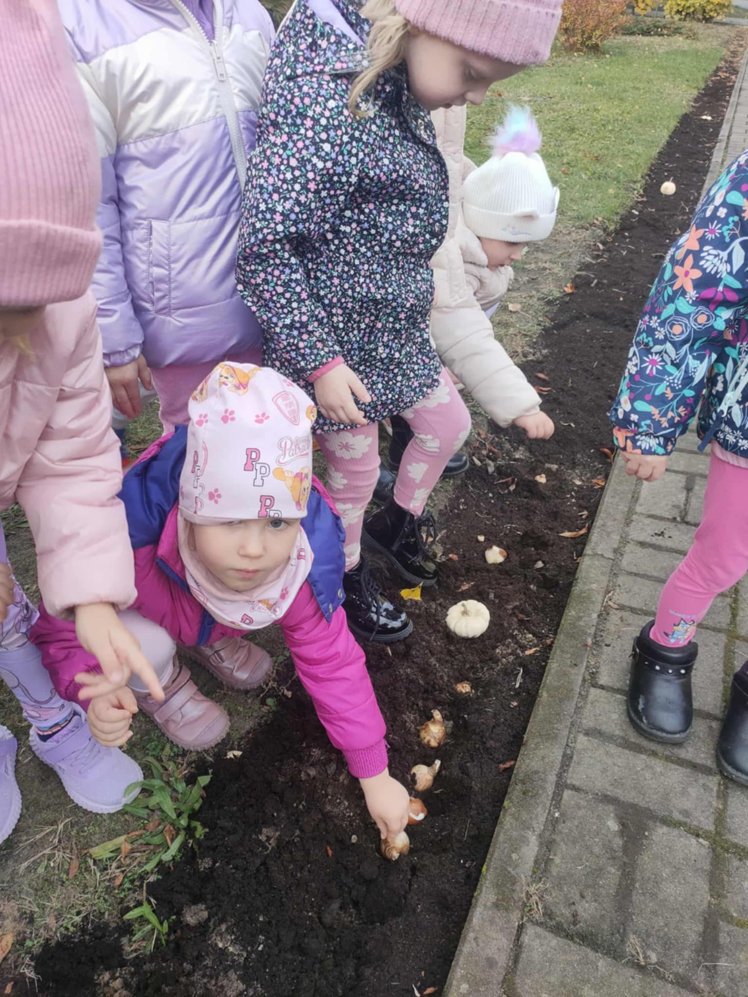 Jesienią przedszkolaki wzięły się do pracy — sadziły cebulki tulipanów, żonkili i krokusów. Teraz ogródek odpoczywa pod zimową kołderką, a wiosną zakwitnie kolorami! Dzieci już nie mogą się doczekać, by zobaczyć efekty swojej pracy.
