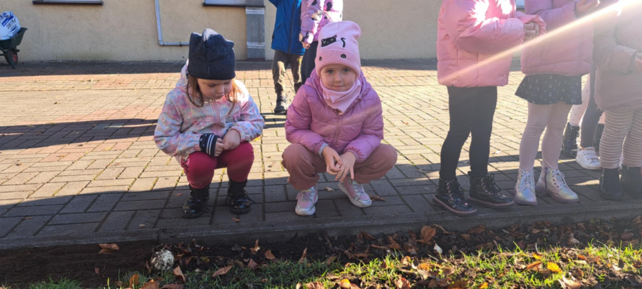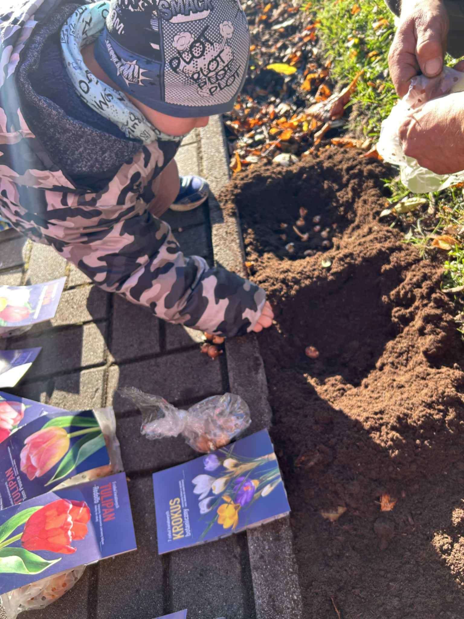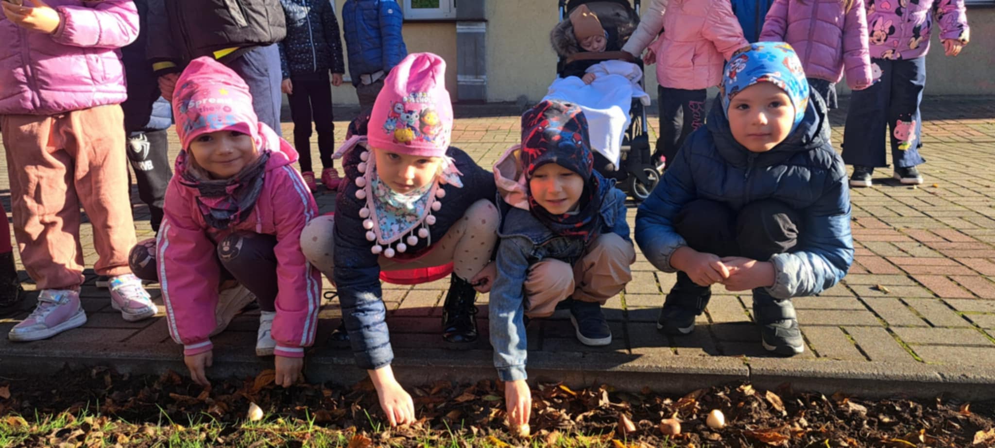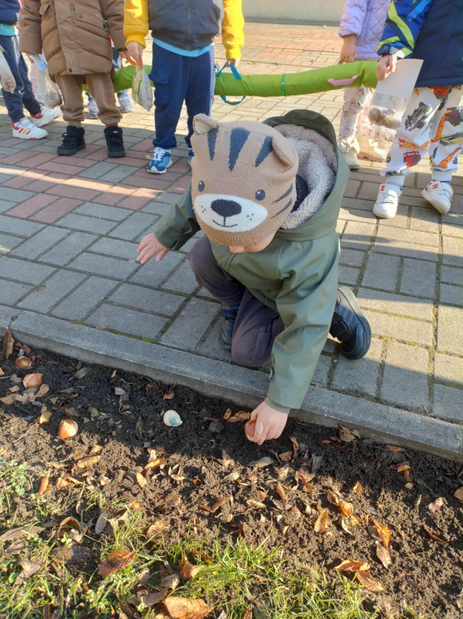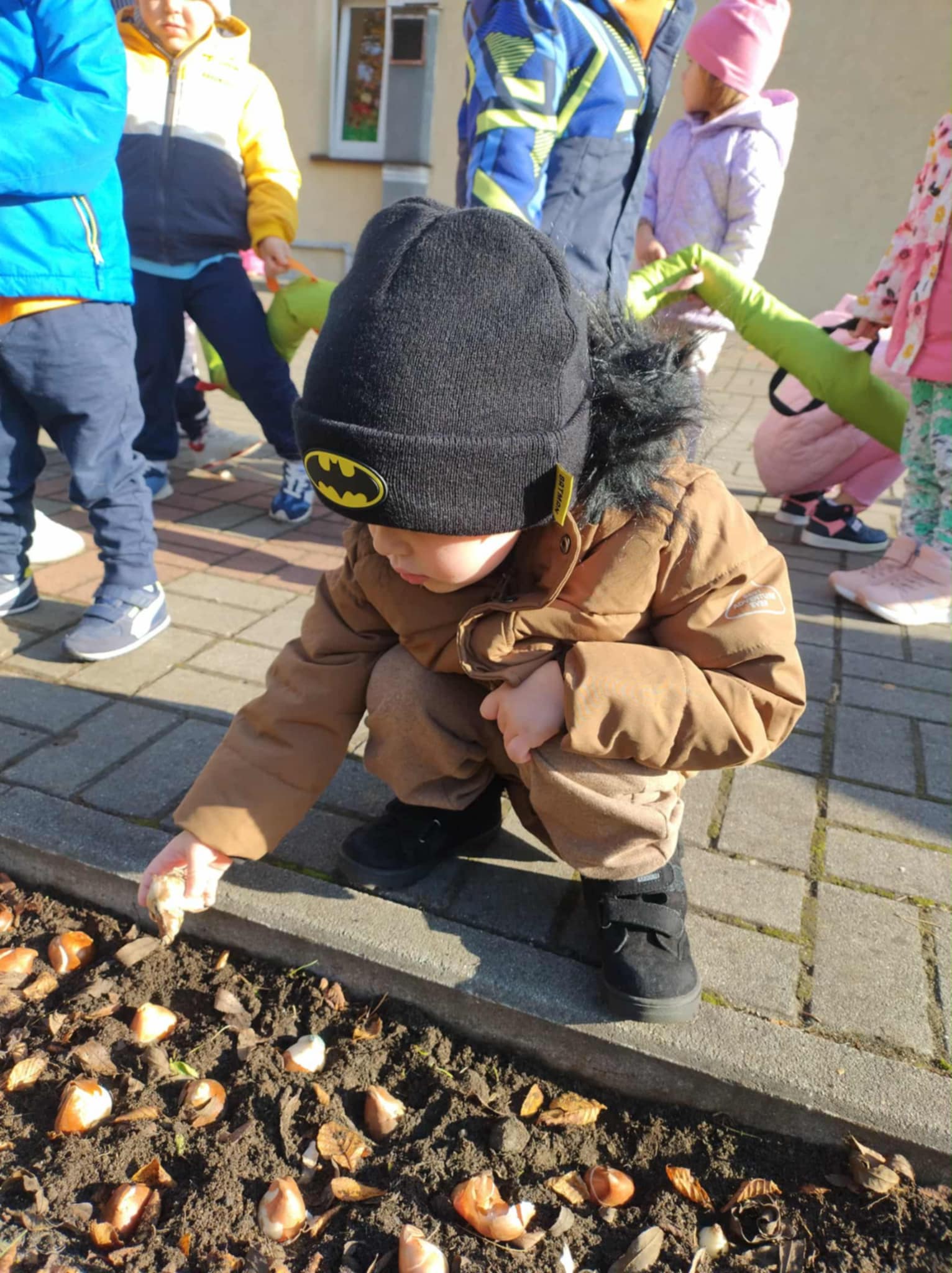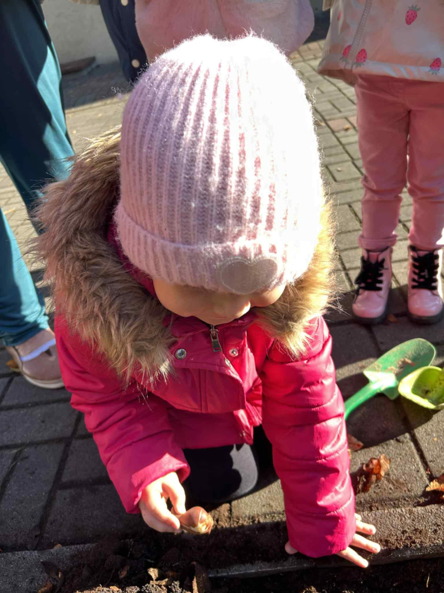 Jesienią przedszkolaki wzięły się do pracy — sadziły cebulki tulipanów, żonkili i krokusów. Teraz ogródek odpoczywa pod zimową kołderką, a wiosną zakwitnie kolorami! Dzieci już nie mogą się doczekać, by zobaczyć efekty swojej pracy.