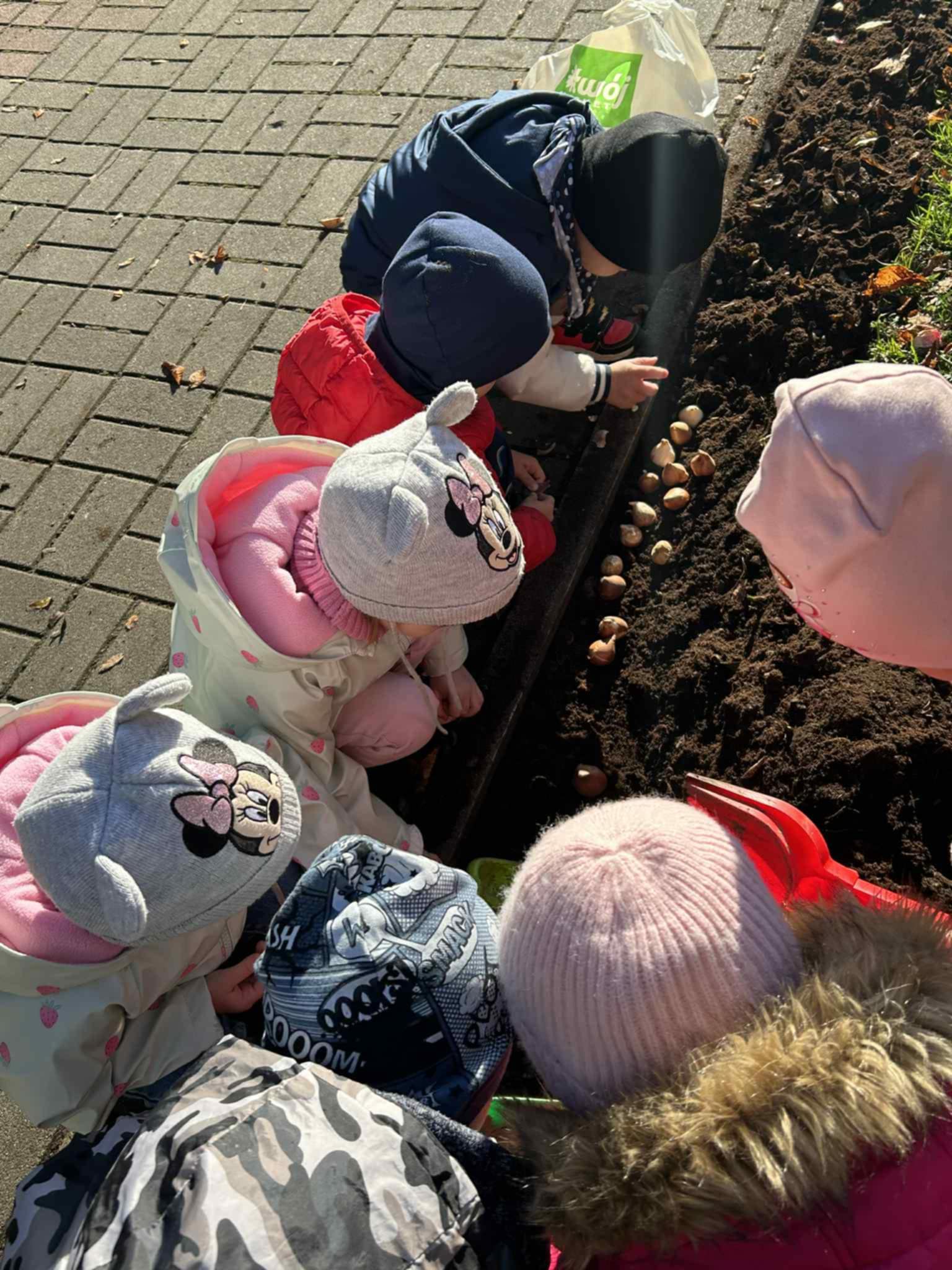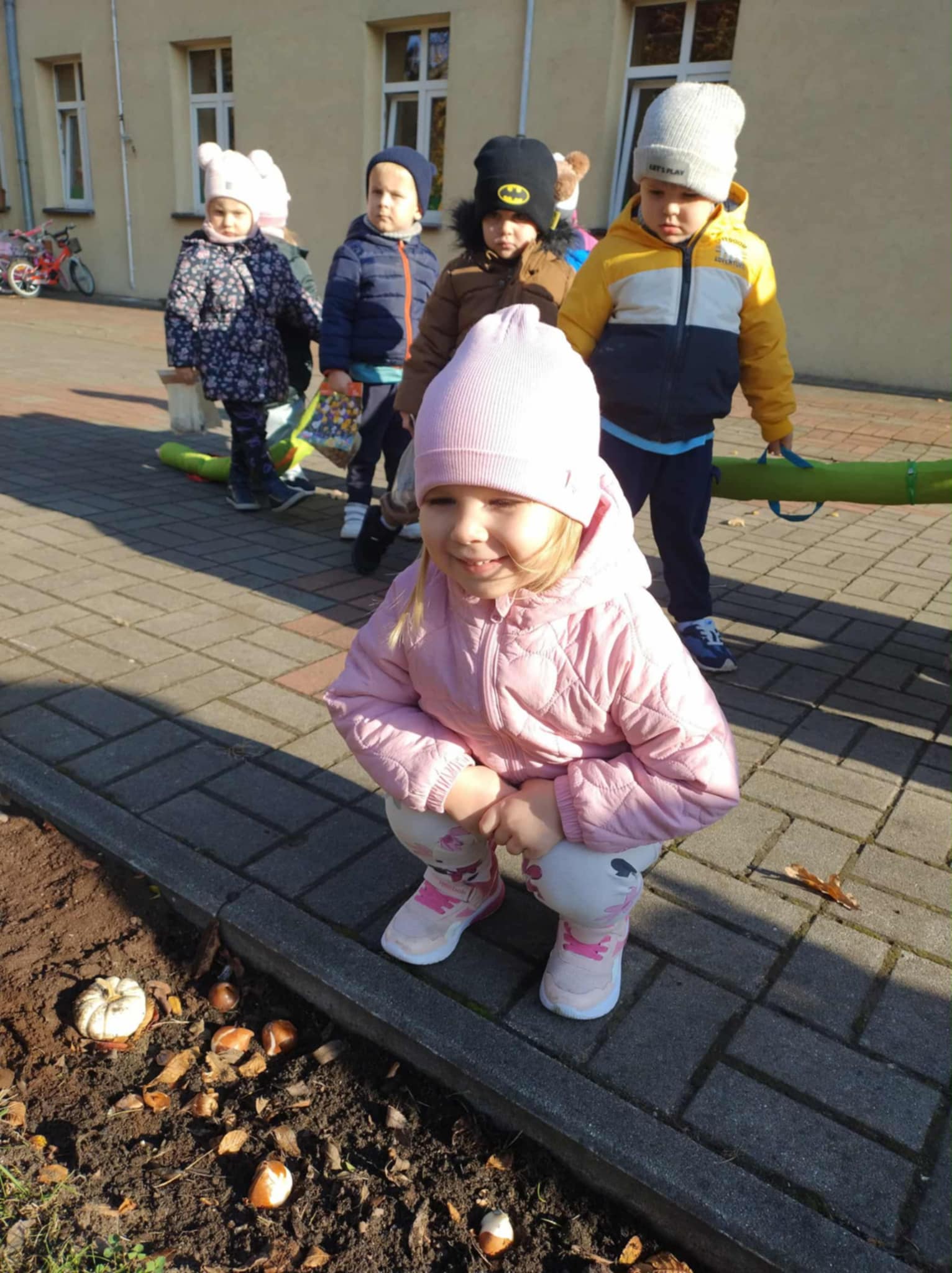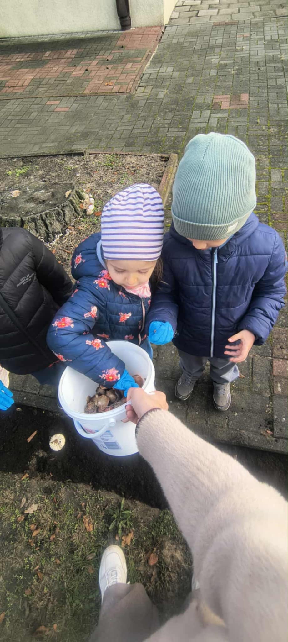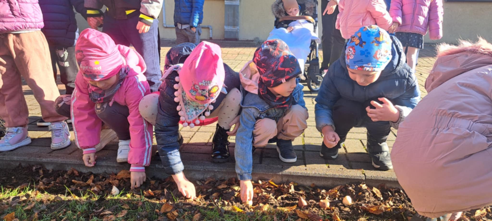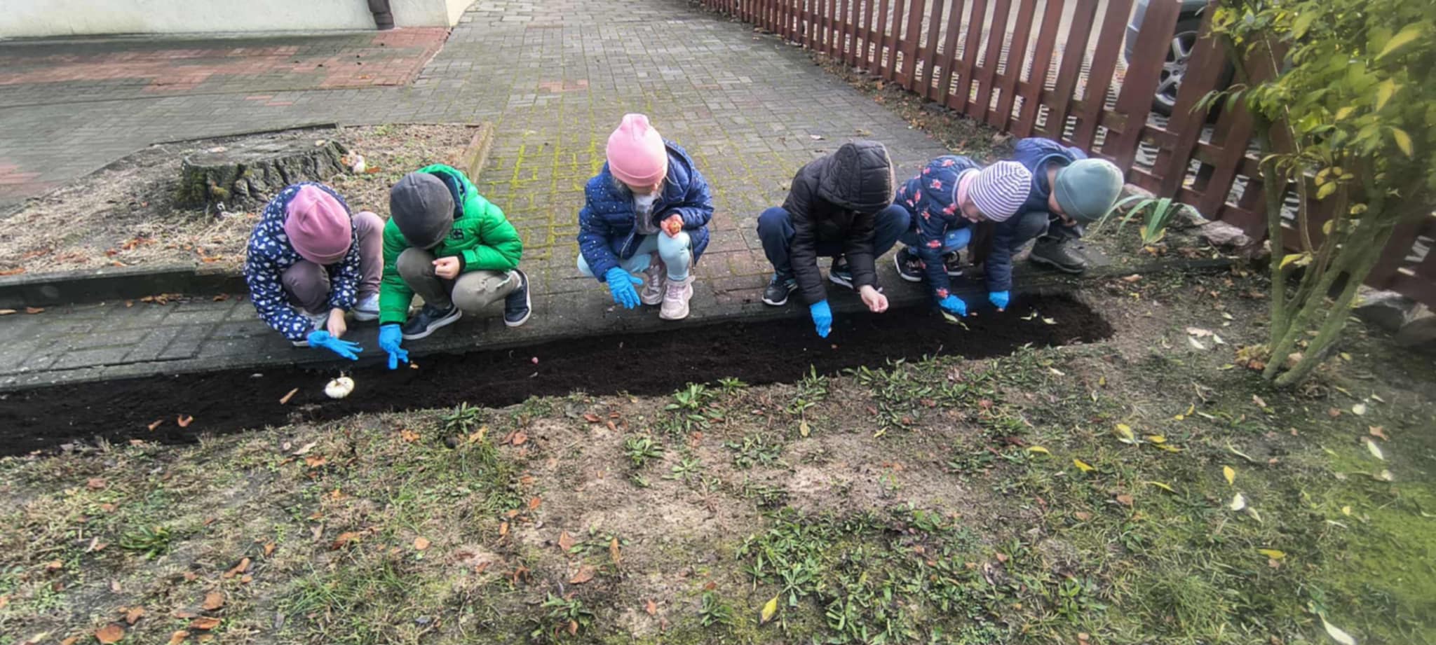 Jesienią przedszkolaki wzięły się do pracy — sadziły cebulki tulipanów, żonkili i krokusów. Teraz ogródek odpoczywa pod zimową kołderką, a wiosną zakwitnie kolorami! Dzieci już nie mogą się doczekać, by zobaczyć efekty swojej pracy.