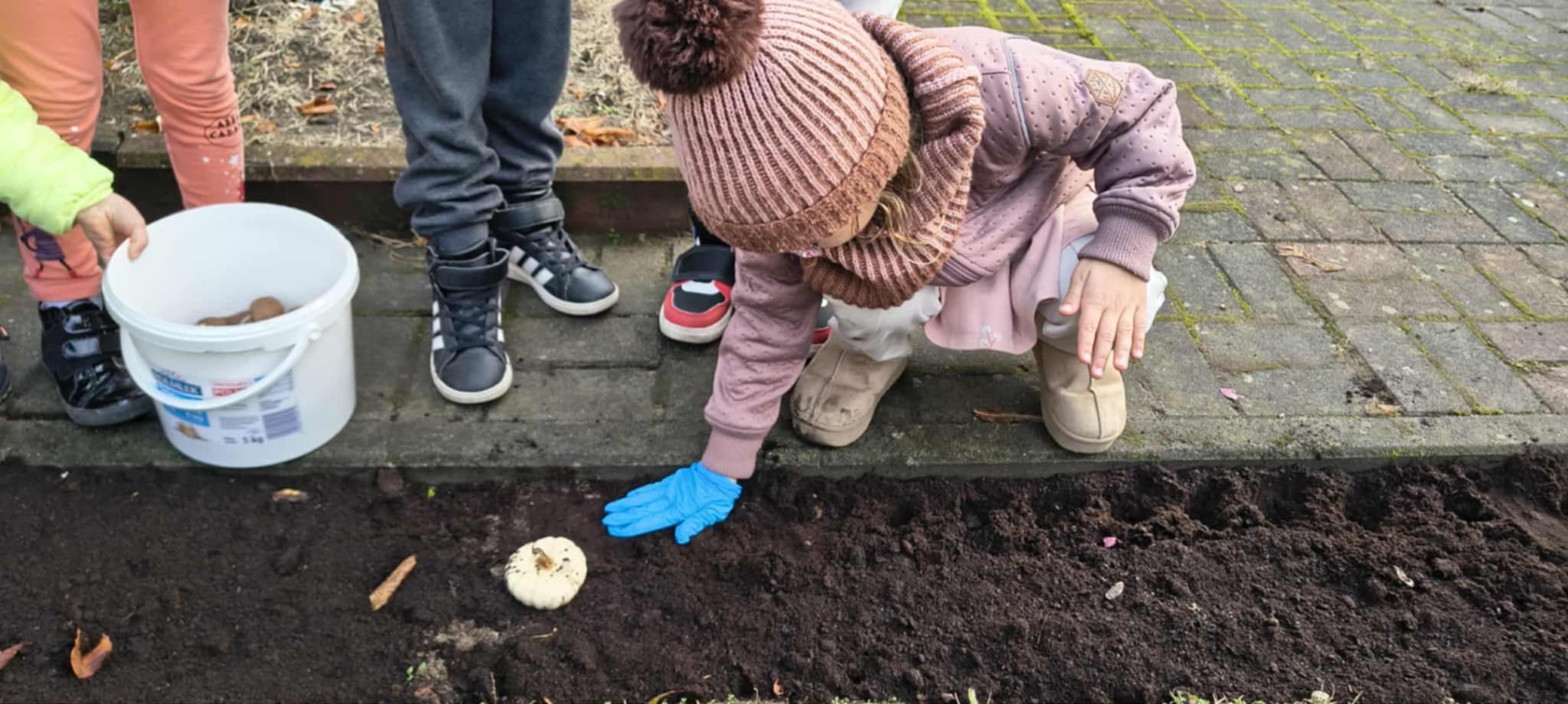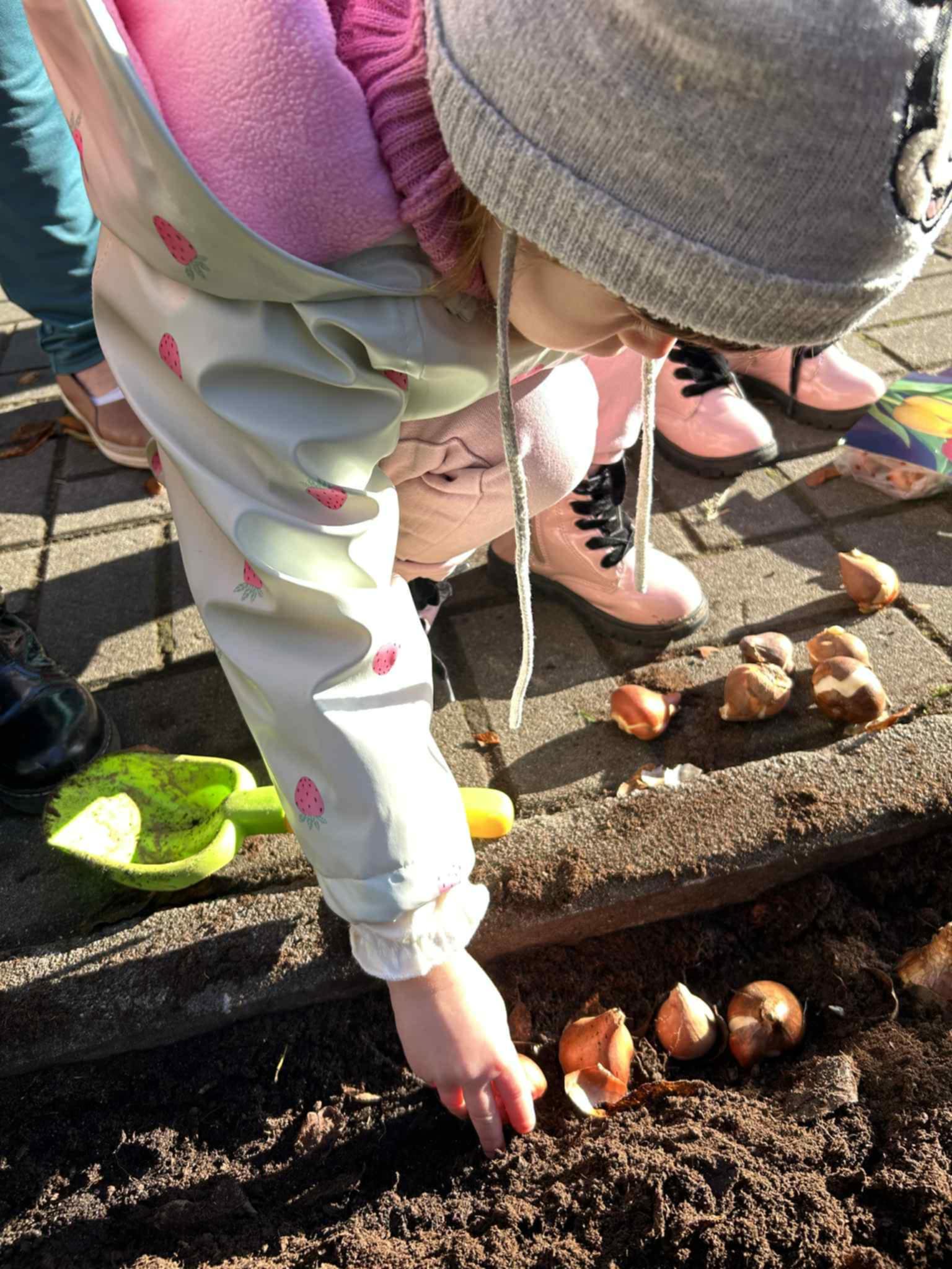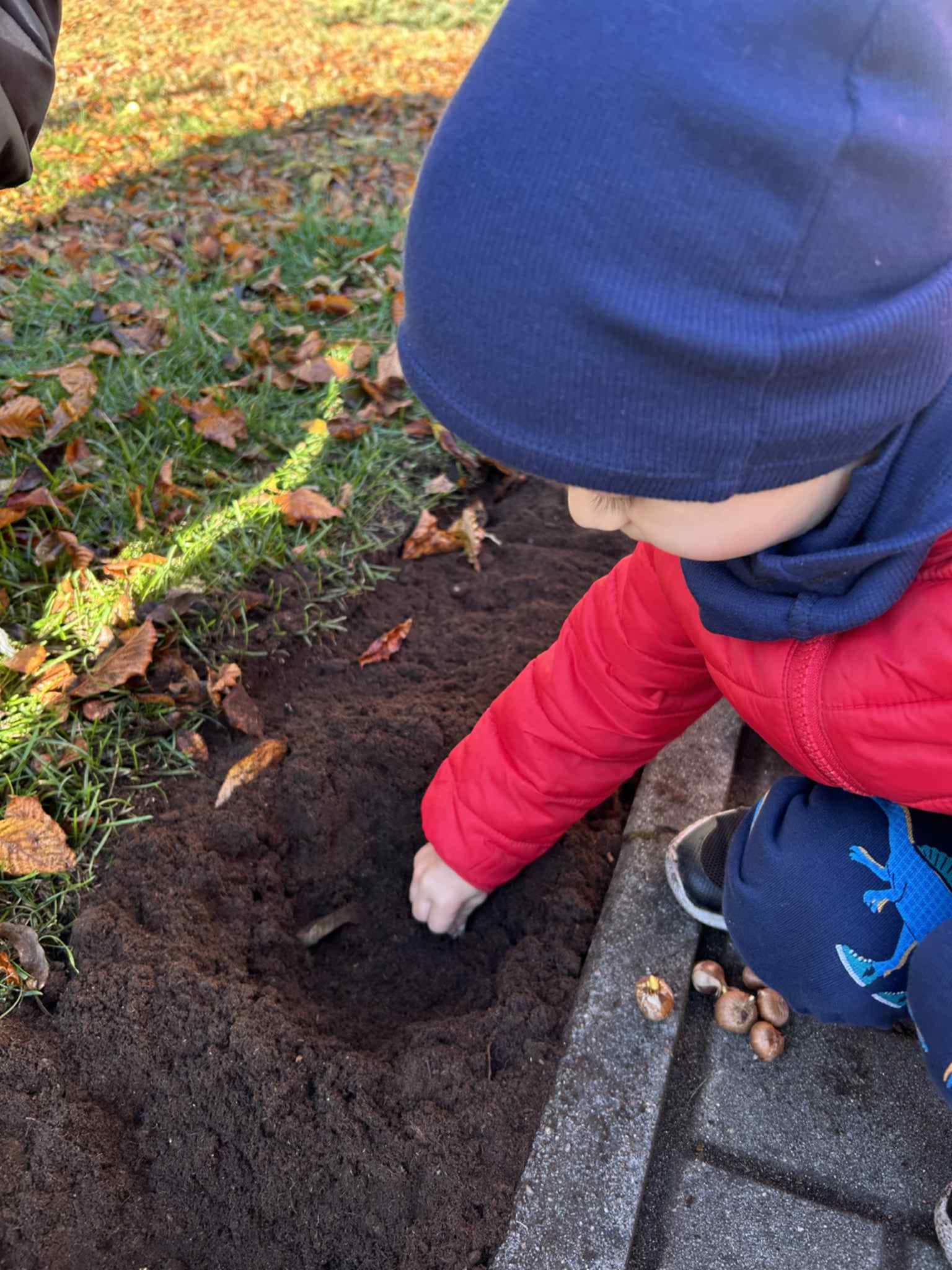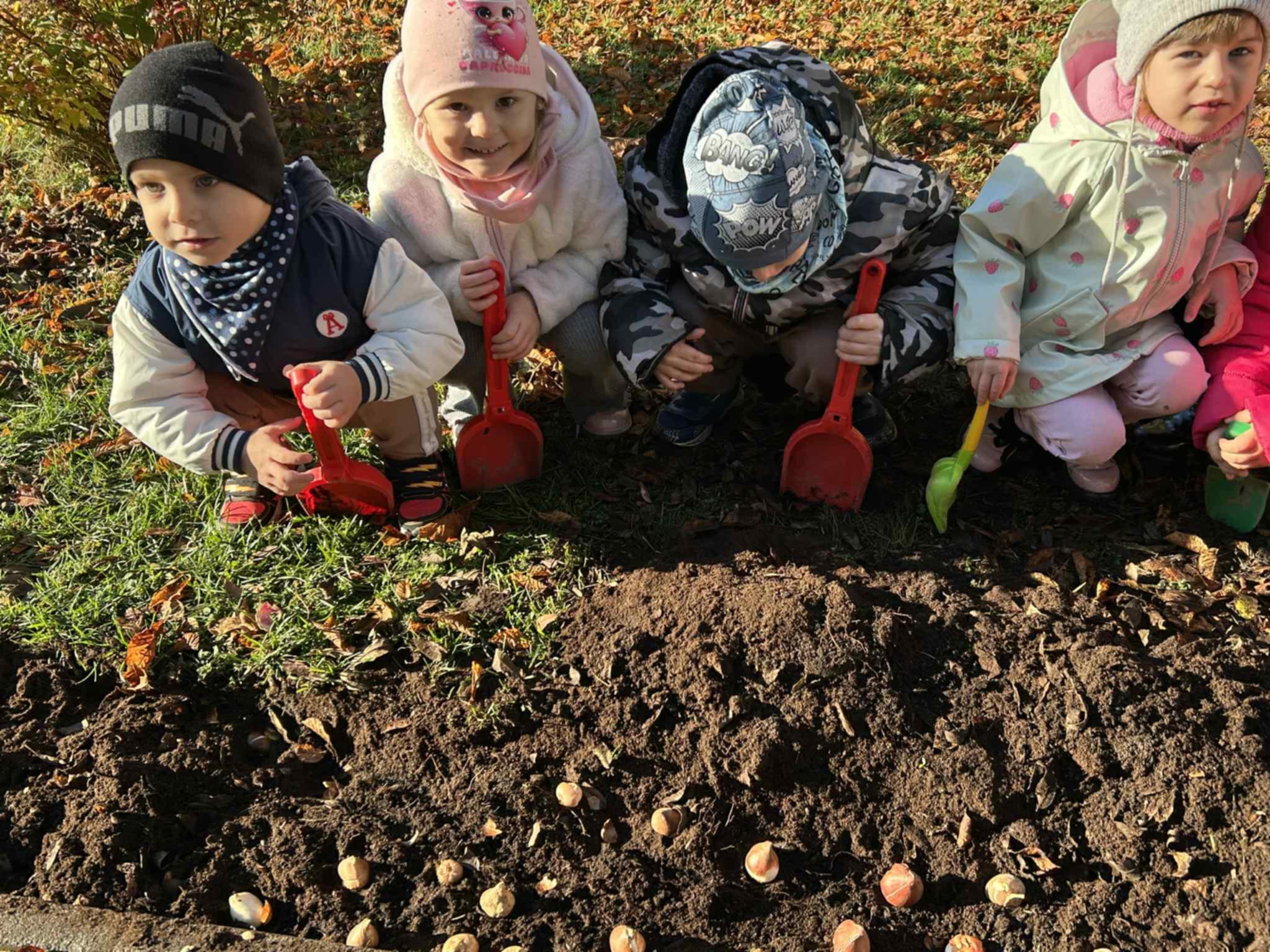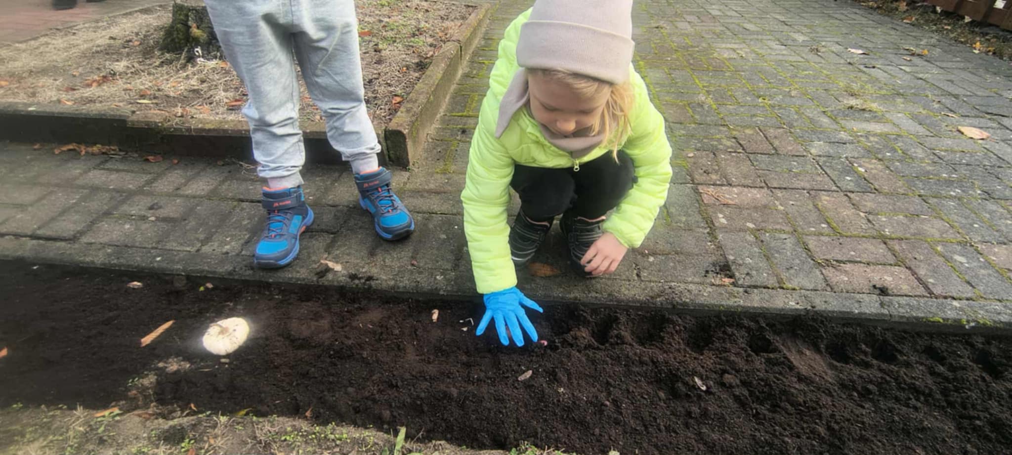 Jesienią przedszkolaki wzięły się do pracy — sadziły cebulki tulipanów, żonkili i krokusów. Teraz ogródek odpoczywa pod zimową kołderką, a wiosną zakwitnie kolorami! Dzieci już nie mogą się doczekać, by zobaczyć efekty swojej pracy.