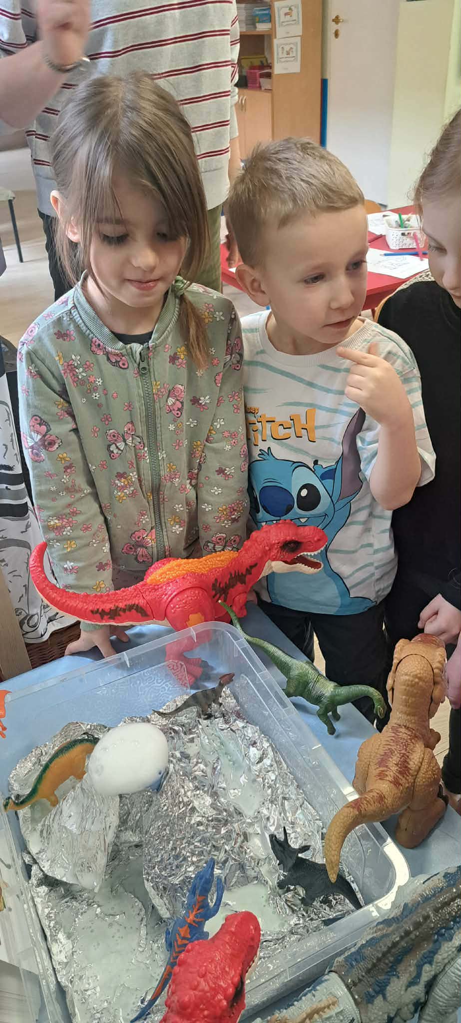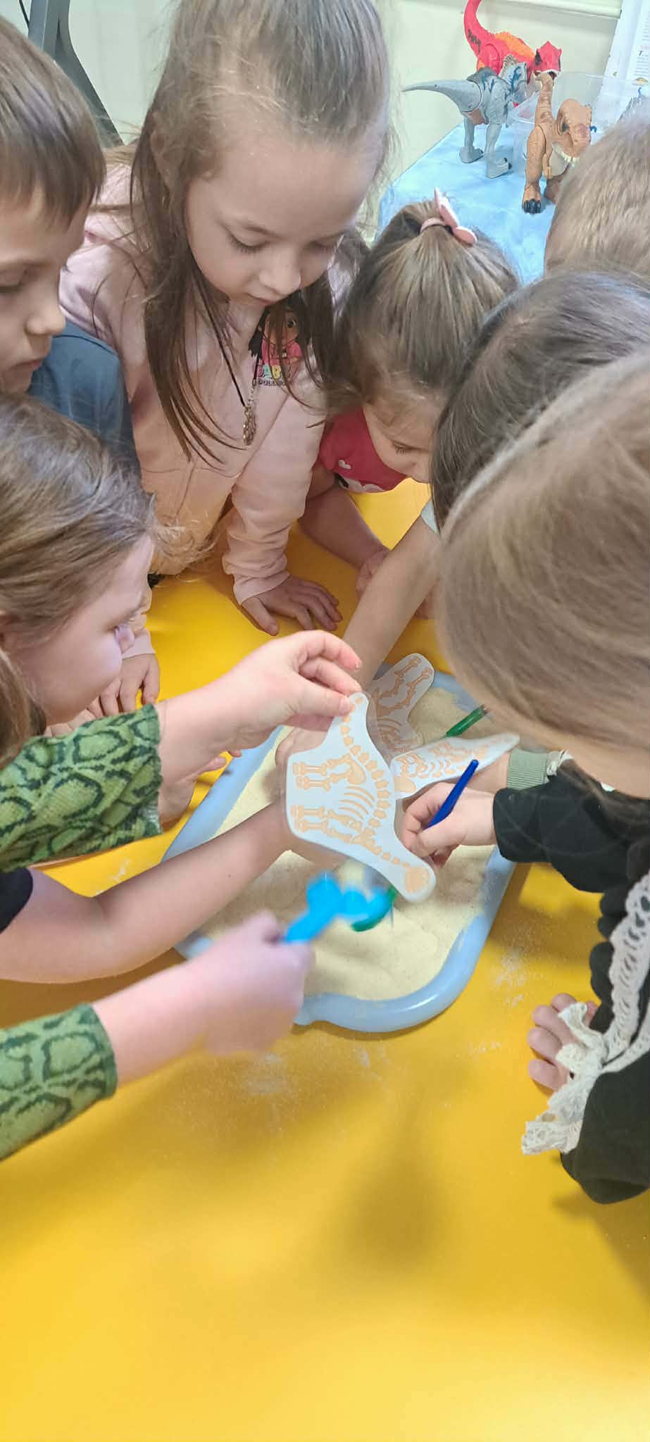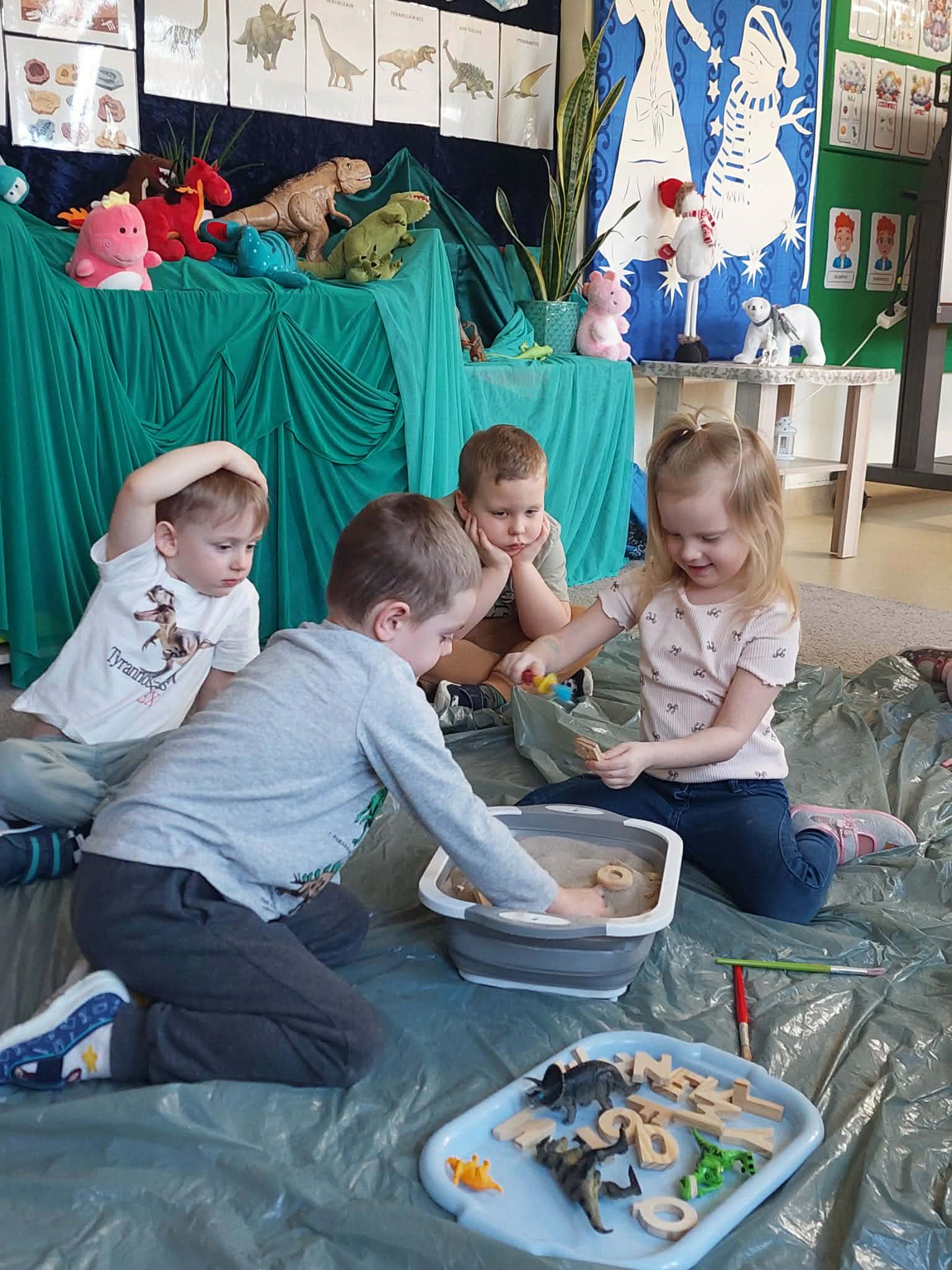Dnia 26 lutego w naszym przedszkolu obchodziliśmy Dzień Dinozaura. Tego dnia dzieci przeniosły się w niezwykły, prehistoryczny świat dinozaurów. Poznaliśmy ciekawostki o takich gatunkach jak Tyrannosaurus rex, Triceratops oraz Stegosaurus. Dzieci dowiedziały się, kim jest paleontolog i jak powstają skamieniałości. Wspólnie oglądaliśmy ilustracje dinozaurów, bawiliśmy się w „wykopaliska”, a także wykonywaliśmy prace plastyczne – kolorowaliśmy i wycinaliśmy dinozaury, tworzylismy szkielety z makaronów. Nie zabrakło zabaw ruchowych, tańców oraz quizów sprawdzających wiedzę o prehistorycznych gadach. Dzieci z wielkim zaangażowaniem uczestniczyły w zajęciach i chętnie dzieliły się swoimi ciekawostkami.