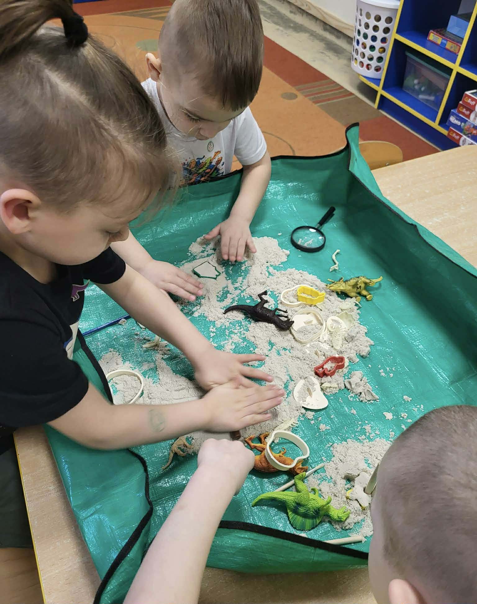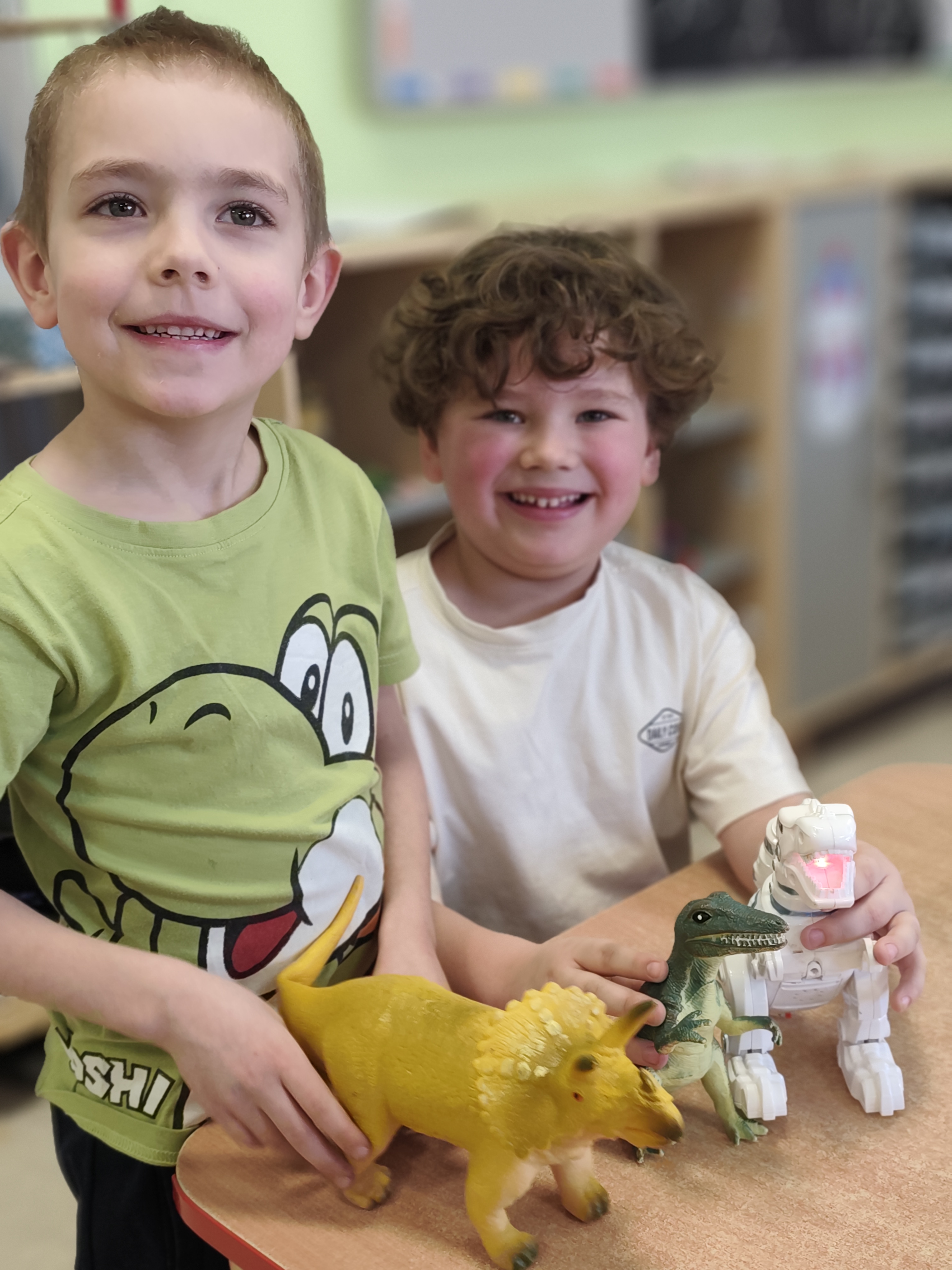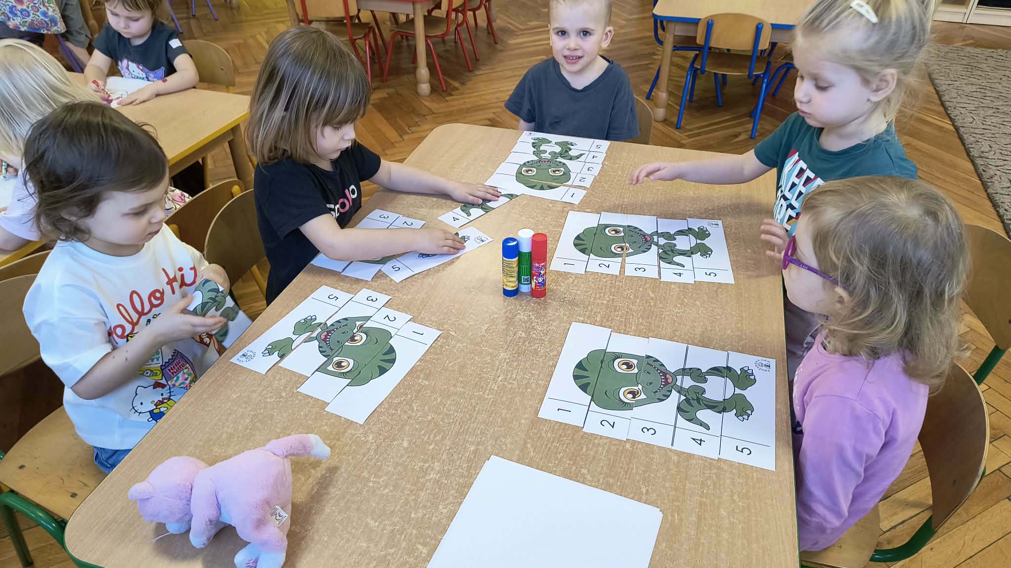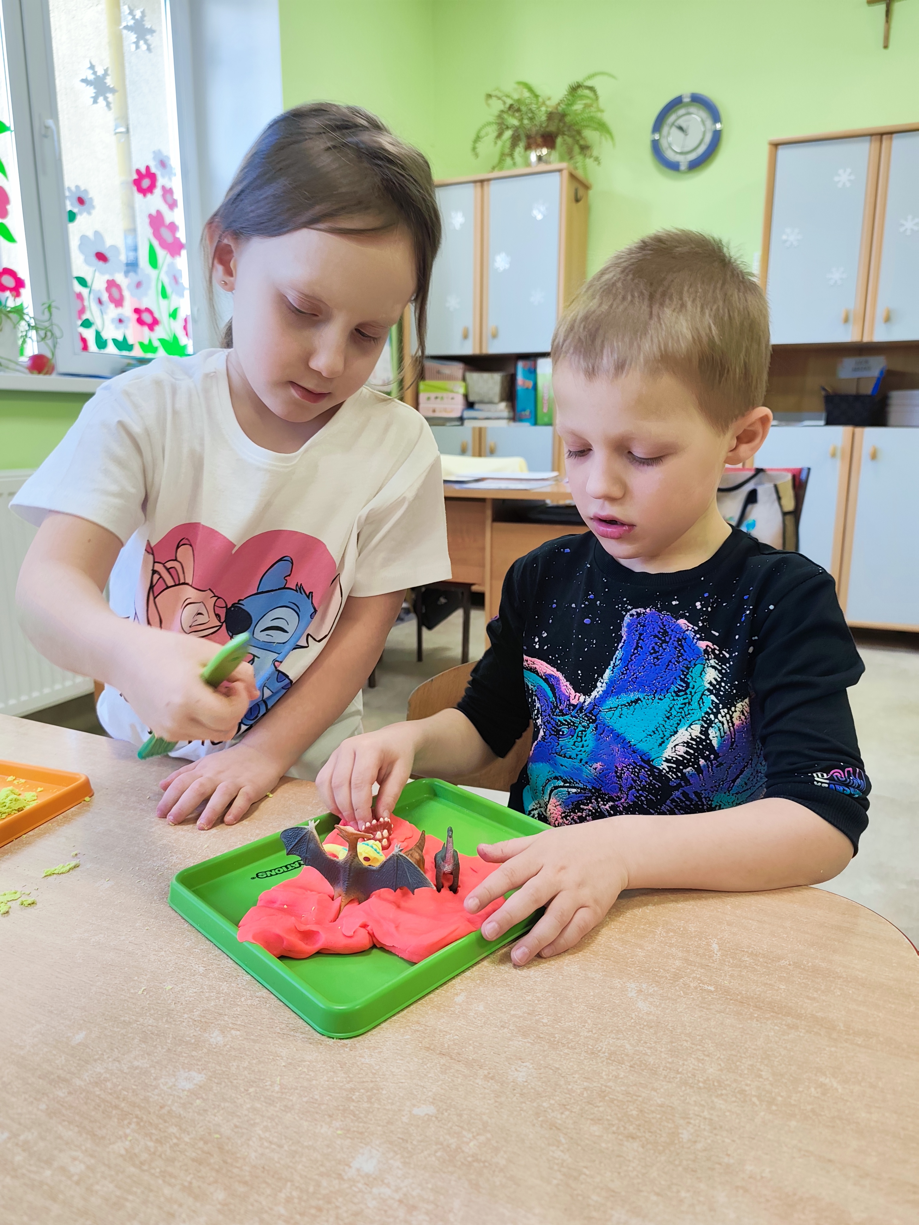 Dnia 26 lutego w naszym przedszkolu obchodziliśmy Dzień Dinozaura. Tego dnia dzieci przeniosły się w niezwykły, prehistoryczny świat dinozaurów. Poznaliśmy ciekawostki o takich gatunkach jak Tyrannosaurus rex, Triceratops oraz Stegosaurus. Dzieci dowiedziały się, kim jest paleontolog i jak powstają skamieniałości. Wspólnie oglądaliśmy ilustracje dinozaurów, bawiliśmy się w „wykopaliska”, a także wykonywaliśmy prace plastyczne – kolorowaliśmy i wycinaliśmy dinozaury, tworzylismy szkielety z makaronów. Nie zabrakło zabaw ruchowych, tańców oraz quizów sprawdzających wiedzę o prehistorycznych gadach. Dzieci z wielkim zaangażowaniem uczestniczyły w zajęciach i chętnie dzieliły się swoimi ciekawostkami.