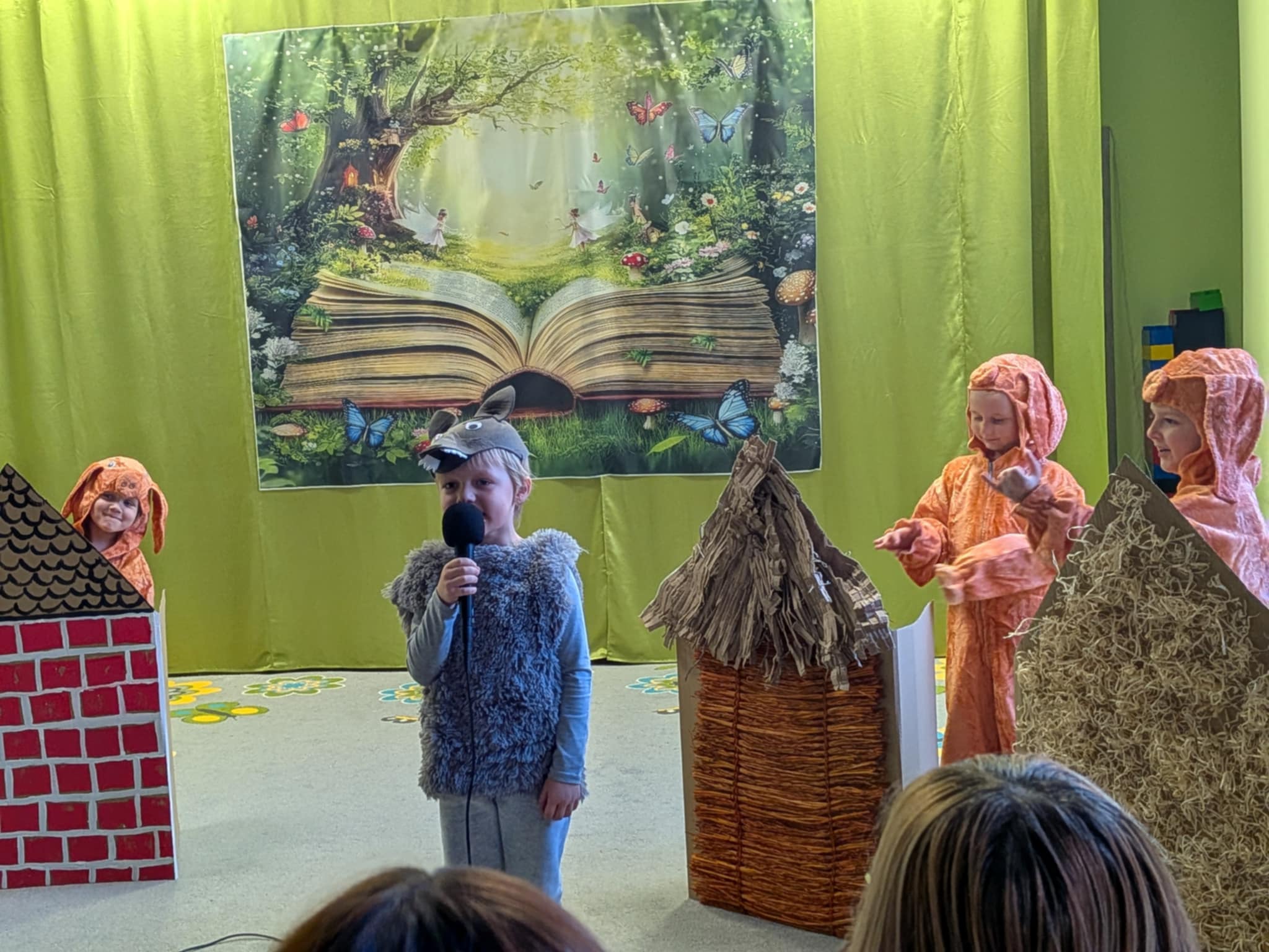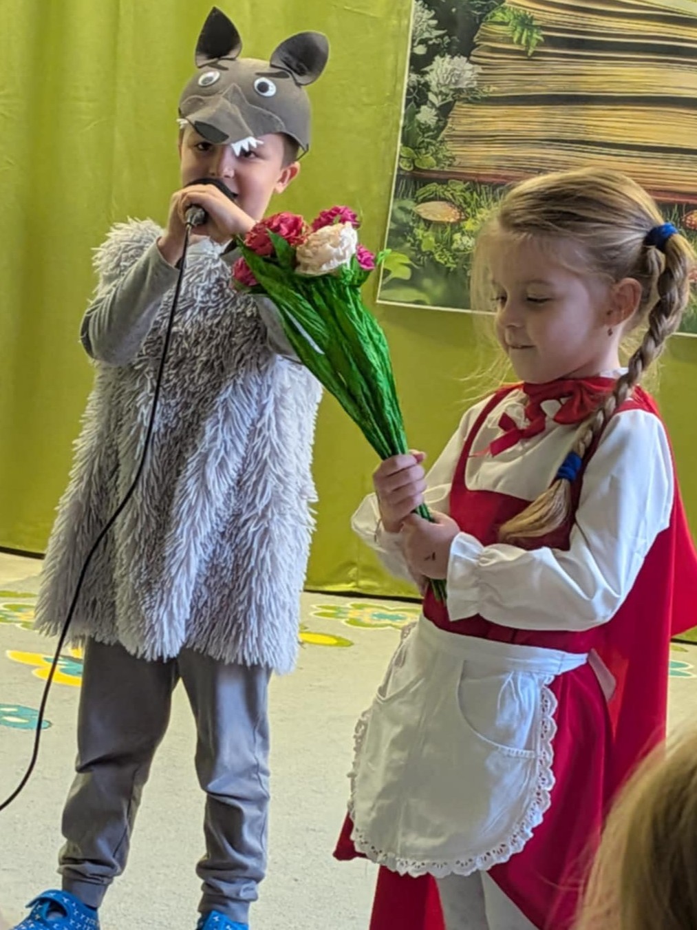 Dziś dzieci z grupy Stokrotki wprowadziły nas wszystkich do świata pełnego fantazji, pieknych wartości i niezwykłych bohaterów, którzy od pokoleń uczą nas, czym jest dobro, odwaga, przyjaźń i wytrwałość. Czerwony Kapturek, Jaś i Małgosia, Trzy Świnki a także Śnieżka i jej Siedmiu Krasnoludków przypomniały jak ważną rolę bajki odgrywają w życiu każdego dziecka. To właśnie one rozwijaja wyobraźnię, uczą, że dobro zawsze zwycięża, pomagają przeżywać i nazywać emocje. Dziś nasze przedszkole zamieniło sie w miejsce pełne księżniczek, superbohaterów, wróżek, czarodziejów, którzy na codzień mieszkają na kartach książek. Każdy z nas stał się częścią swojej ulubionej historii - i to jest najpiękniejsze, bo bajki żyją dzięki nam. Niech dzisiejszy dzień pełen kolorów i uśmiechów przypomina nam, że magia naprawdę istnieje - szczególnie wtedy, gdy sami ją tworzymy.