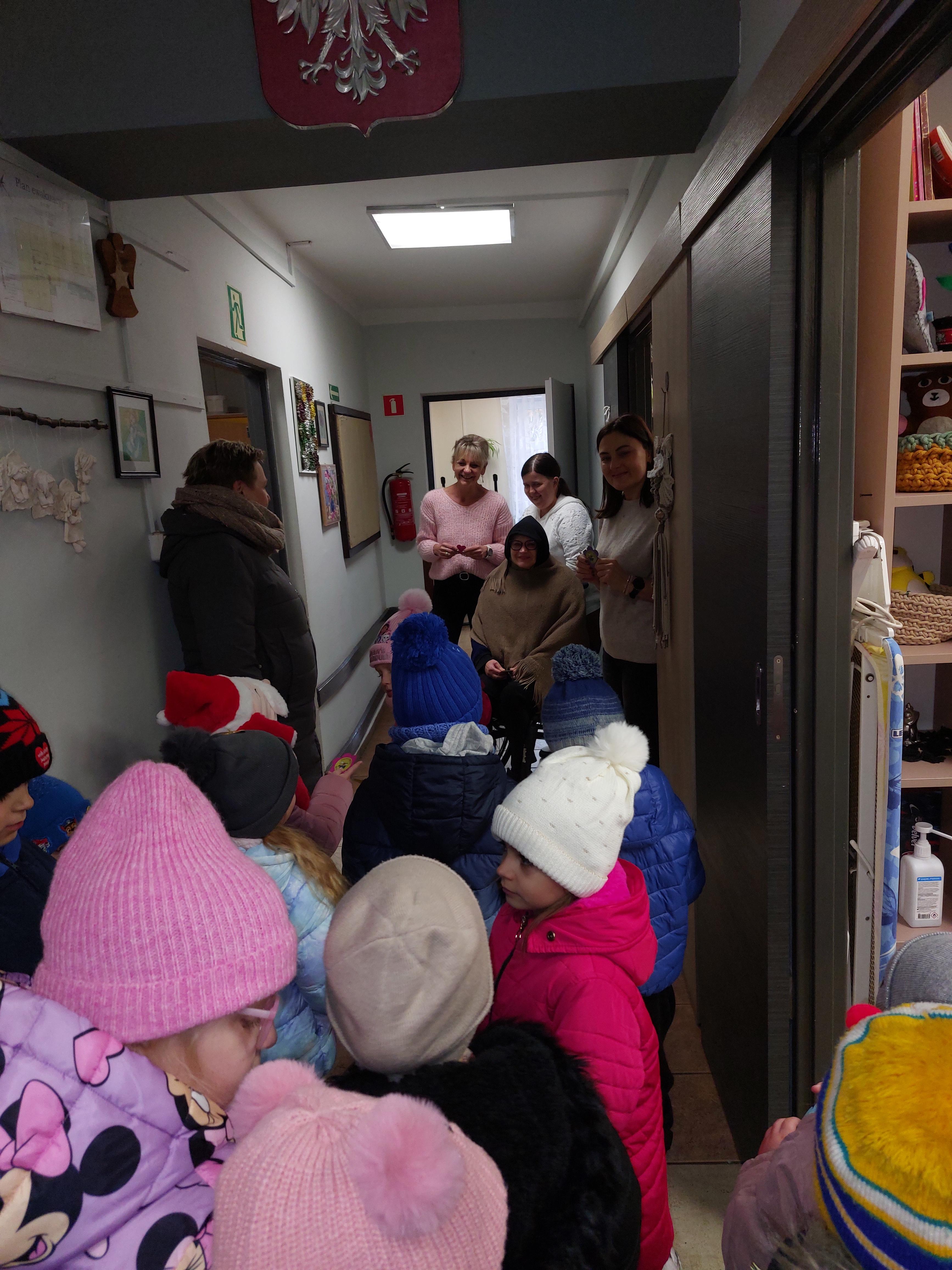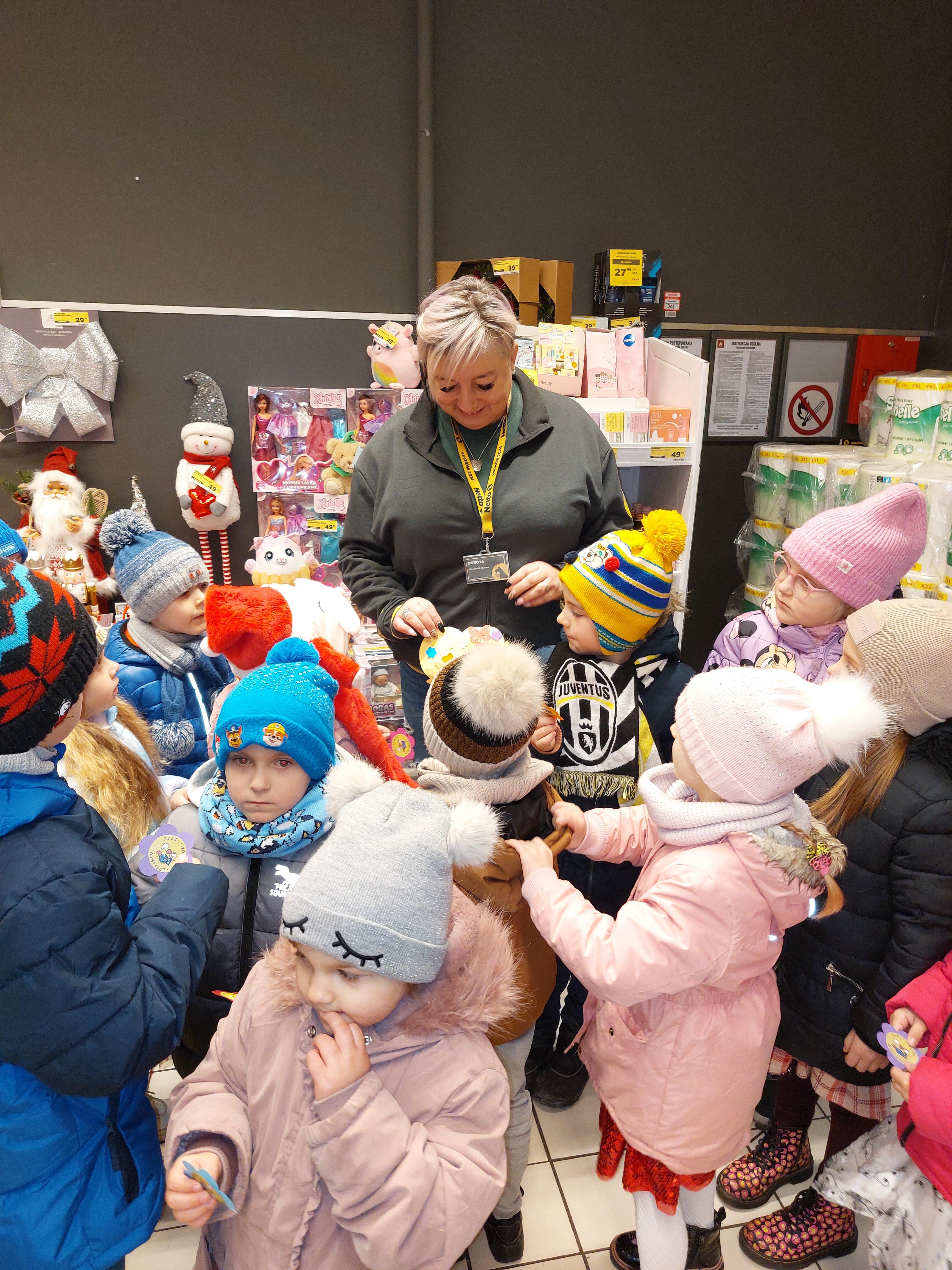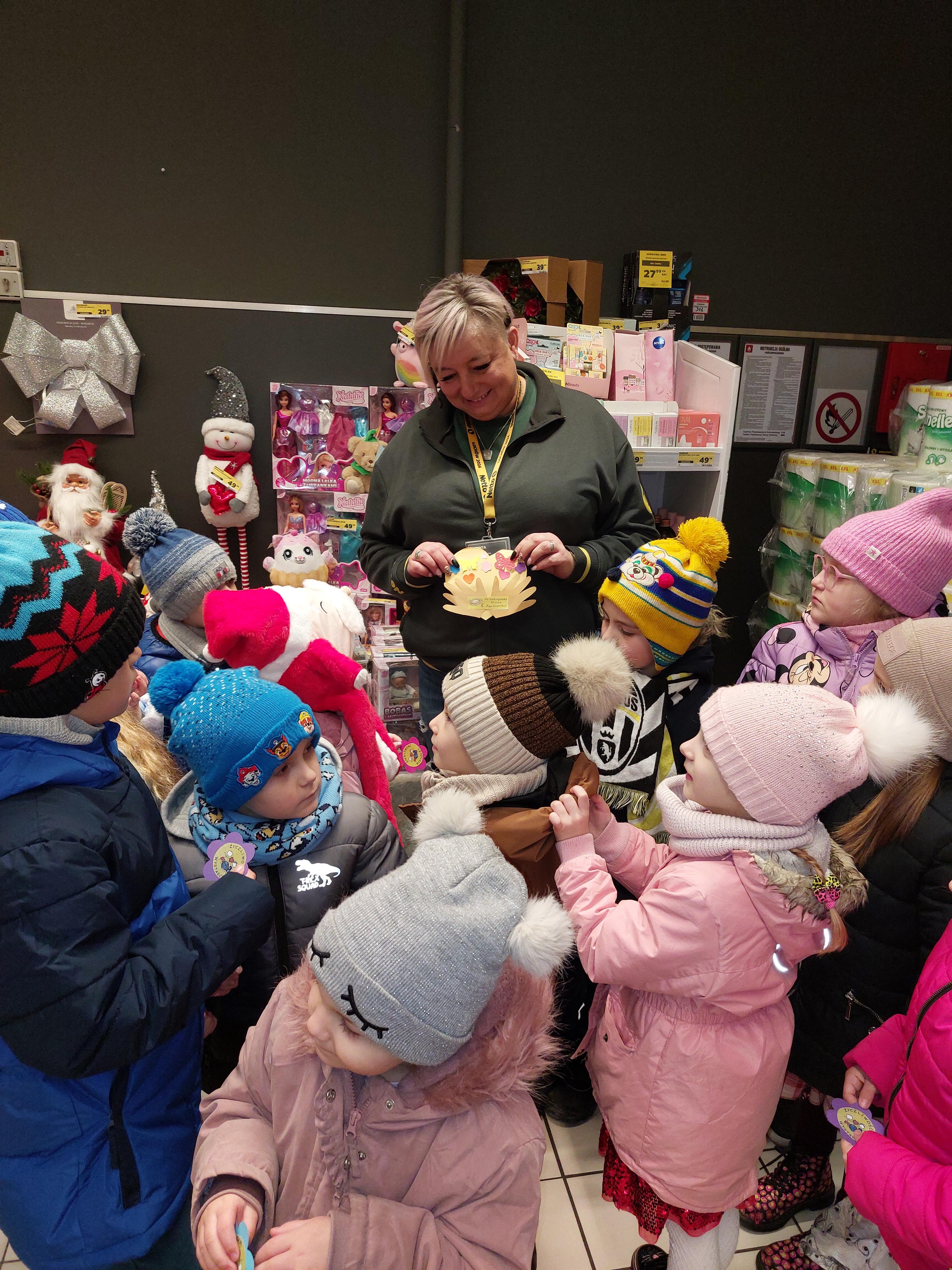 W ramach obchodów Dnia Życzliwości dzieci z grupy „Motylki” wybrały się na wyjątkowy spacer po okolicy, aby szerzyć uśmiech i dobre słowo. Przedszkolaki odwiedziły Warsztaty Terapii Zajęciowej, gdzie z radością przekazały własnoręcznie przygotowane kartki z życzliwymi hasłami. Następnie udały się do sklepu Netto, pobliskiego sklepu spożywczego oraz Apteki „Aspirynki”, aby obdarować pracowników miłymi życzeniami i symbolicznymi upominkami wykonanymi w przedszkolu.