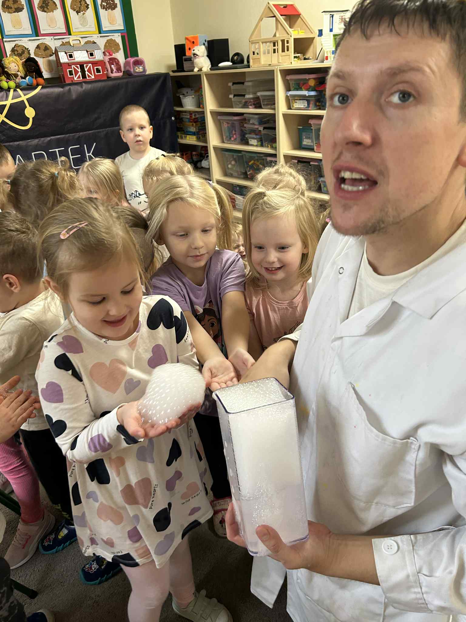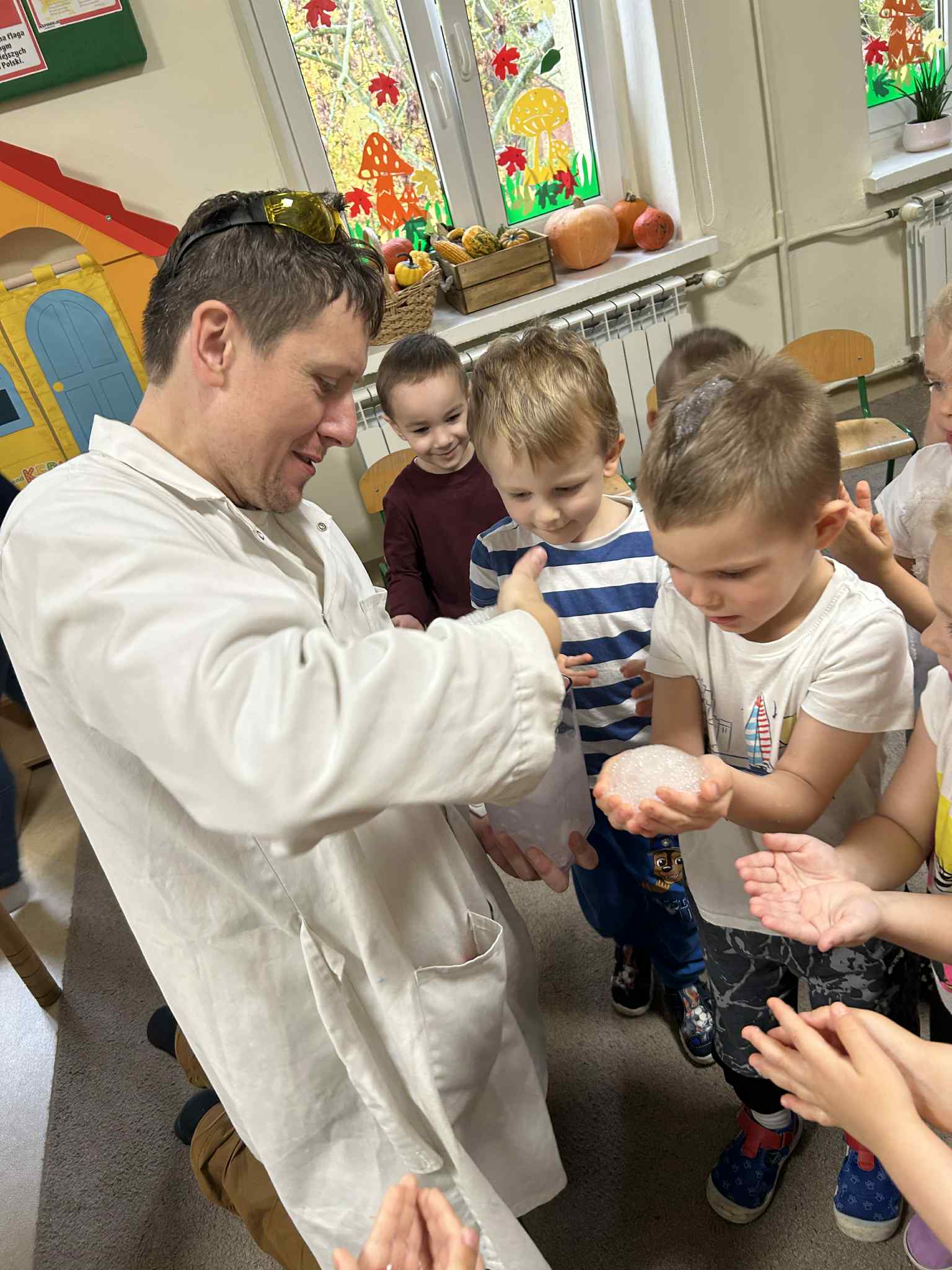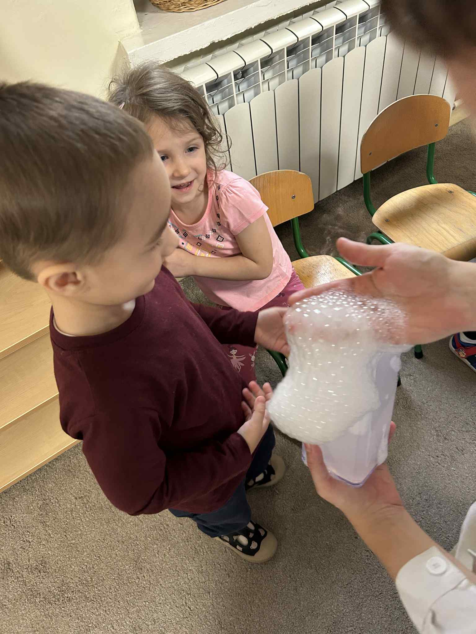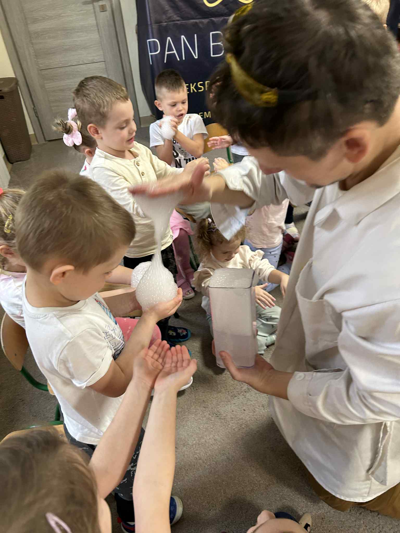 Był to naprawdę niezwykły dzień, pełen ciekawości, śmiechu i zdumienia. Eksperymenty bardzo spodobały się dzieciom — z ogromnym zaangażowaniem dotykały i doświadczały. Zajęcia rozbudziły w nich chęć poznawania świata i pokazały, że nauka może być fascynującą przygodą.