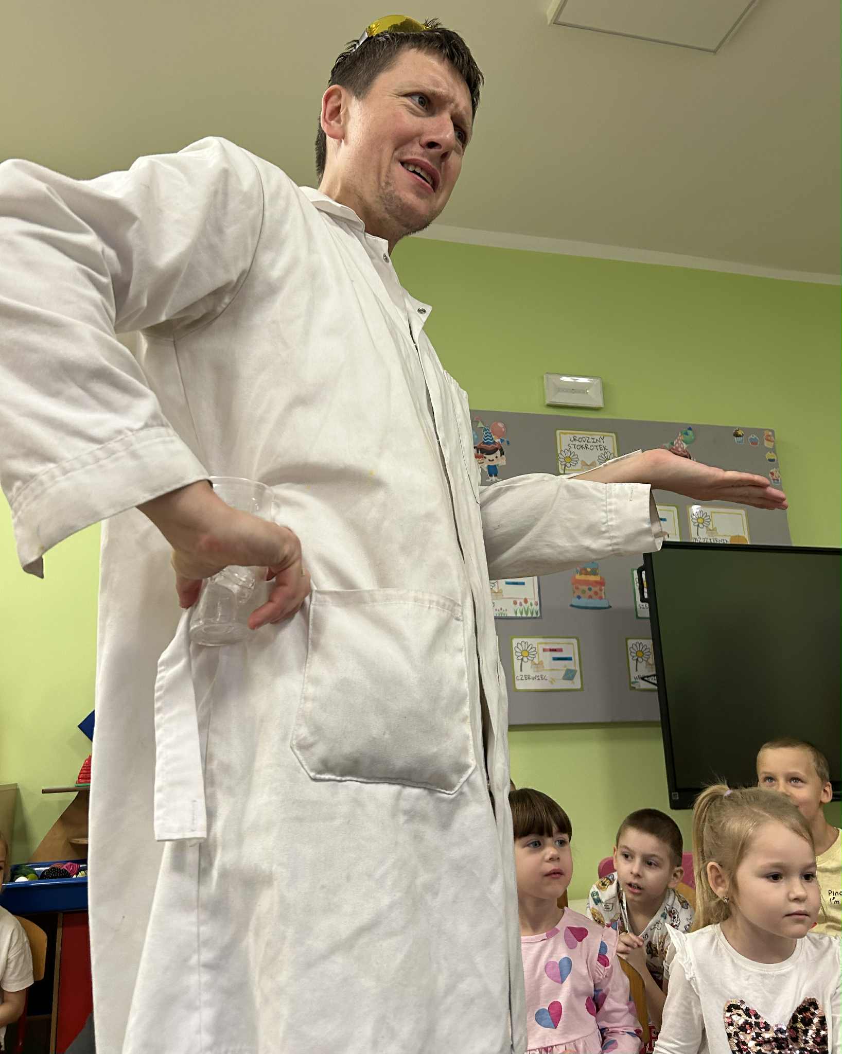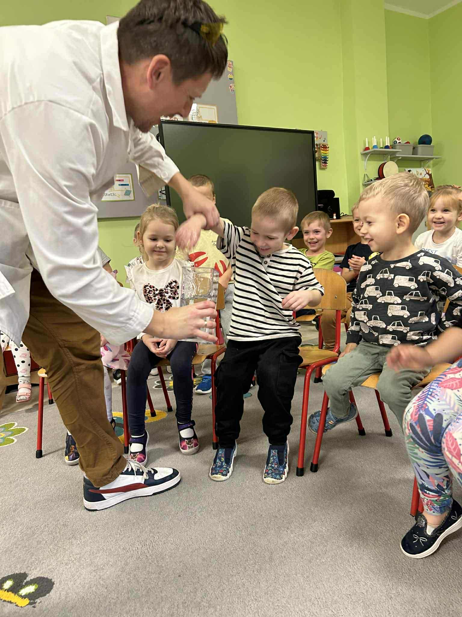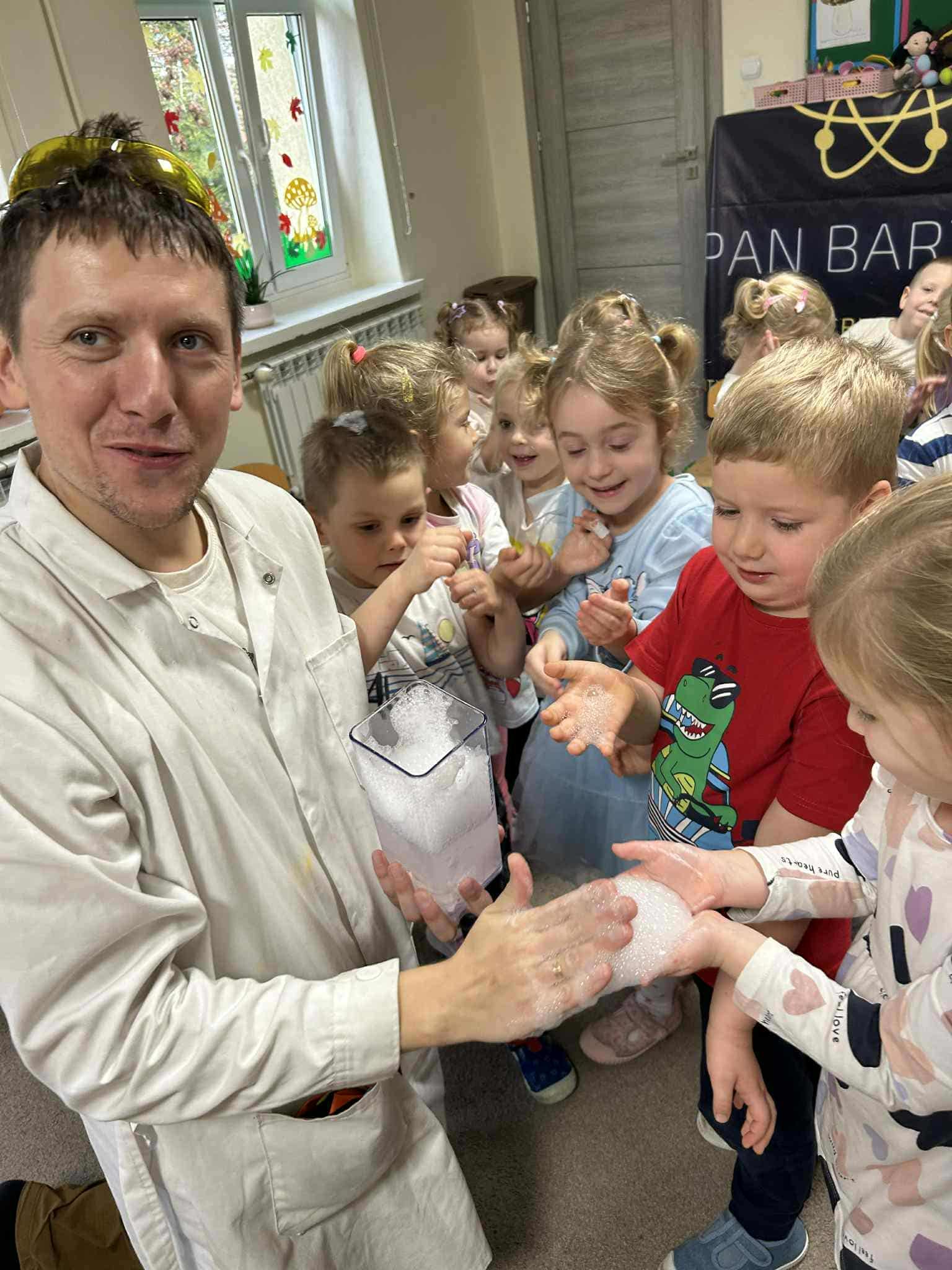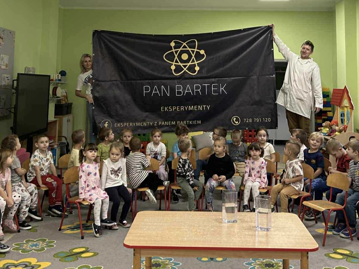 Dzisiejszy dzień był pełen emocji i niezapomnianych wrażeń. W naszym przedszkolu mieliśmy niezwykłego gościa – pana Bartka Pałuckiego, pasjonata nauki, który w fascynujący sposób wprowadził dzieci w świat fizyki i chemii poprzez zabawę. Dzieci mogły nie tylko obserwować, ale również aktywnie uczestniczyć w doświadczeniach, samodzielnie próbując i odkrywając tajemnice nauki. Był to naprawdę niezwykły dzień, pełen ciekawości, śmiechu i zdumienia. Eksperymenty bardzo spodobały się dzieciom — z ogromnym zaangażowaniem dotykały i doświadczały. Zajęcia rozbudziły w nich chęć poznawania świata i pokazały, że nauka może być fascynującą przygodą.