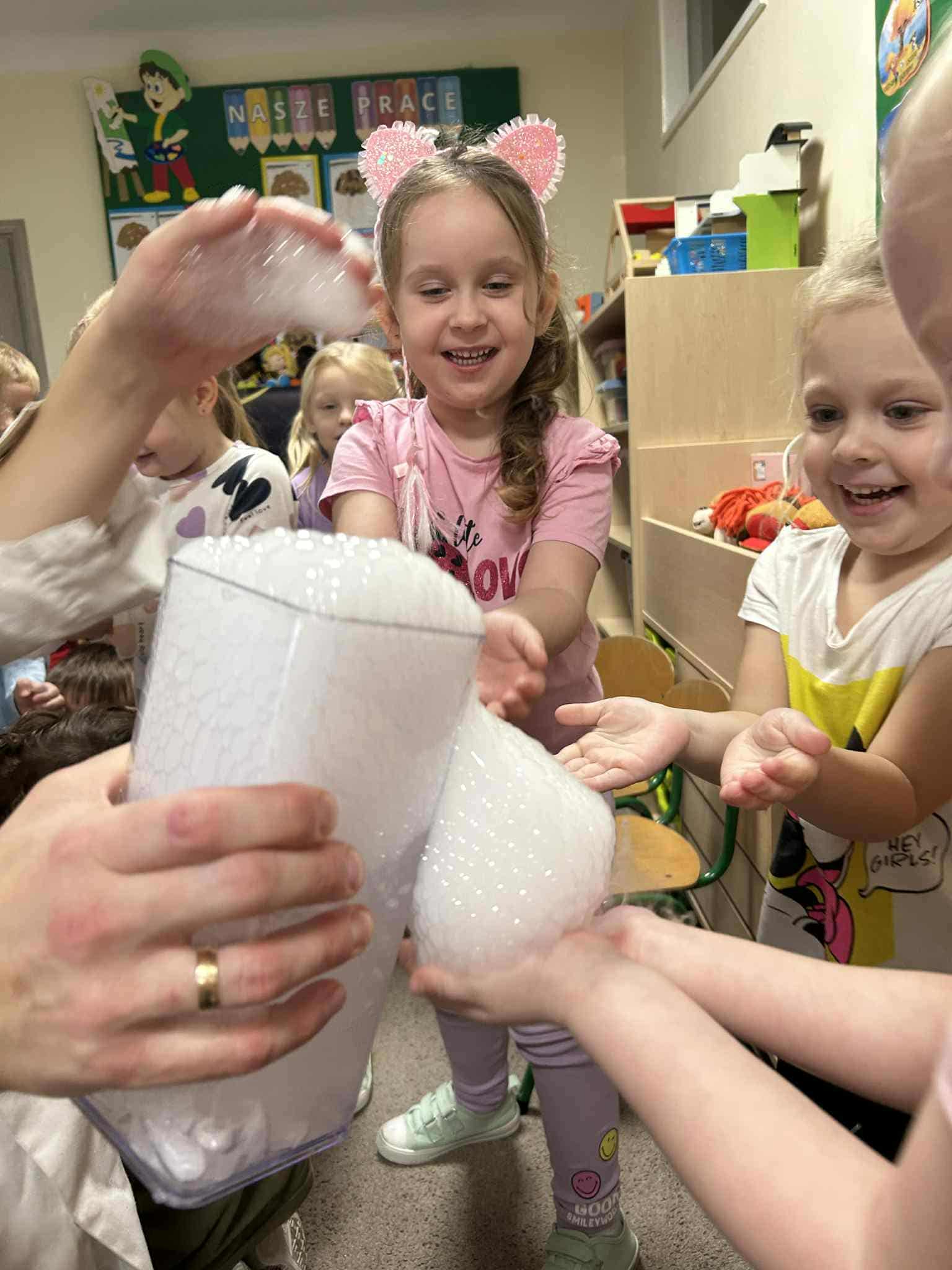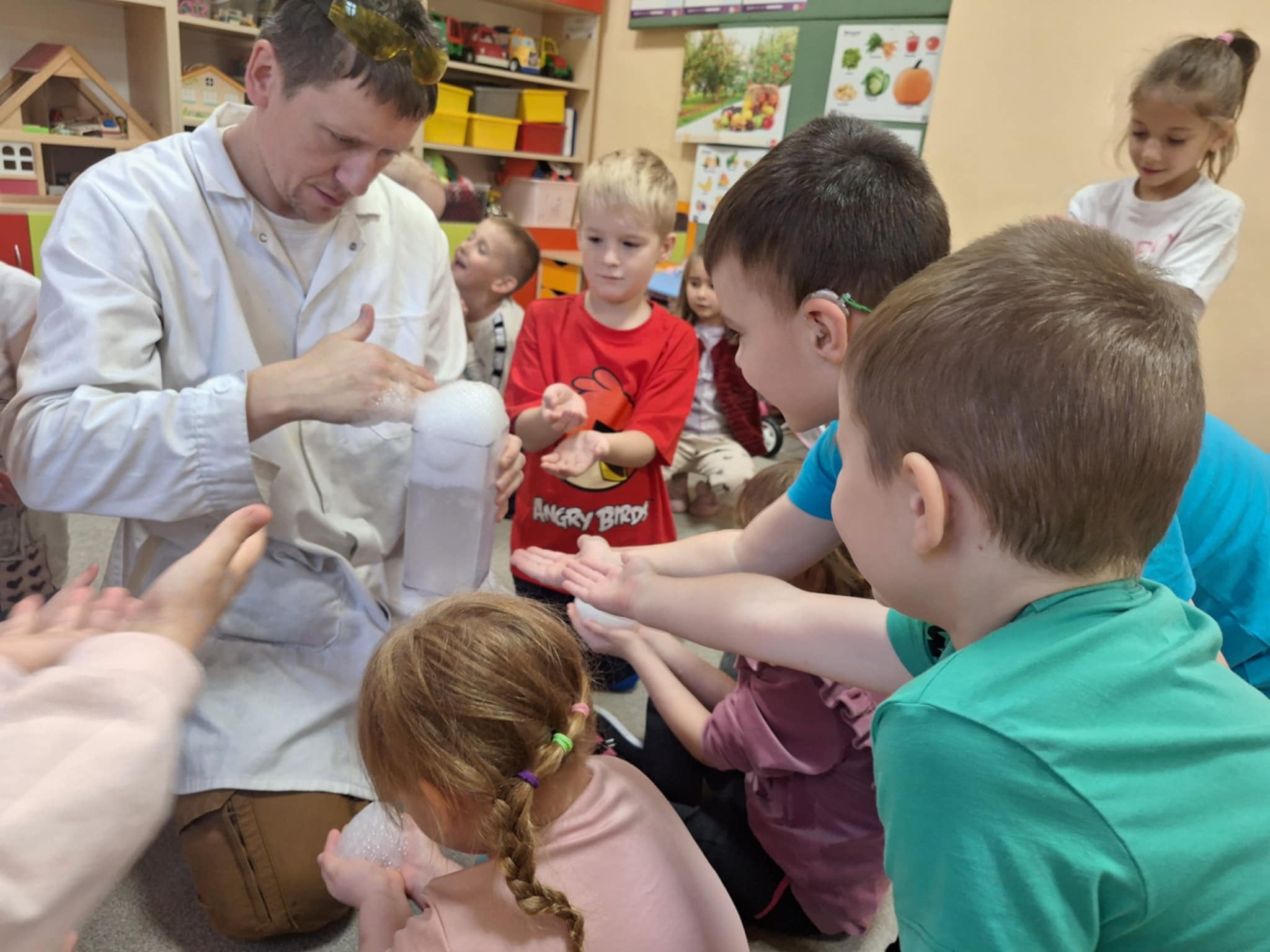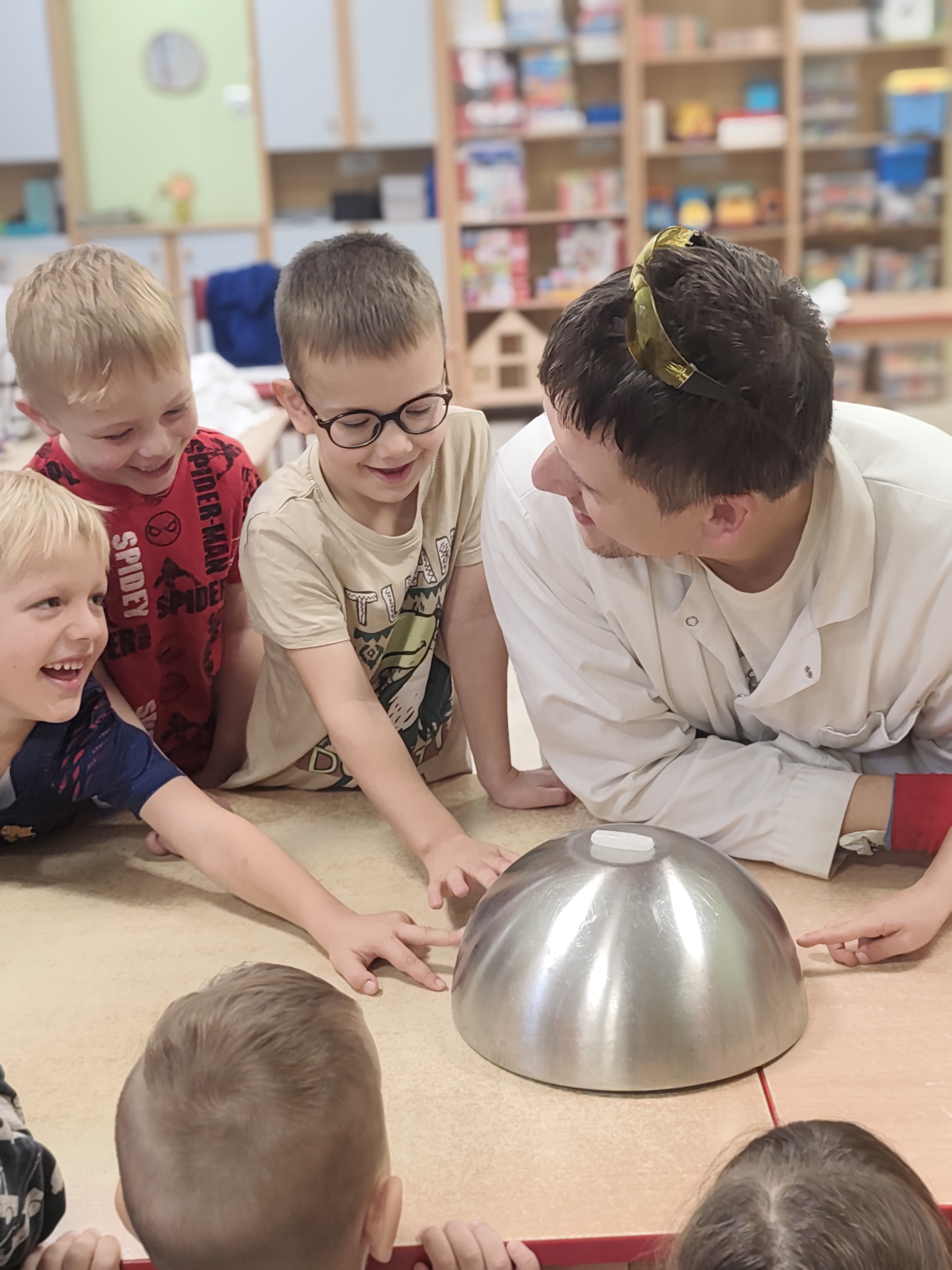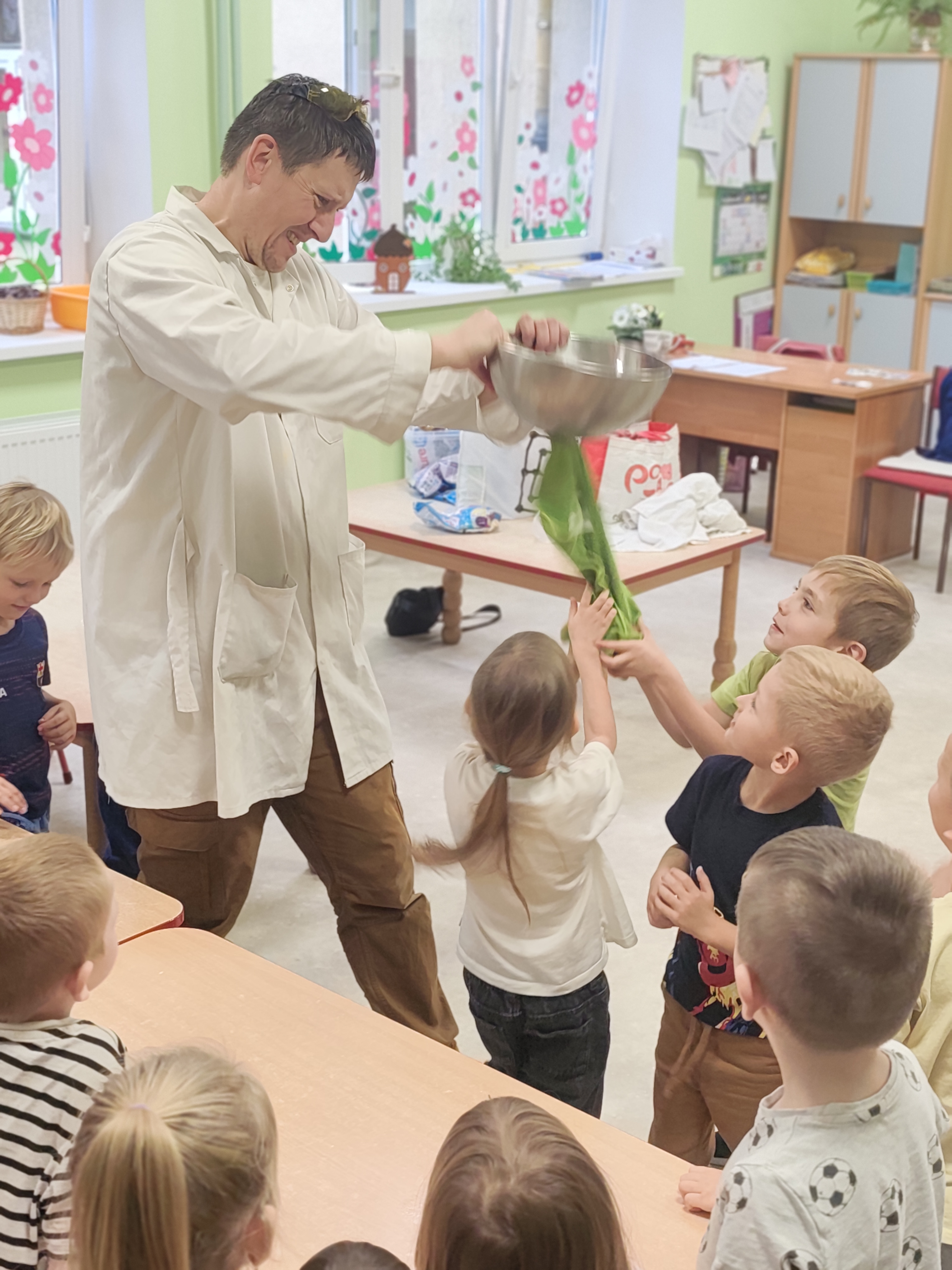 Dzisiejszy dzień był pełen emocji i niezapomnianych wrażeń. W naszym przedszkolu mieliśmy niezwykłego gościa – pana Bartka Pałuckiego, pasjonata nauki, który w fascynujący sposób wprowadził dzieci w świat fizyki i chemii poprzez zabawę. Dzieci mogły nie tylko obserwować, ale również aktywnie uczestniczyć w doświadczeniach, samodzielnie próbując i odkrywając tajemnice nauki. Był to naprawdę niezwykły dzień, pełen ciekawości, śmiechu i zdumienia. Eksperymenty bardzo spodobały się dzieciom — z ogromnym zaangażowaniem dotykały i doświadczały. Zajęcia rozbudziły w nich chęć poznawania świata i pokazały, że nauka może być fascynującą przygodą.