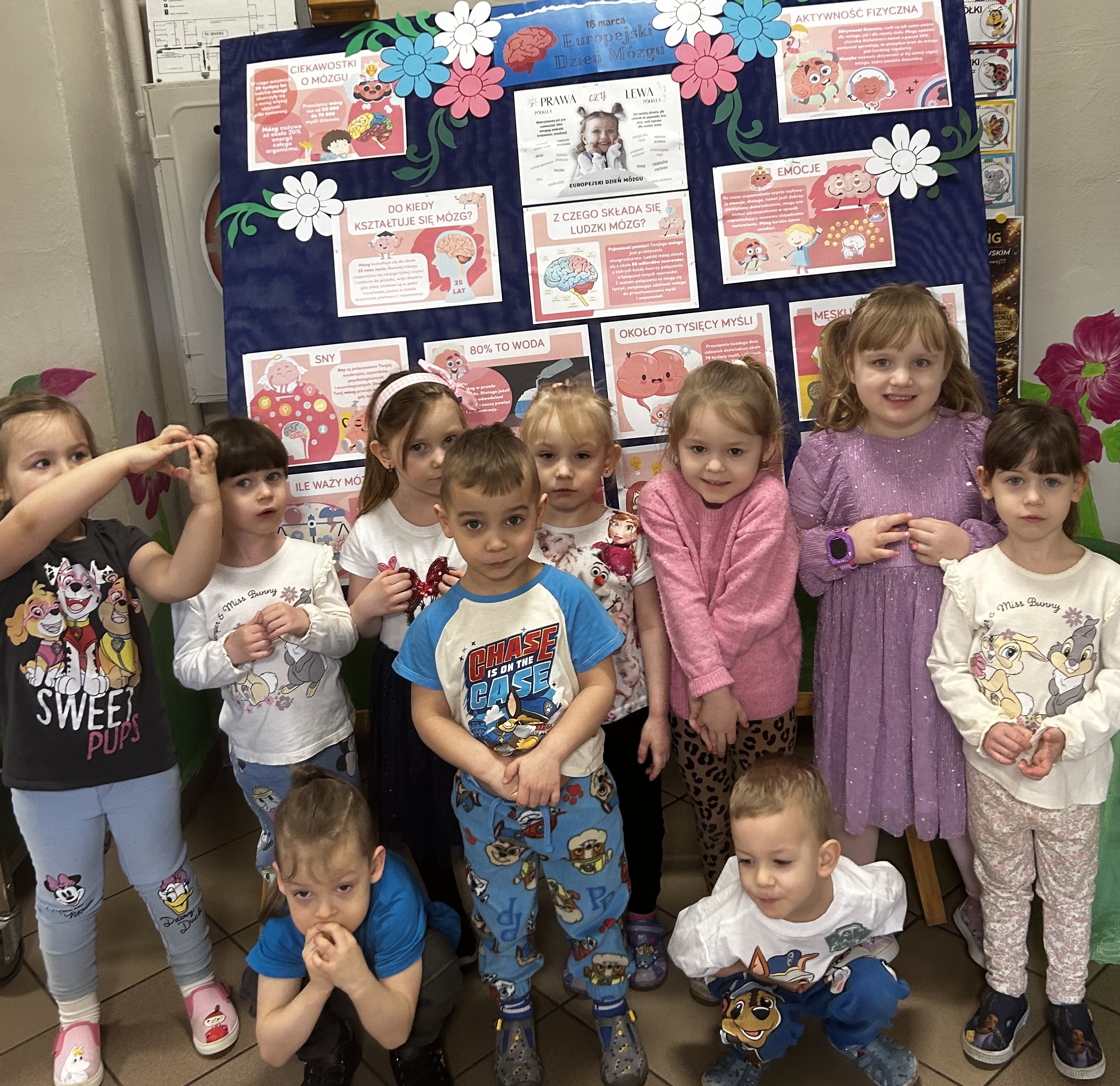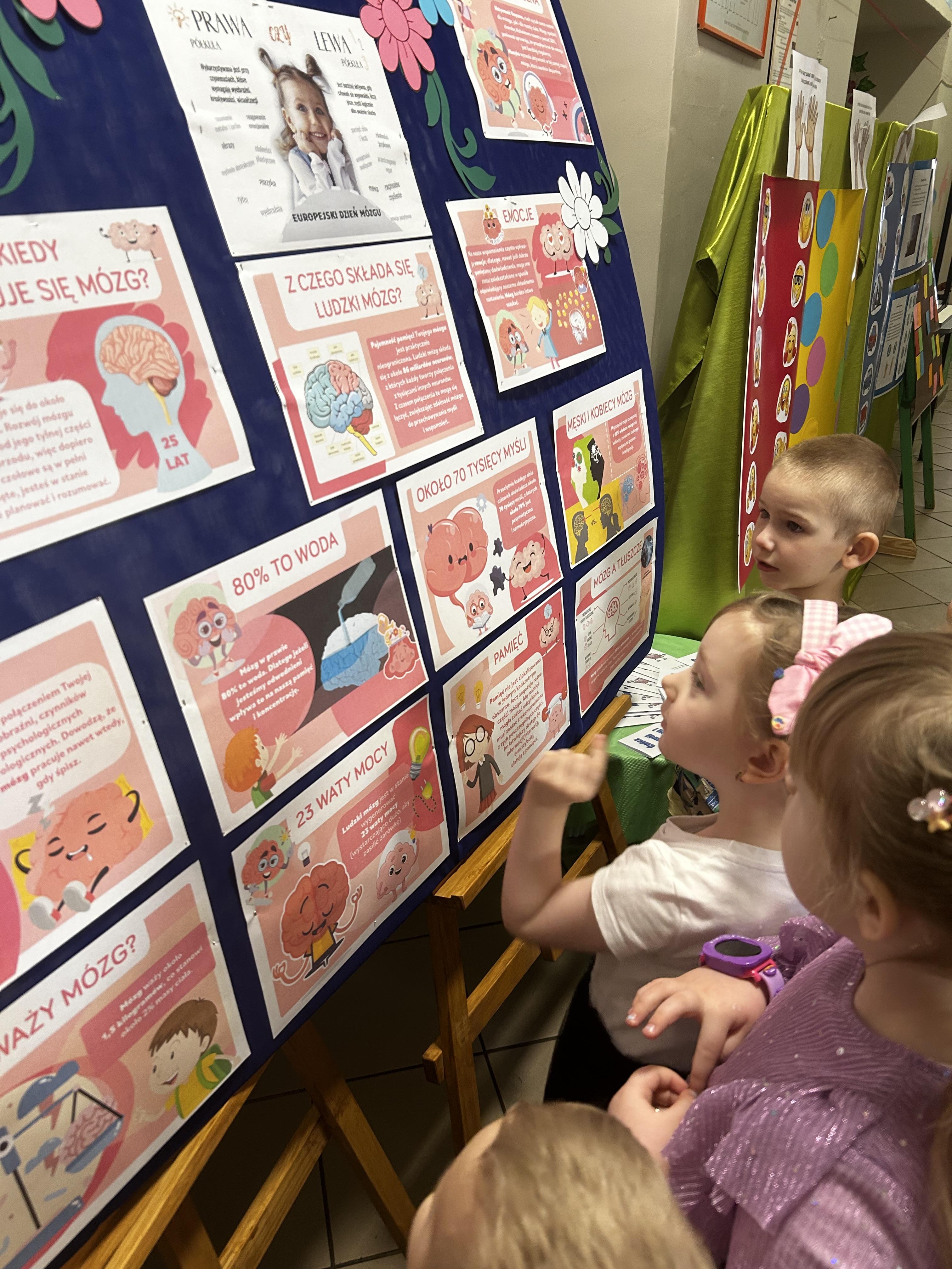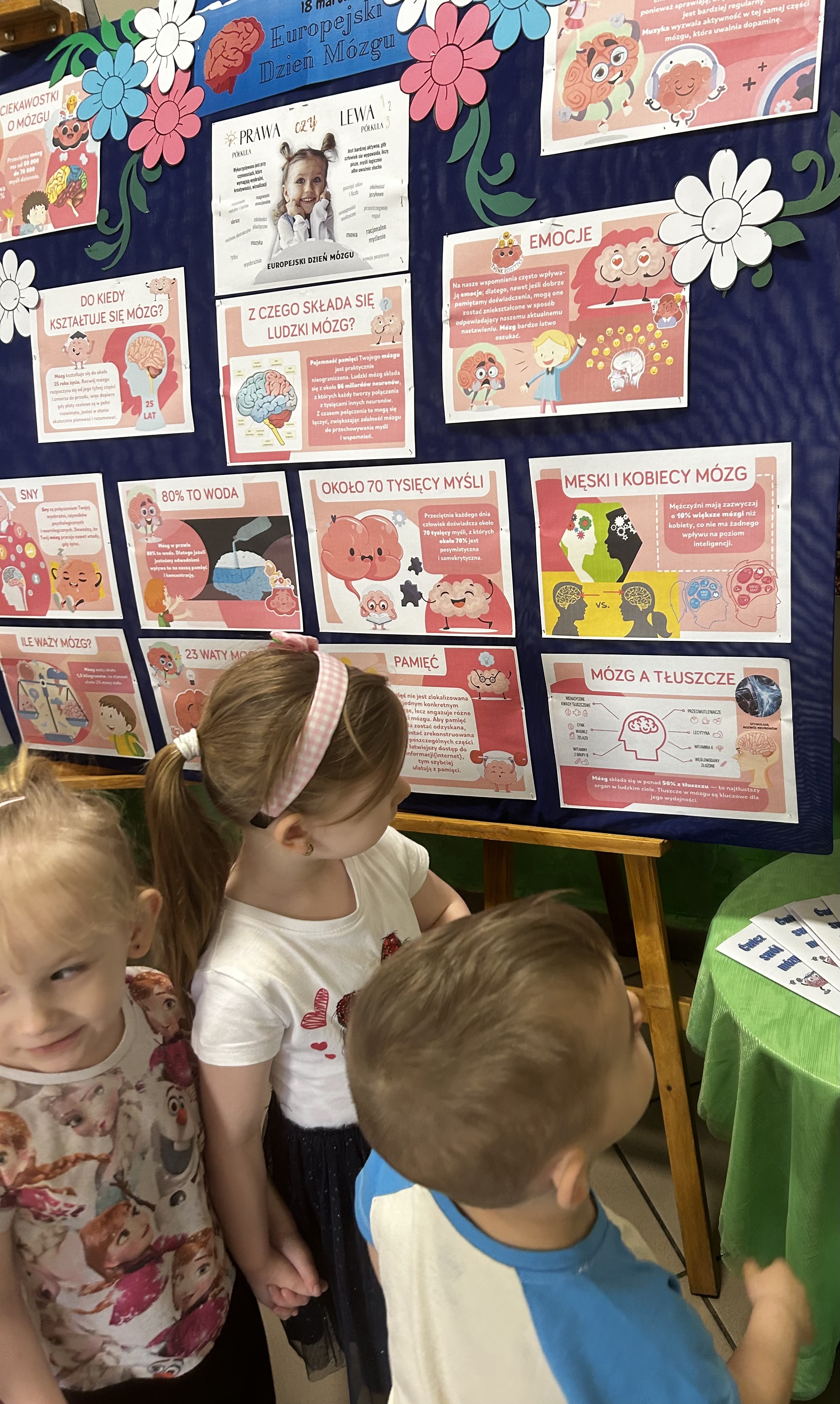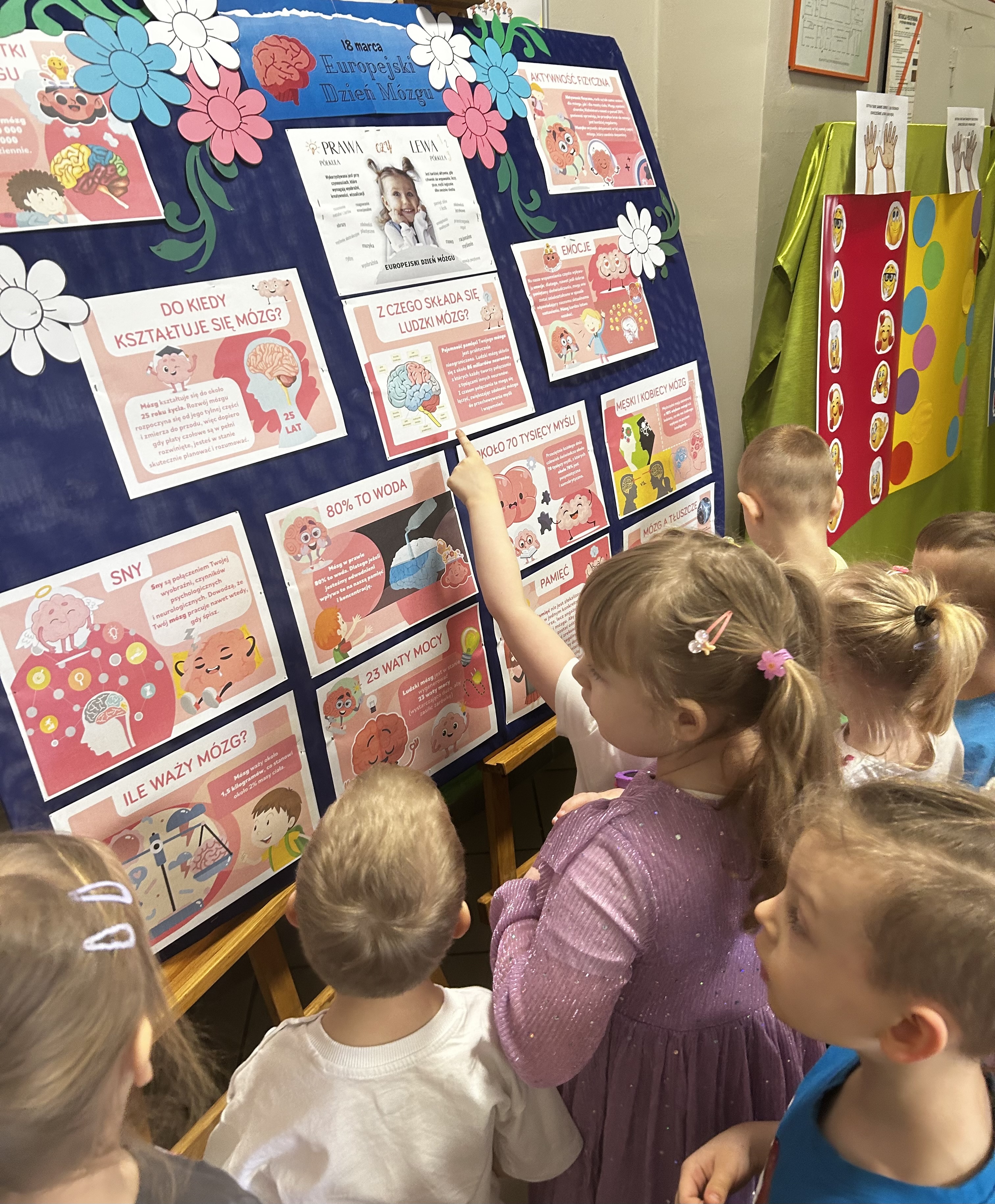 Z okazji Europejskiego Dnia Mózgu pedagodzy specjalnie naszego przedszkola przygotowali wystawę dla dzieci, a grupa „Myszki” chętnie w niej uczestniczyła.”