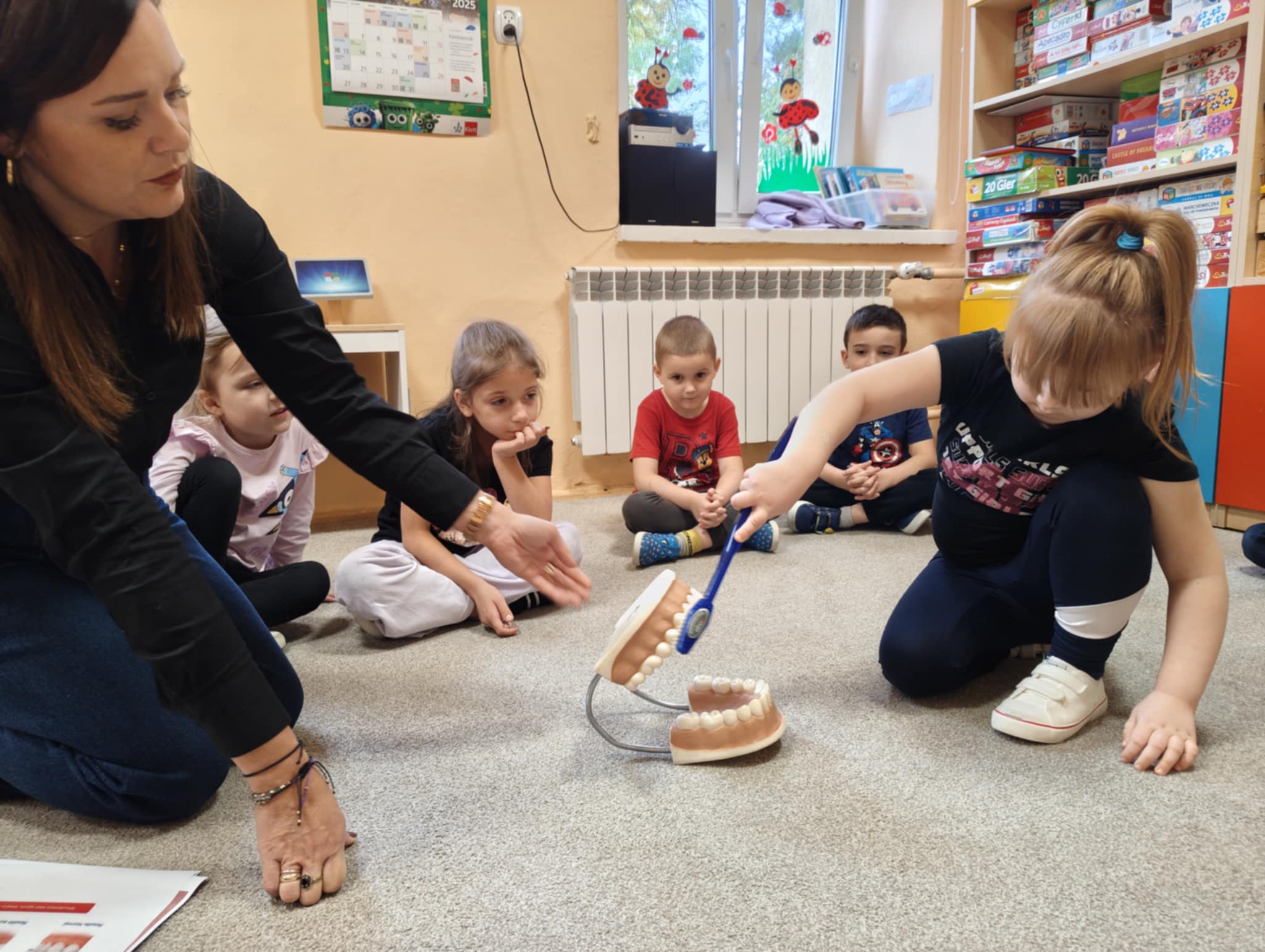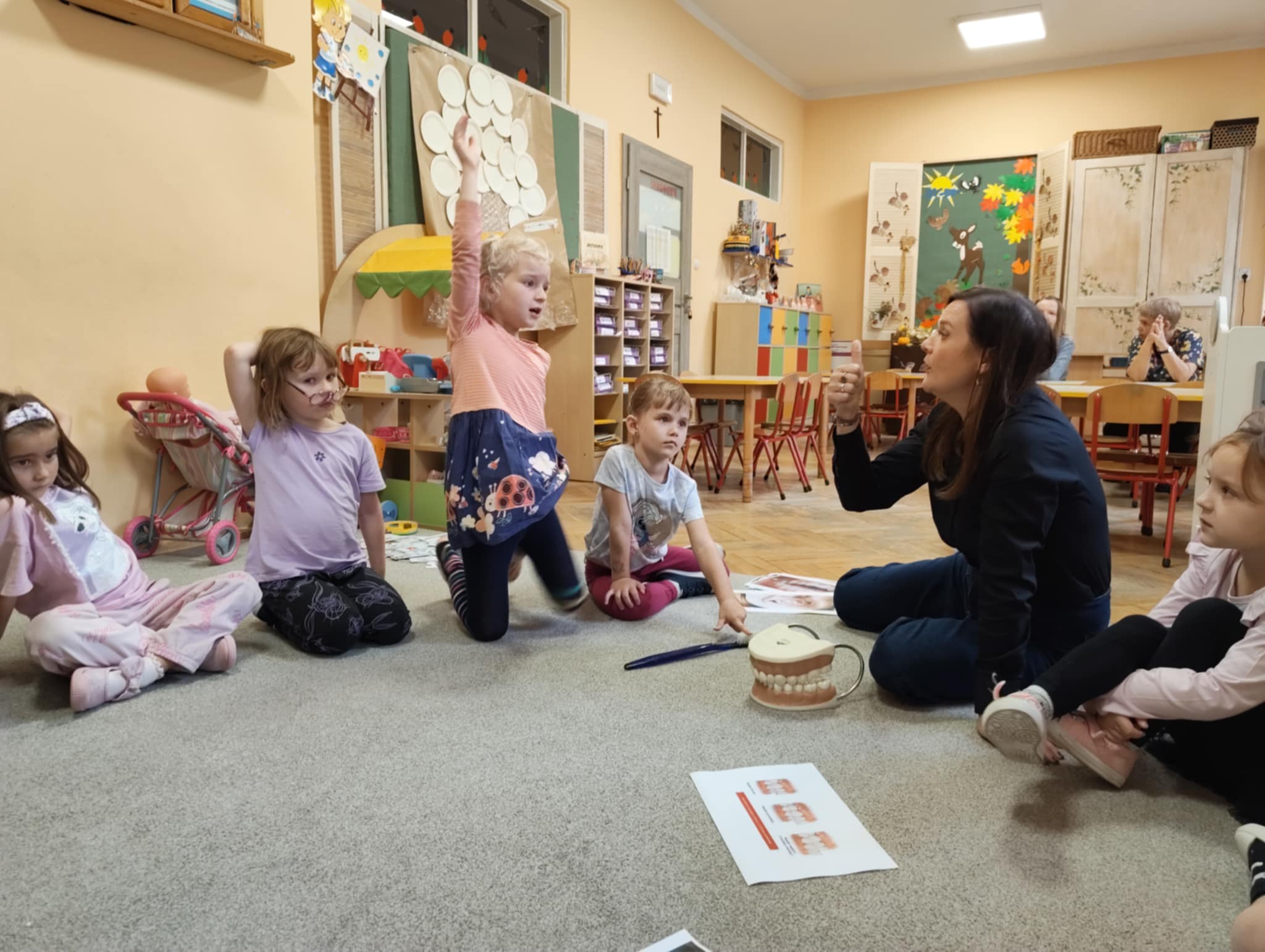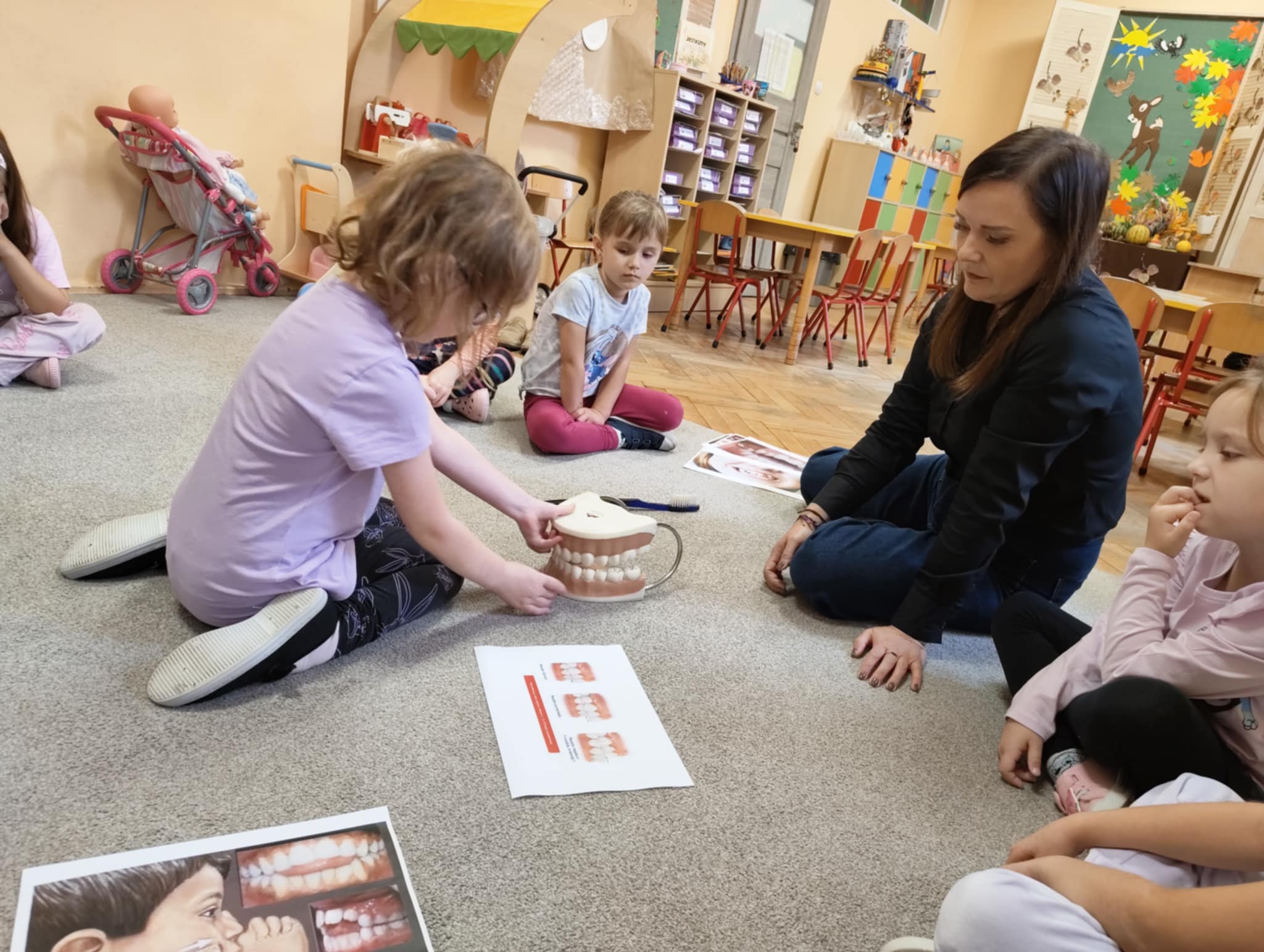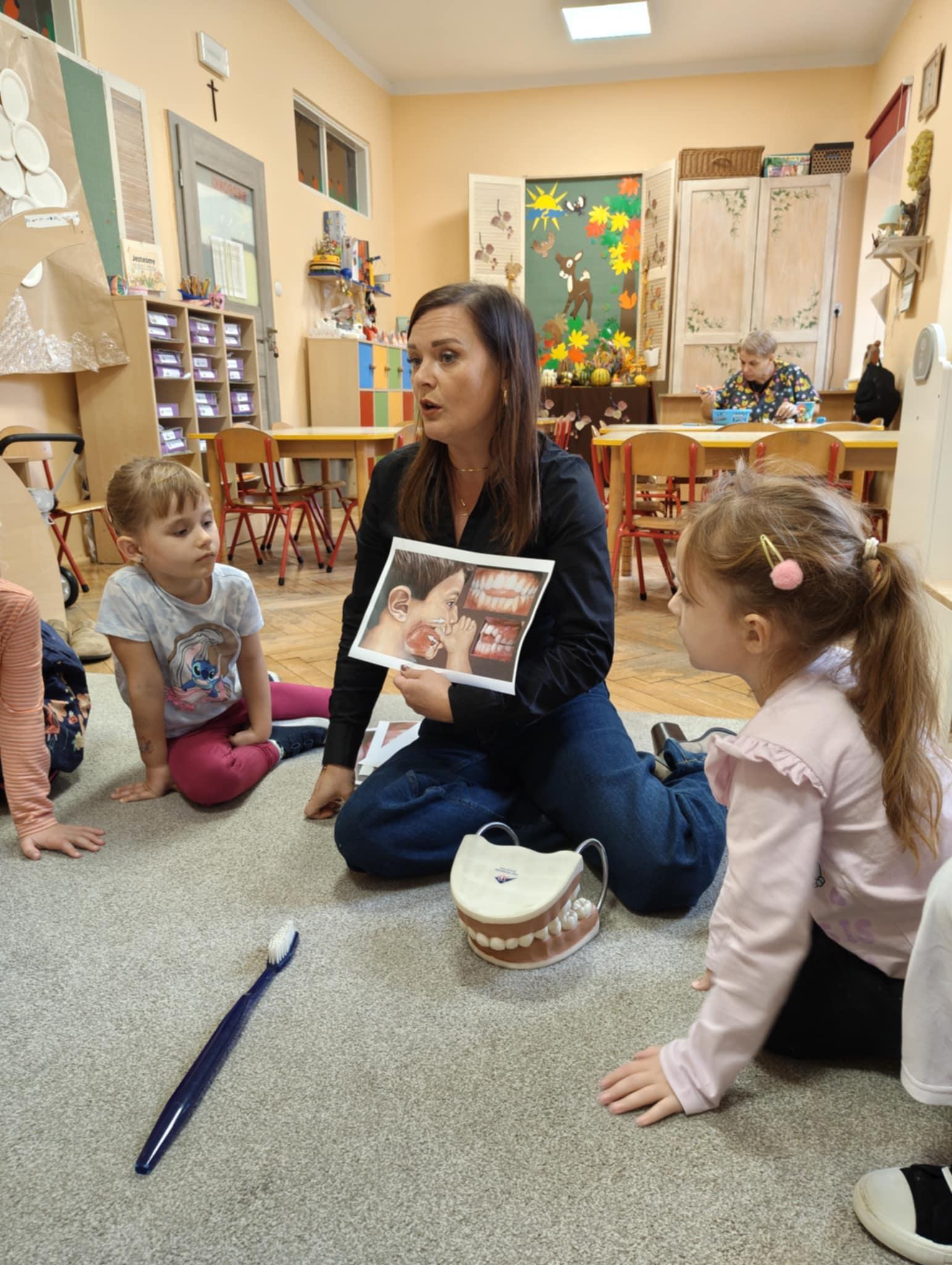 W związku z tym wychowawczyni z logopedą przedszkolnym przekazały dzieciom informacje, jak ważnym zadaniem jest dbanie o higienę zębów, przybliżyły co dają systematyczne wizyty kontrolne u stomatologa oraz jak istotne jest dla prawidłowego zgryzu eliminowanie złych nawyków związanych ze zdrowiem. Po pogadance dzieci tworzyły prace plastyczne wg. własnych pomysłów przedstawiające tematykę zdrowia zębów i jamy ustnej. Najładniejsze prace konkursowe zostaną wysłane do Organizatora