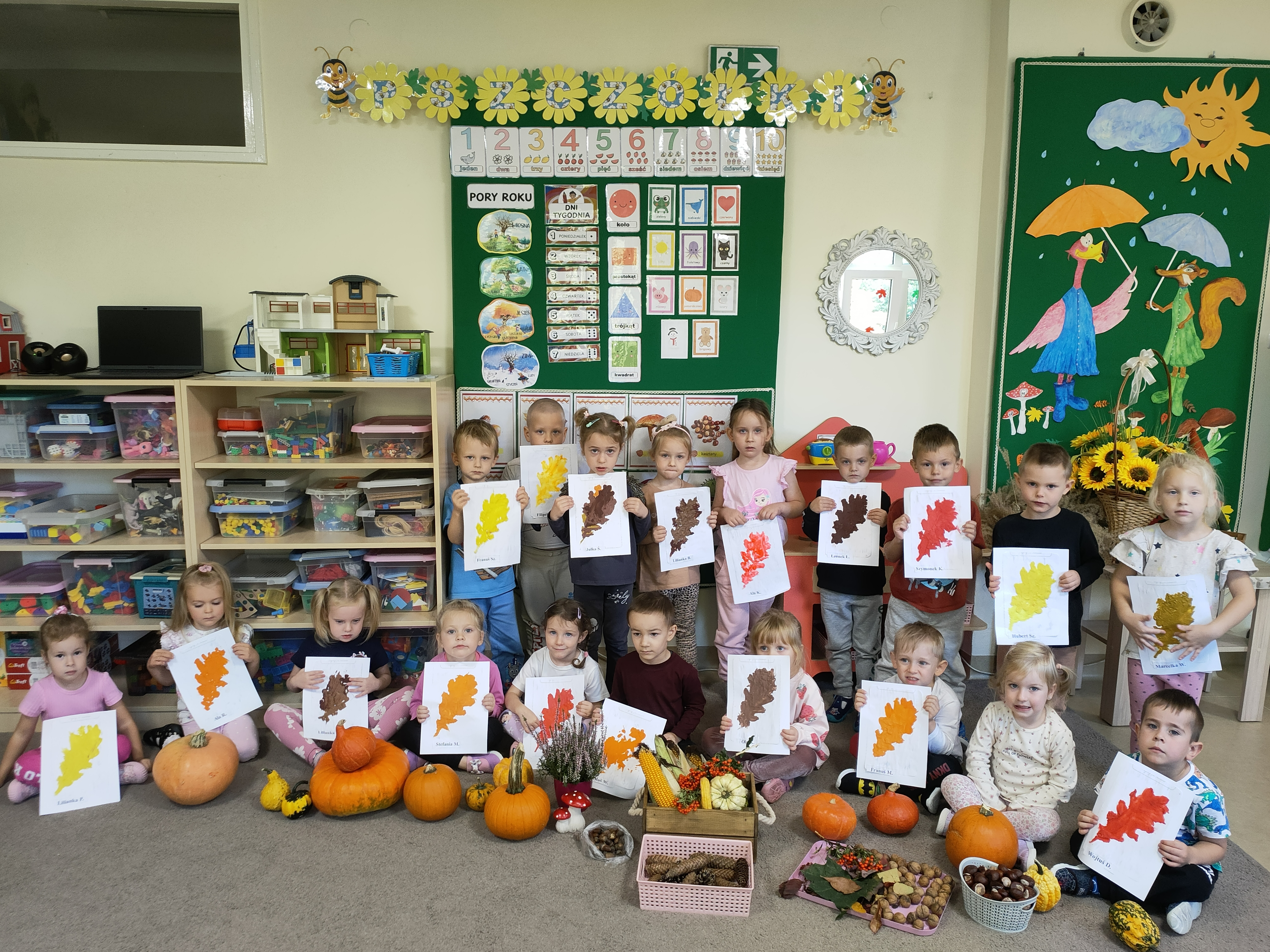 Dziś dzieci z grupy „Pszczółki” powitały pierwszy dzień jesieni. Podczas wspólnej zabawy wykorzystały przyniesione dary jesieni – przeliczały je, porównywały zbiory oraz układały zgodnie z pojęciami przestrzennymi: na, pod, obok, pomiędzy itp. Na zakończenie zajęć dzieci wykonały pracę plastyczną pt. „Kolorowy jesienny liść”.