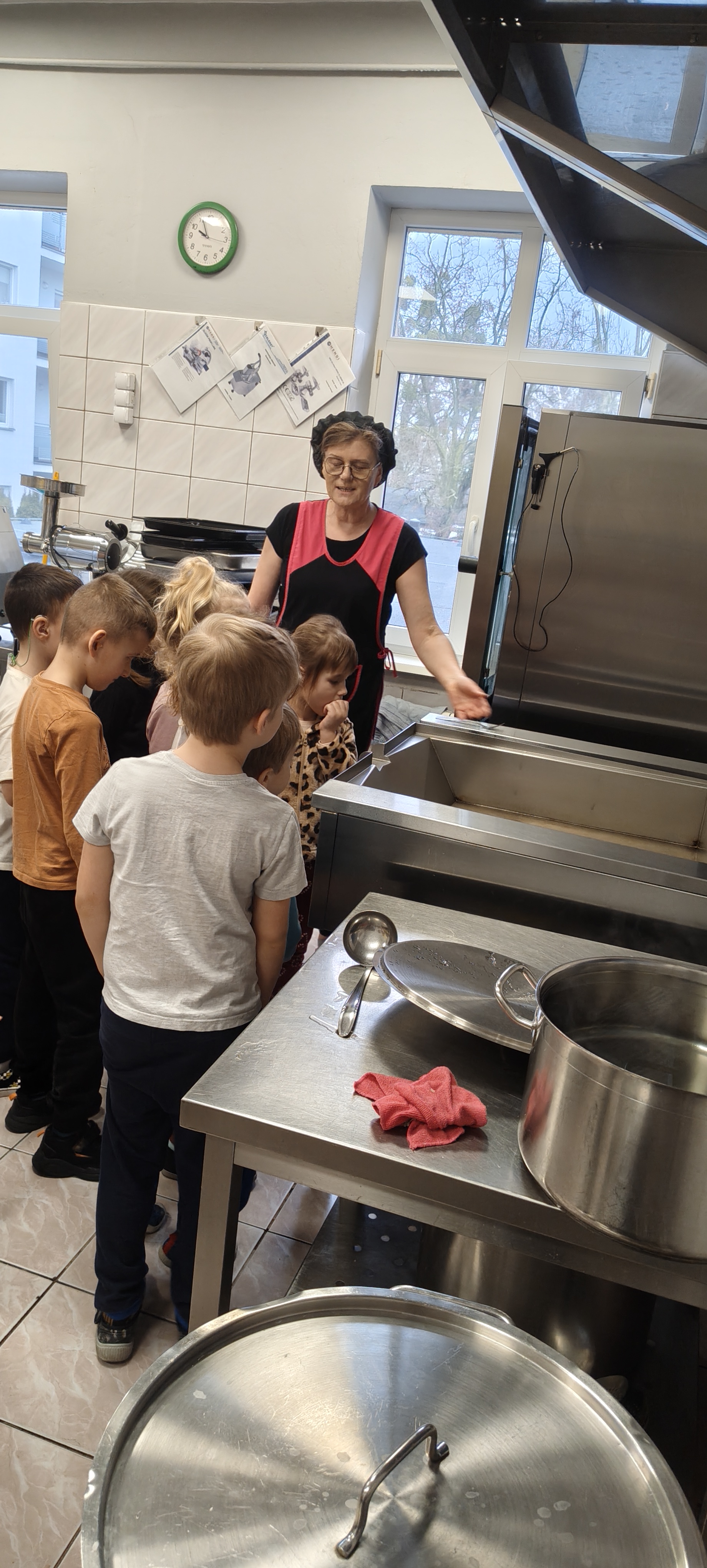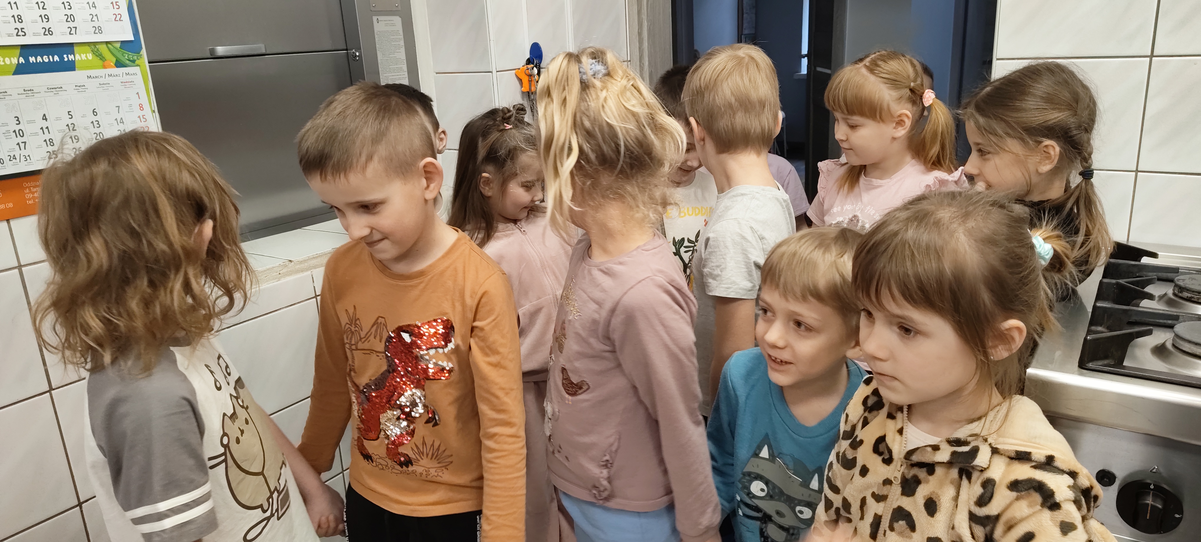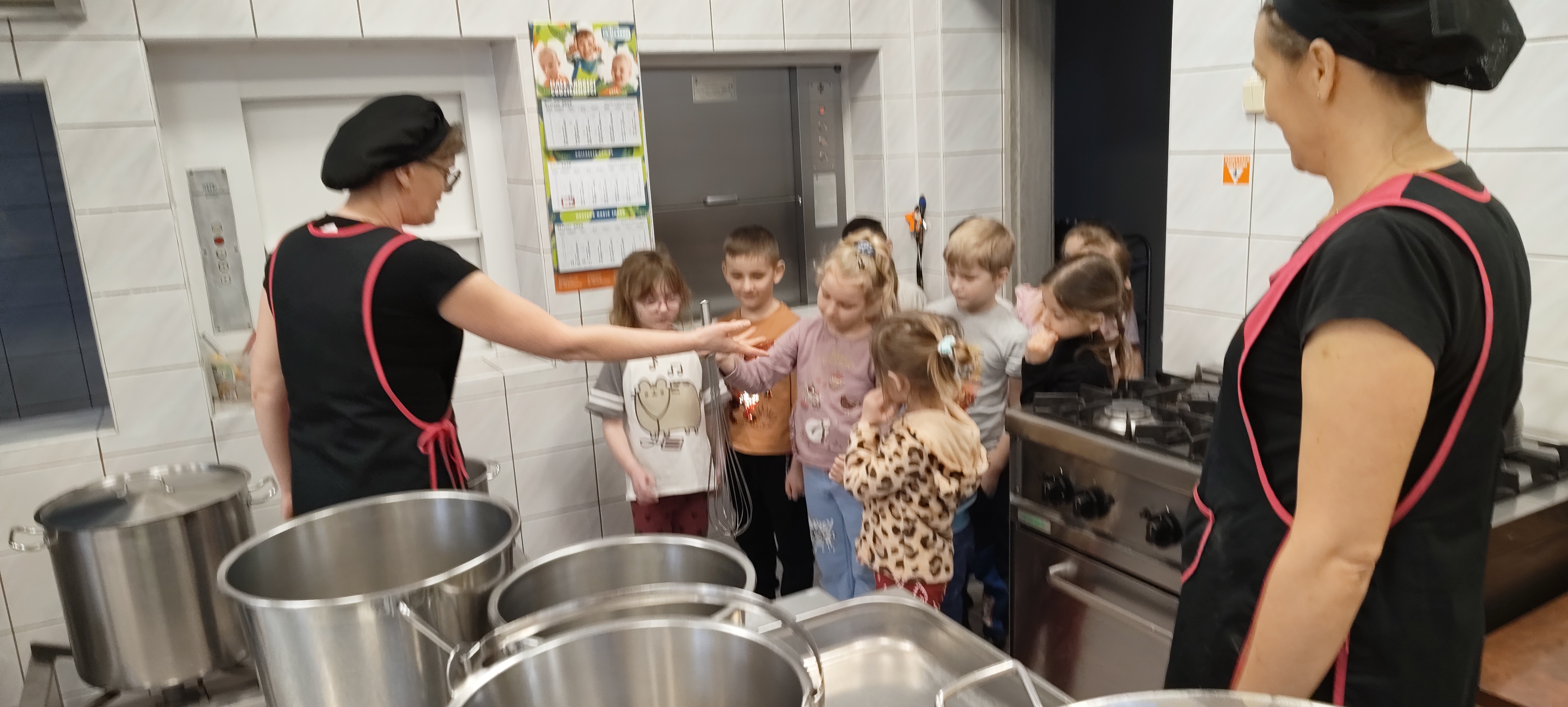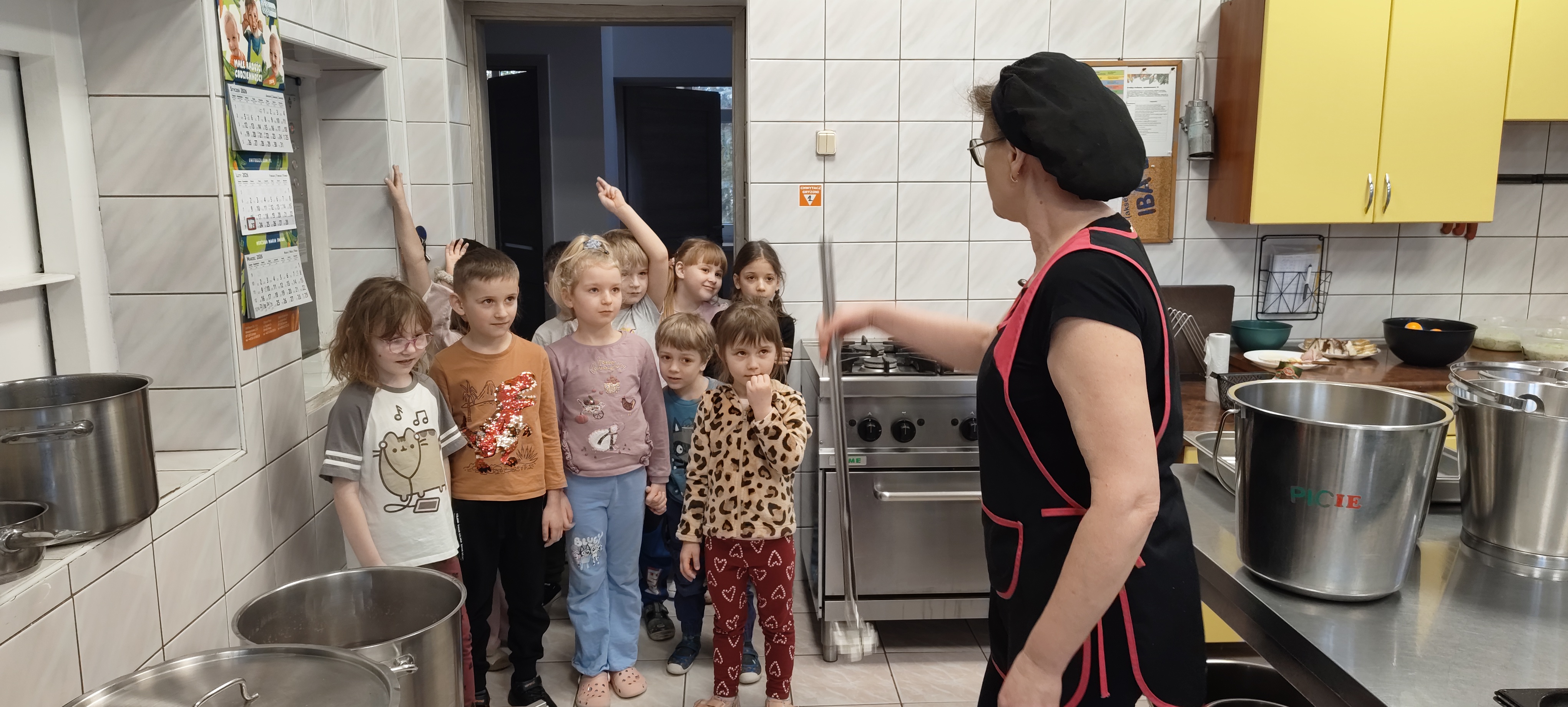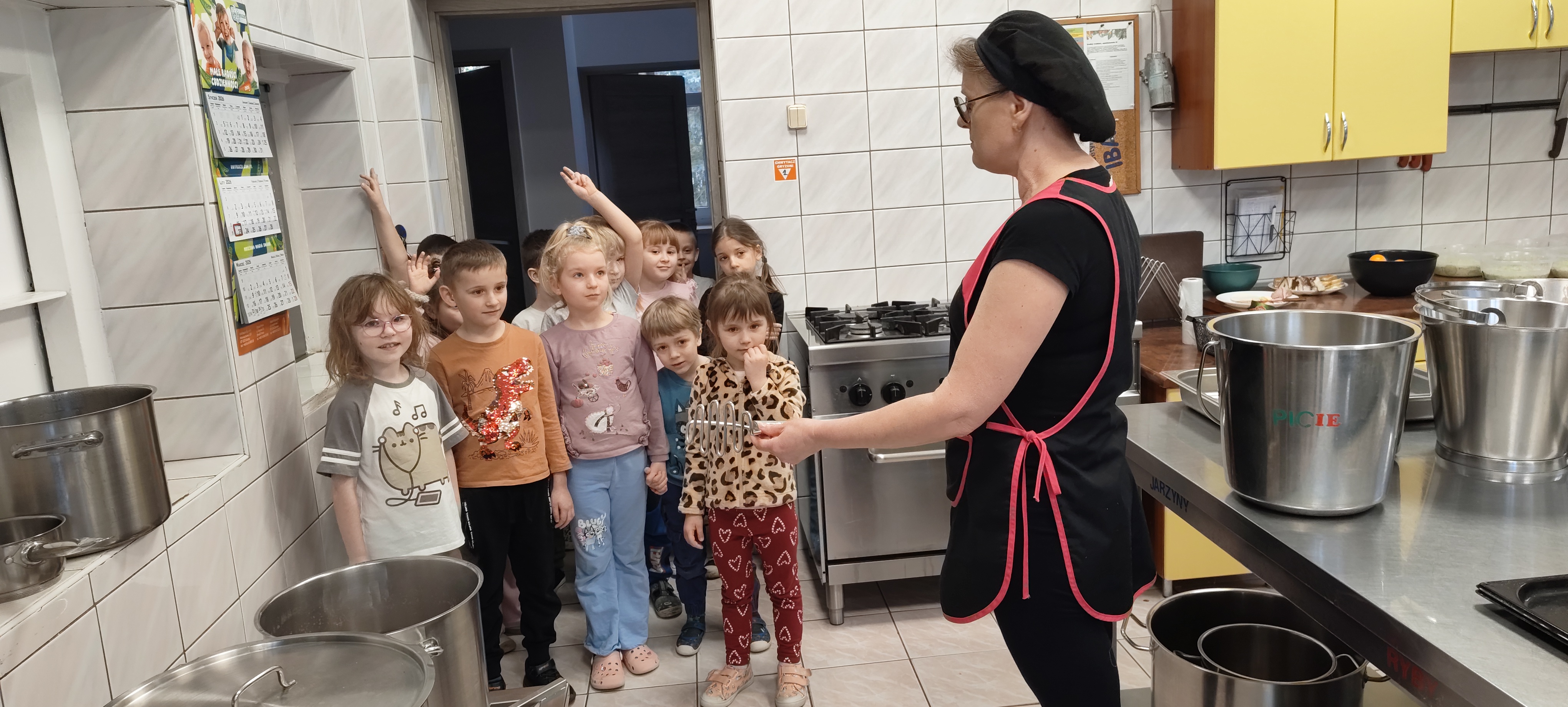 Dzisiaj Biedronki poznały warunki i zasady pracy w kuchni przedszkolnej. Cudowne Panie kucharki, opowiedziały o swojej pracy, narzędziach i sprzętach kuchennych, a dzieci zobowiązały się do szanowania ich pracy i zjadanie posiłków przez nie przygotowywanych