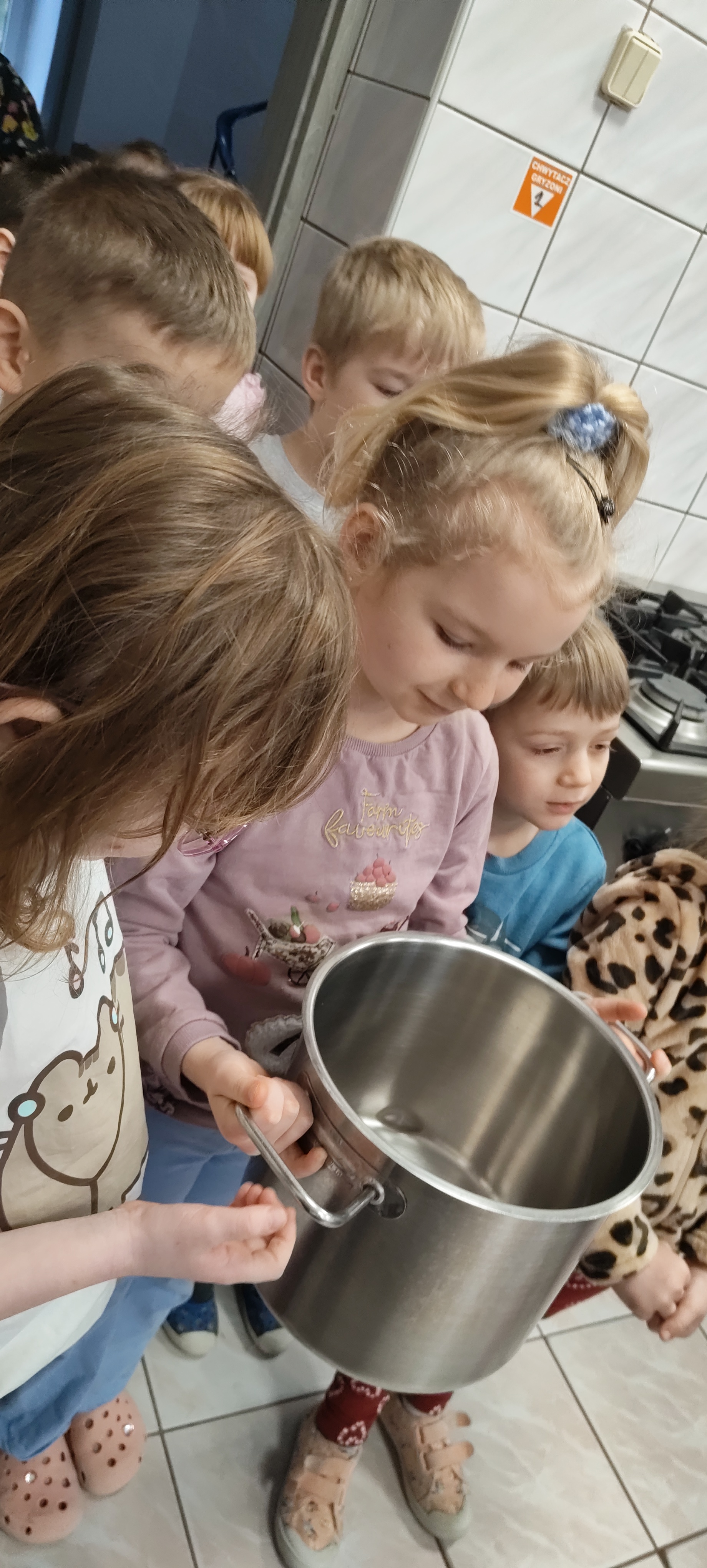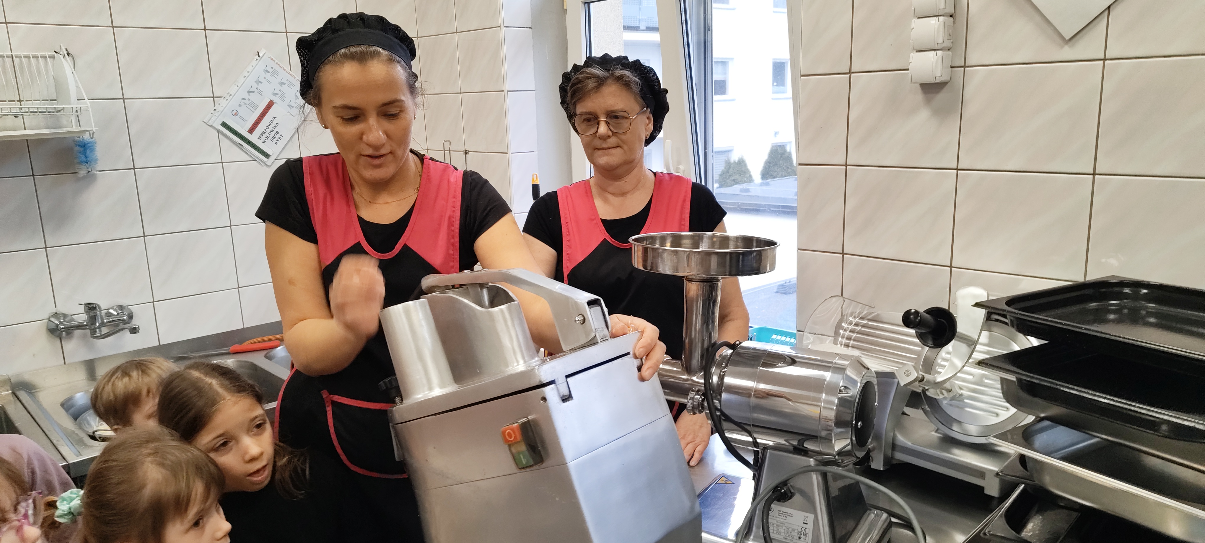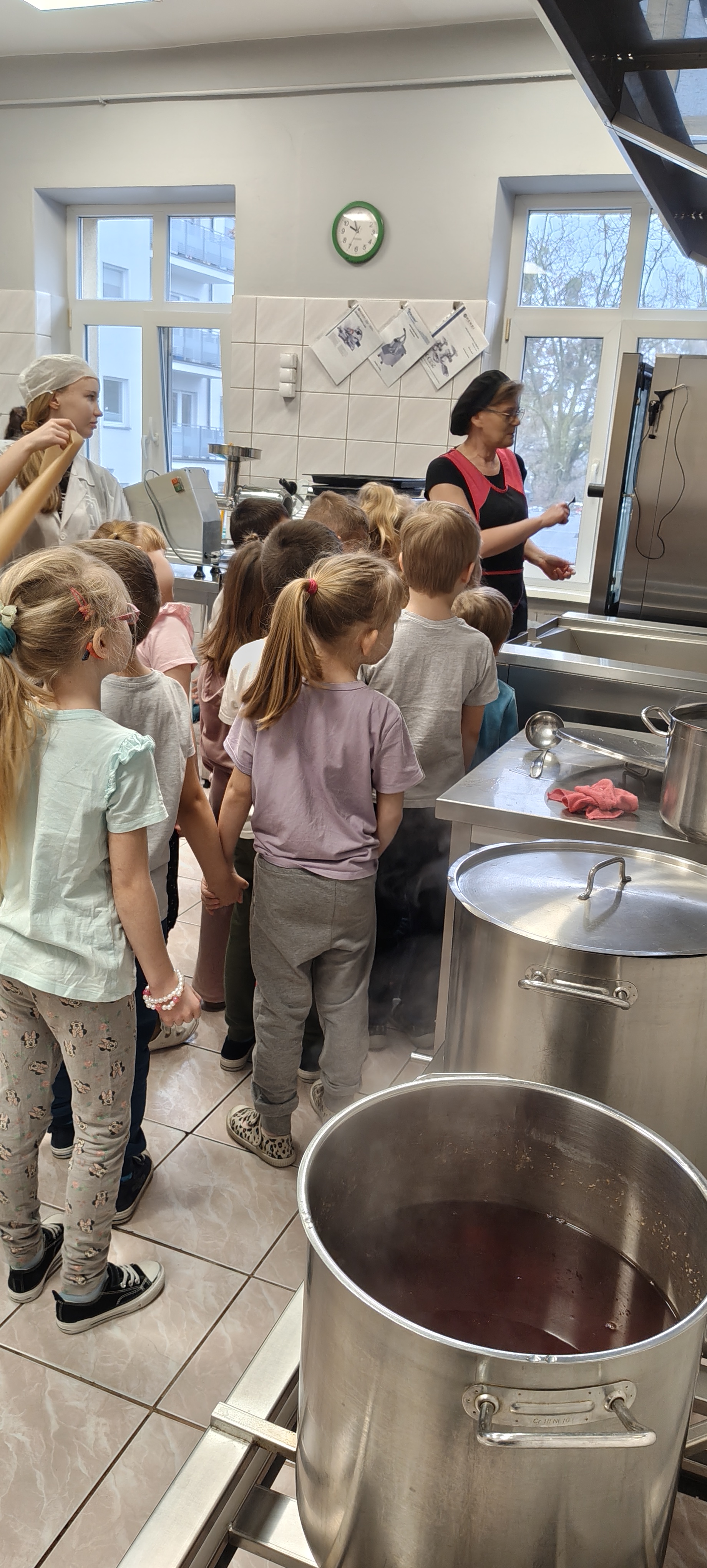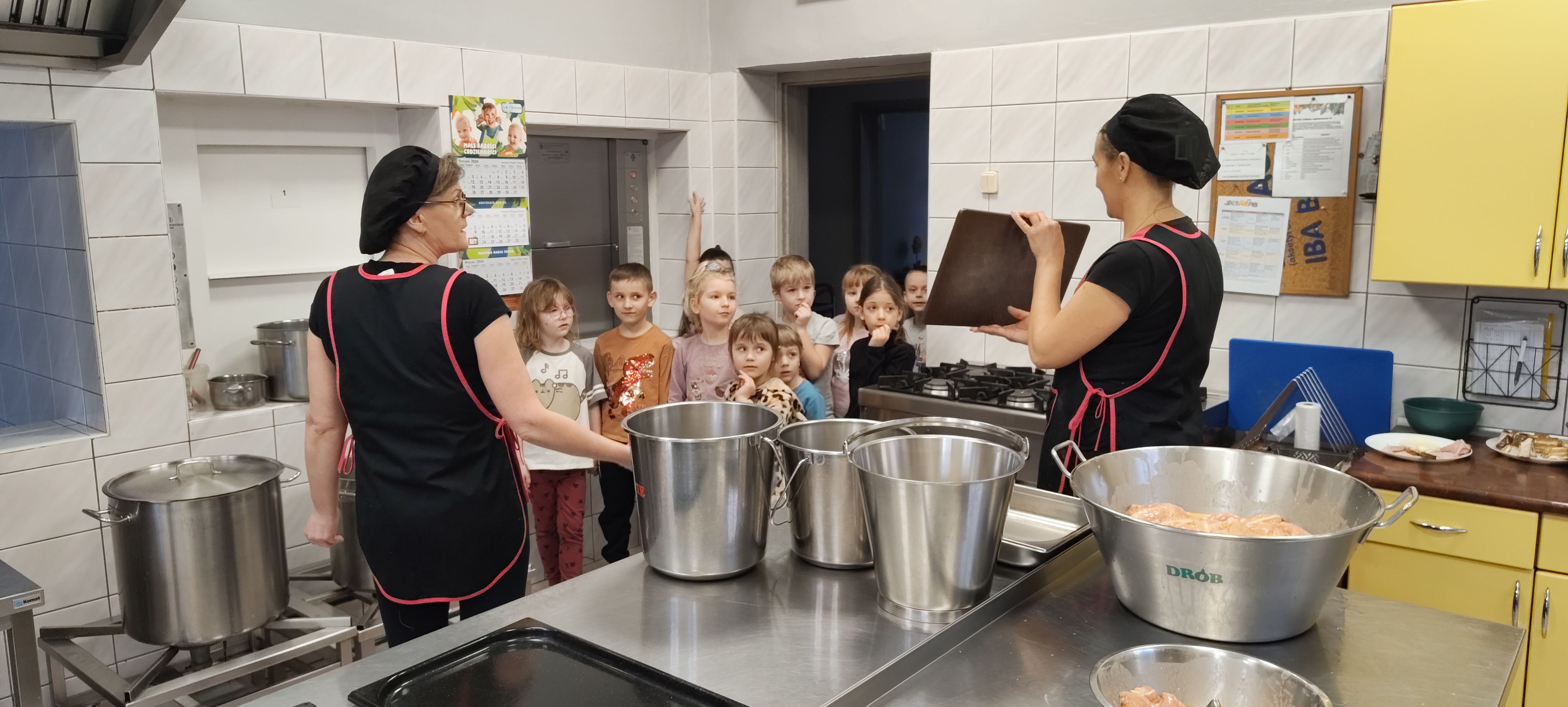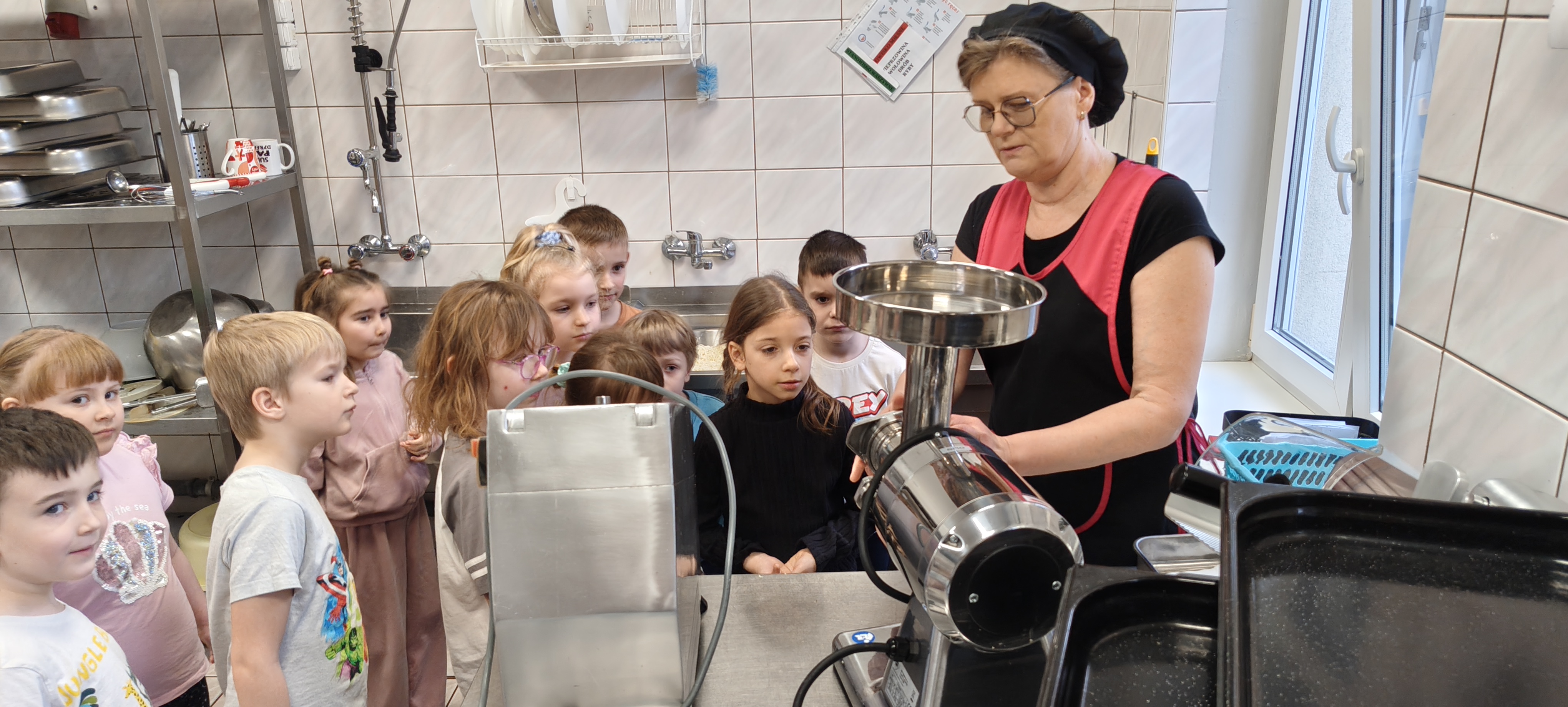 Dzisiaj Biedronki poznały warunki i zasady pracy w kuchni przedszkolnej. Cudowne Panie kucharki, opowiedziały o swojej pracy, narzędziach i sprzętach kuchennych, a dzieci zobowiązały się do szanowania ich pracy i zjadanie posiłków przez nie przygotowywanych
