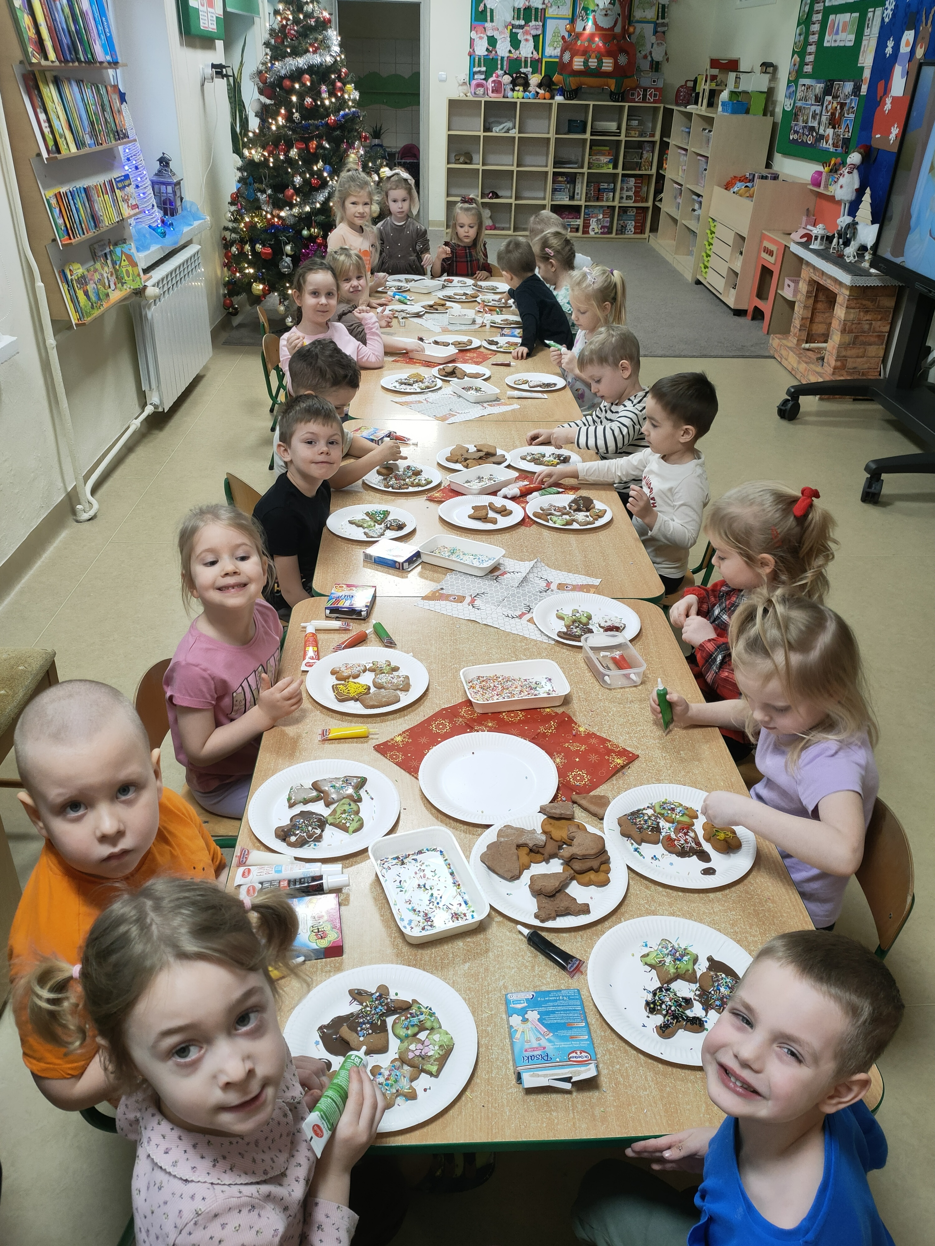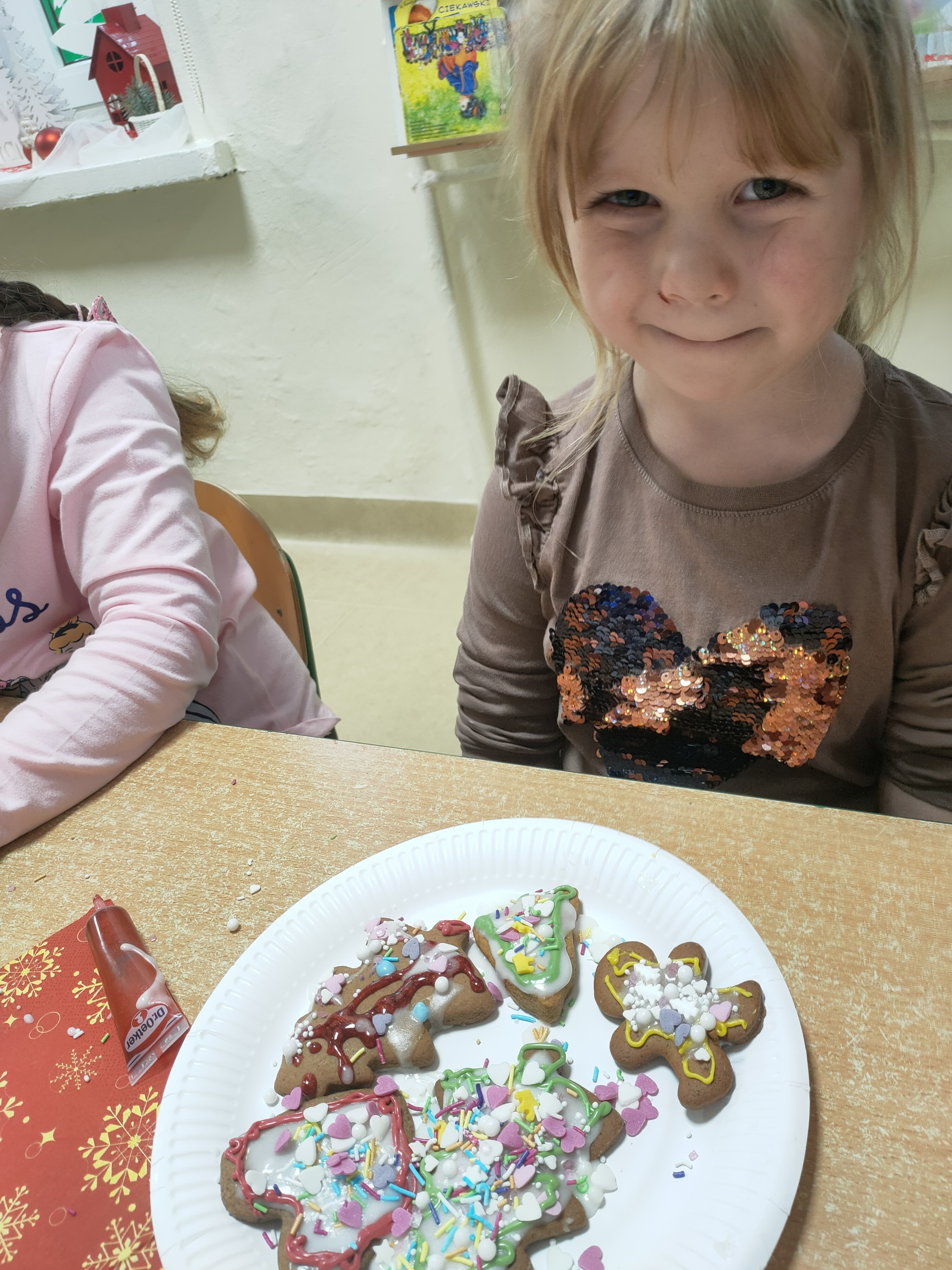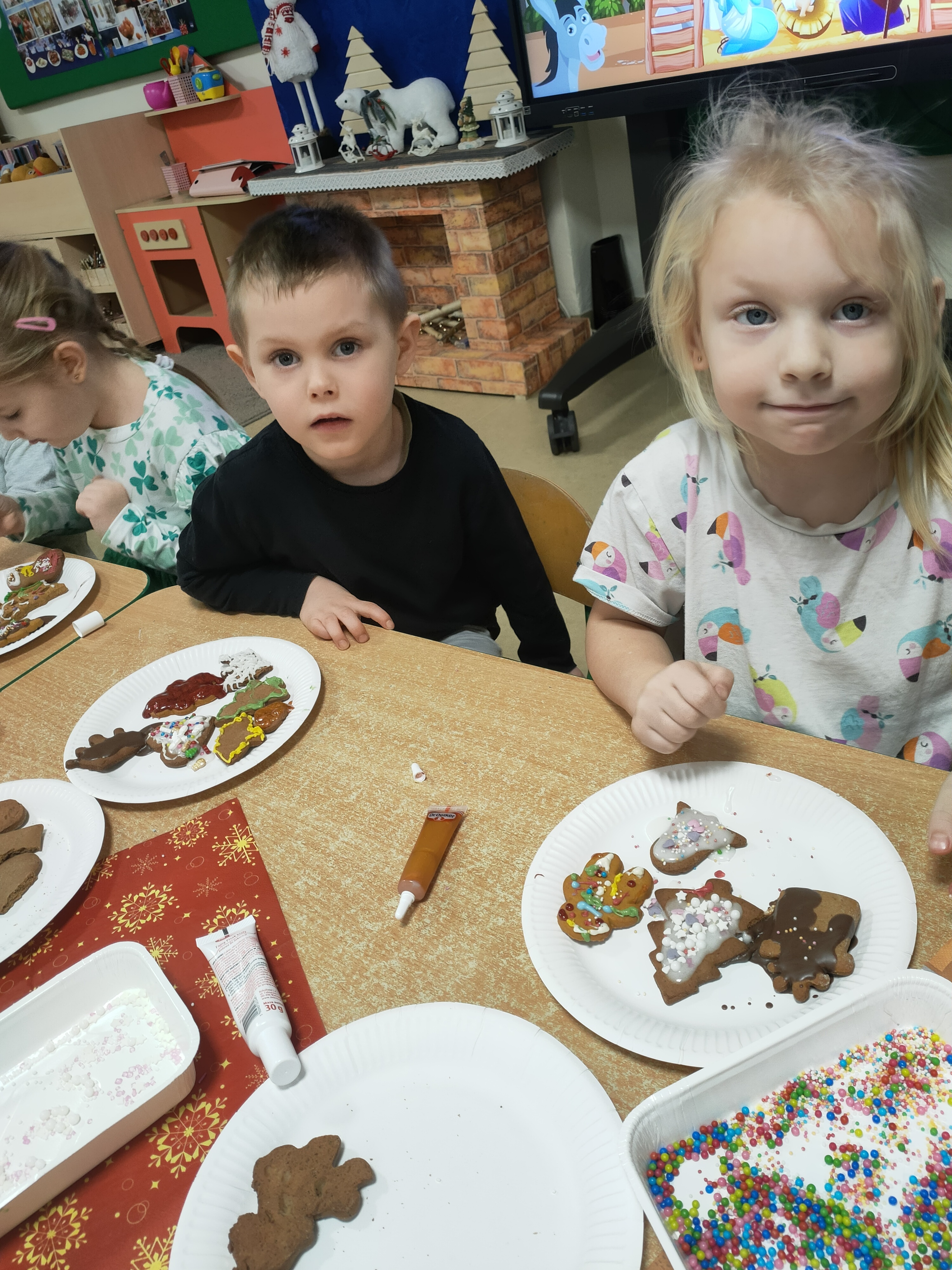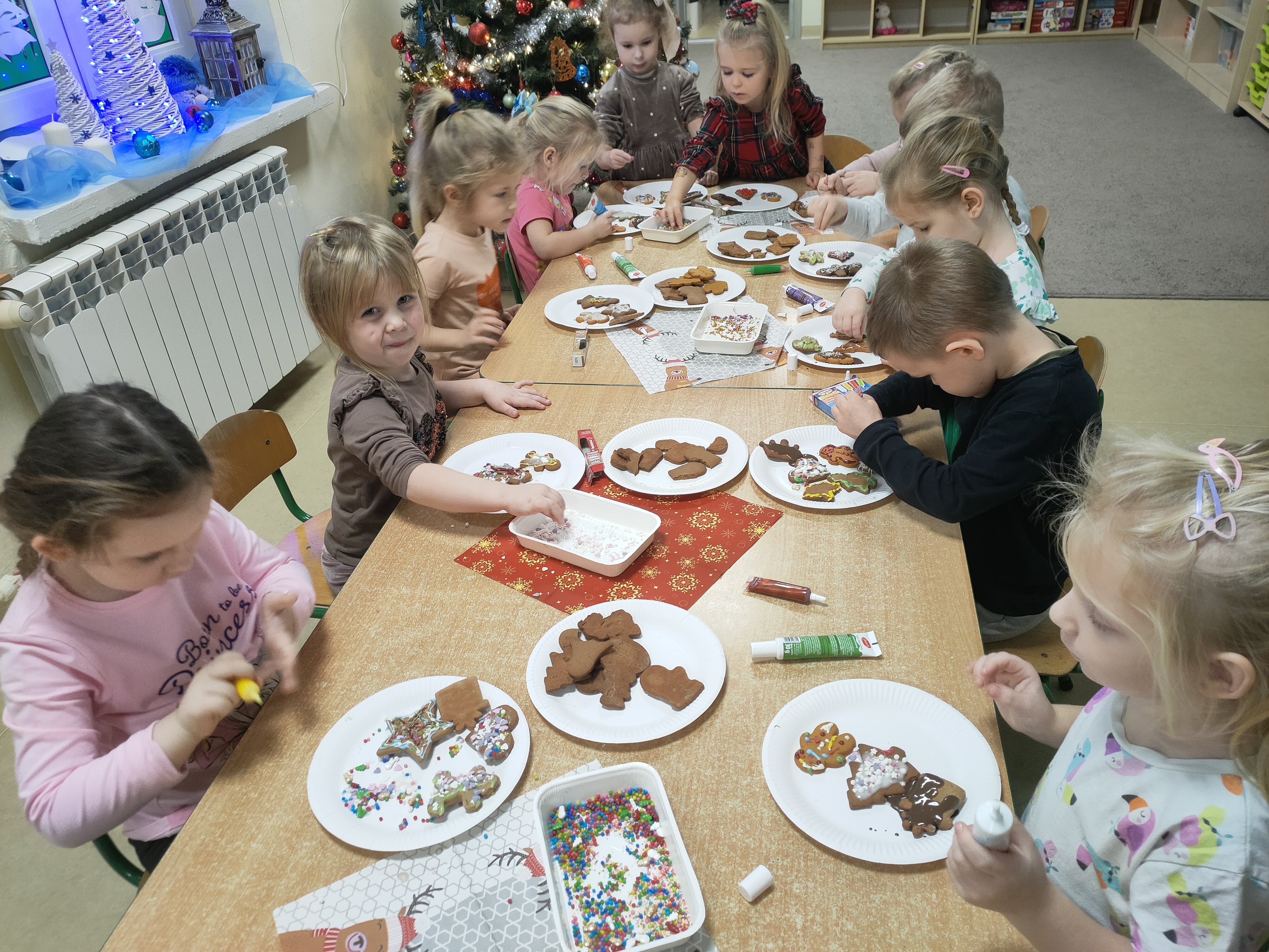 Nasza grupa przygotowywała się do zbliżających się świąt. Z tej okazji dzieci z zaangażowaniem wzięły się za porządki w sali oraz wykonywały choinki z figur geometrycznych. Aby jeszcze bardziej poczuć magię świąt, dziś ozdabialiśmy i dekorowaliśmy pierniczki, które można podziwiać na zdjęciach.