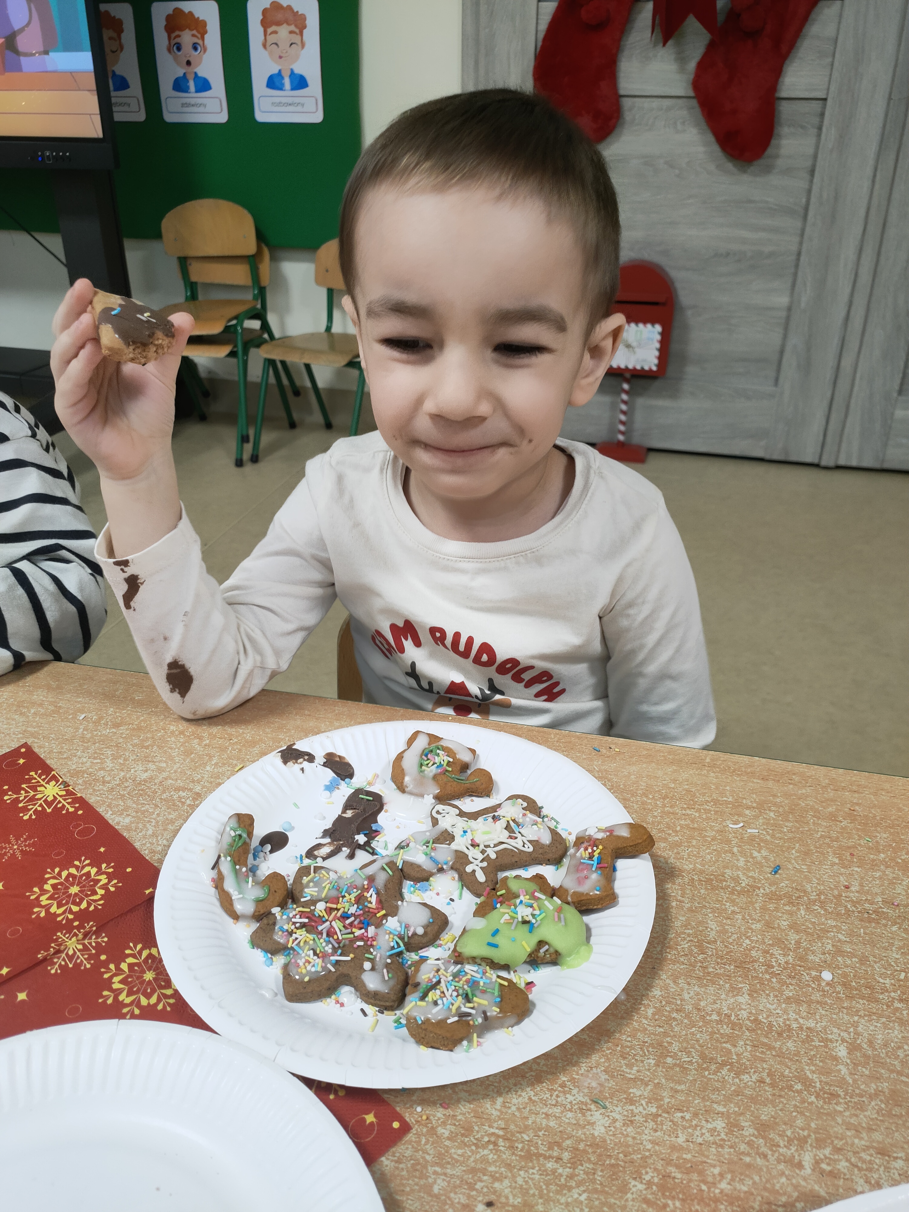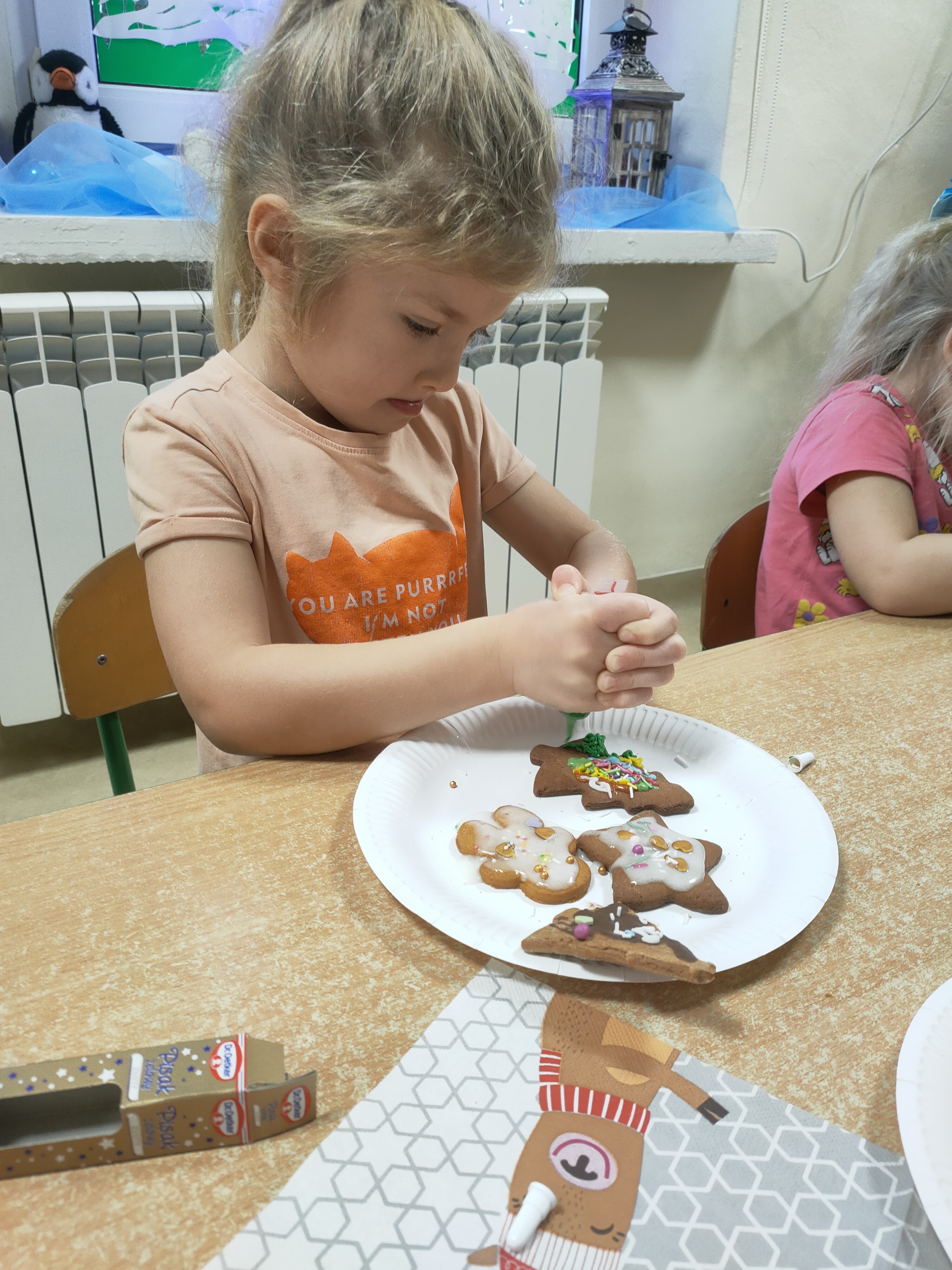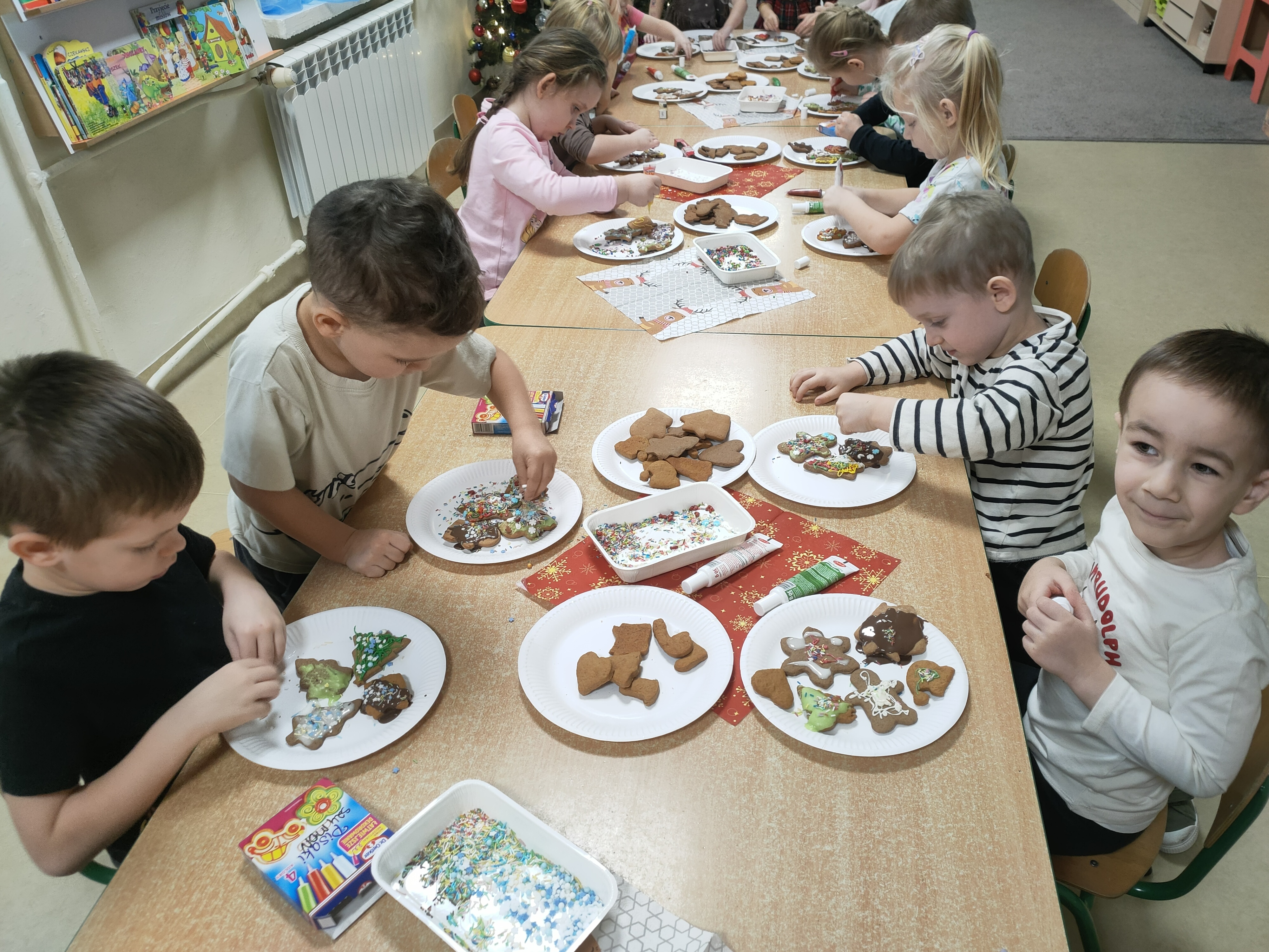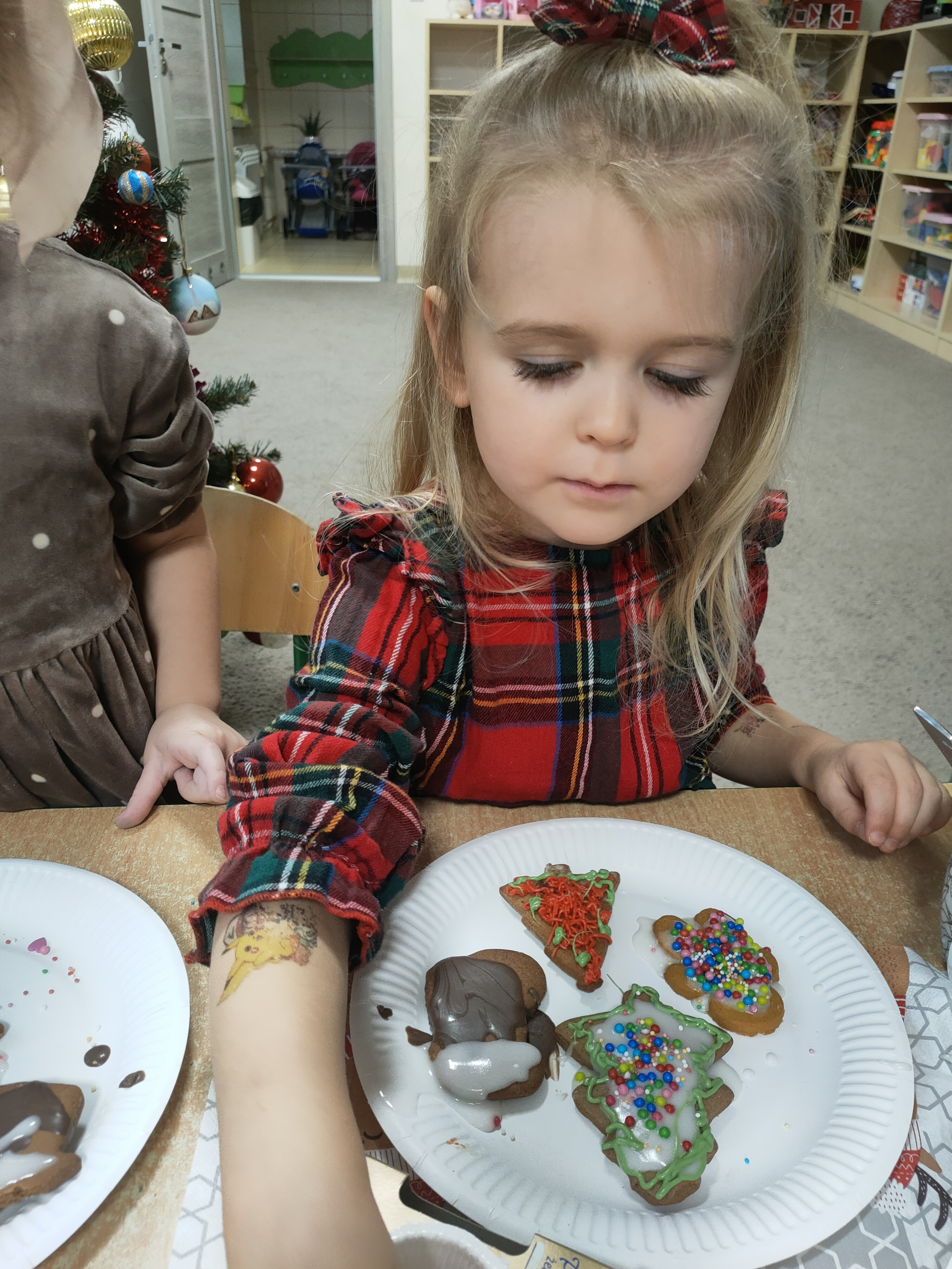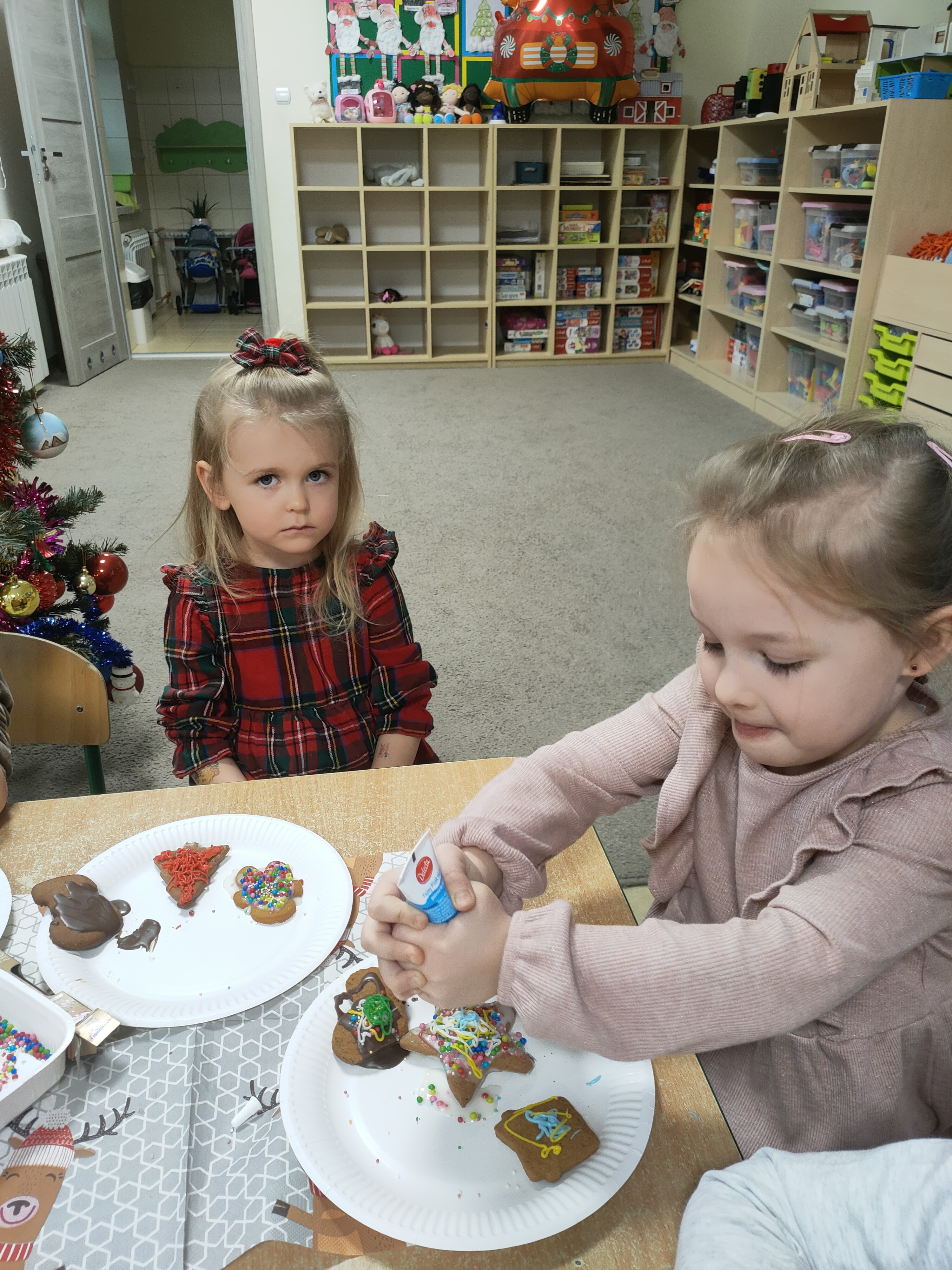 Nasza grupa przygotowywała się do zbliżających się świąt. Z tej okazji dzieci z zaangażowaniem wzięły się za porządki w sali oraz wykonywały choinki z figur geometrycznych. Aby jeszcze bardziej poczuć magię świąt, dziś ozdabialiśmy i dekorowaliśmy pierniczki, które można podziwiać na zdjęciach.