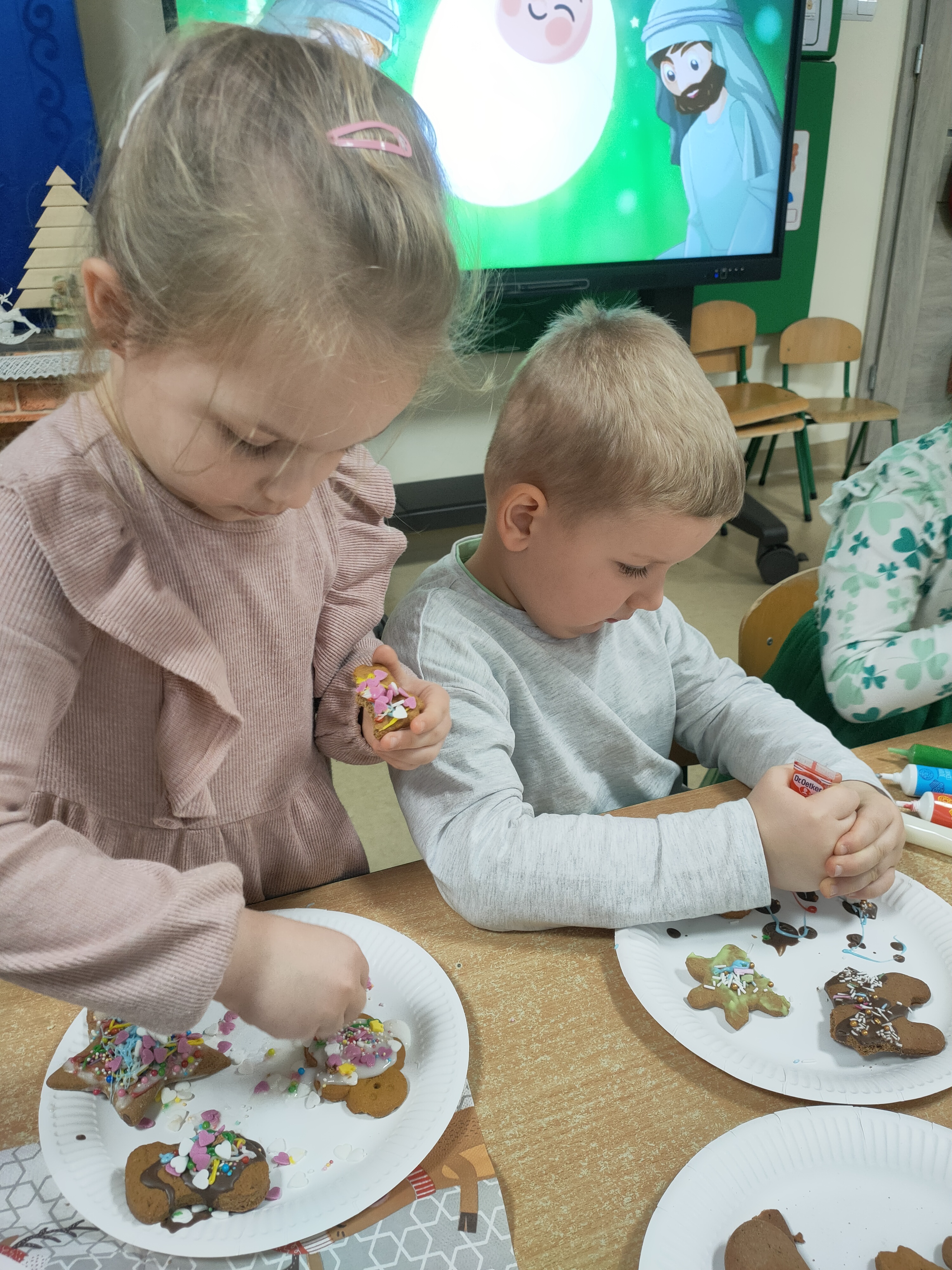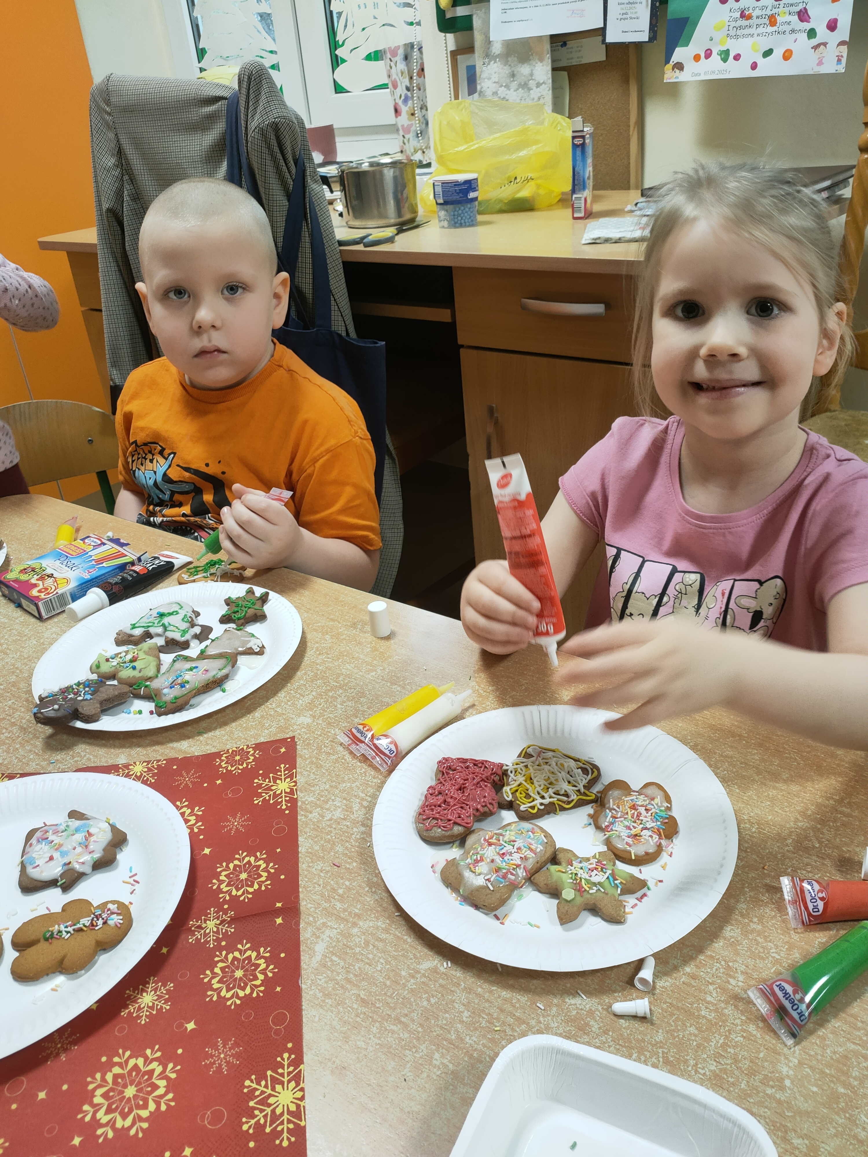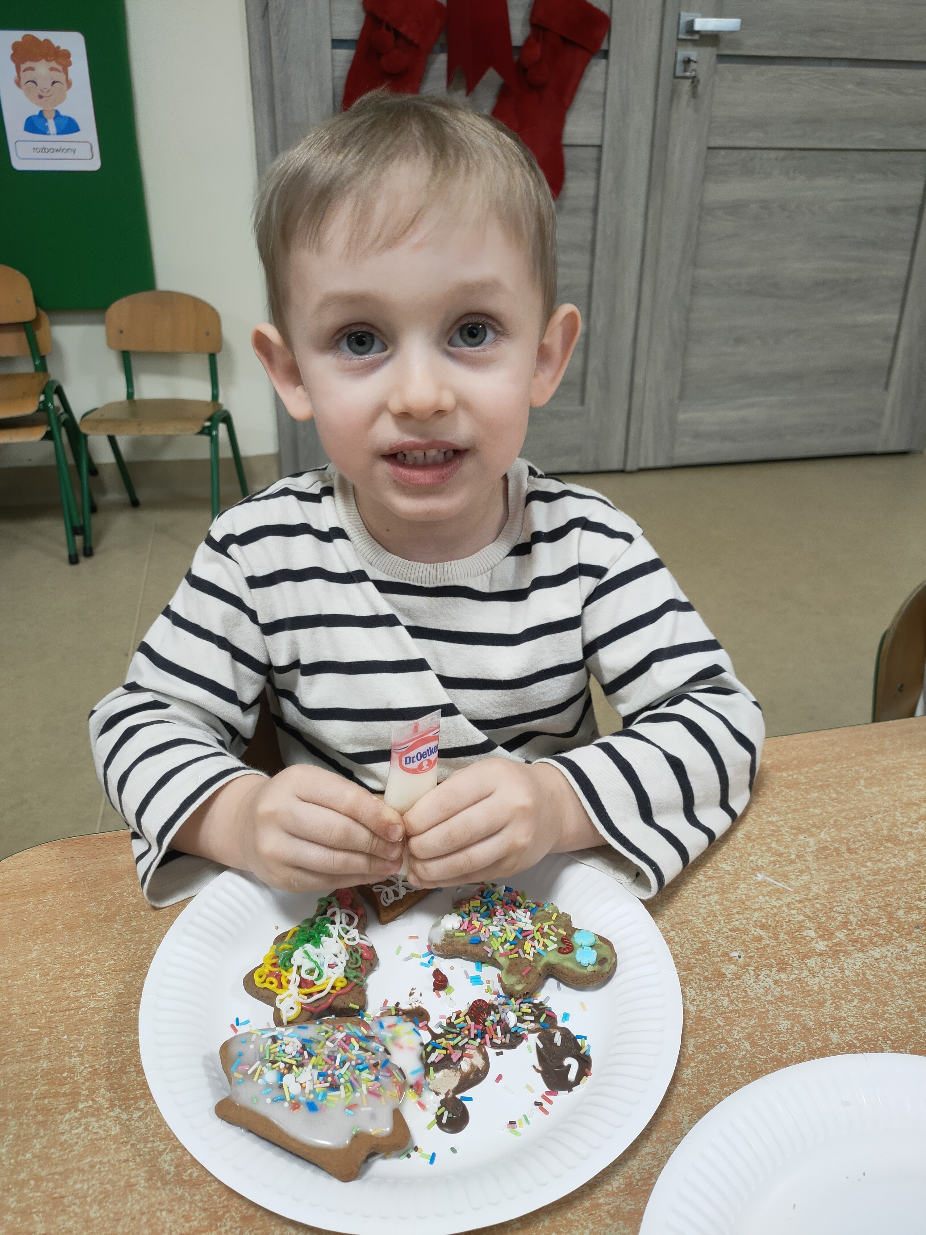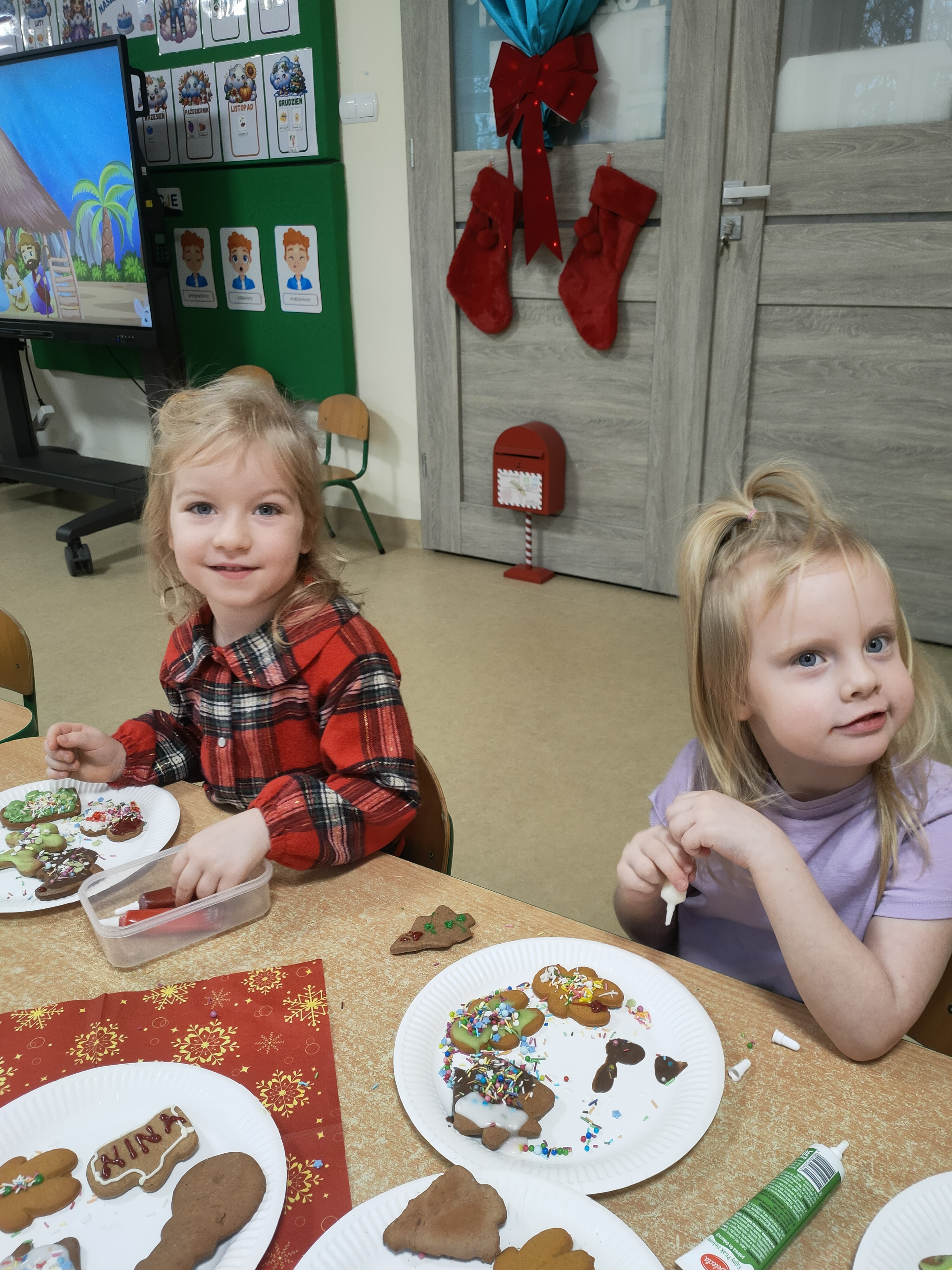 Nasza grupa przygotowywała się do zbliżających się świąt. Z tej okazji dzieci z zaangażowaniem wzięły się za porządki w sali oraz wykonywały choinki z figur geometrycznych. Aby jeszcze bardziej poczuć magię świąt, dziś ozdabialiśmy i dekorowaliśmy pierniczki, które można podziwiać na zdjęciach.