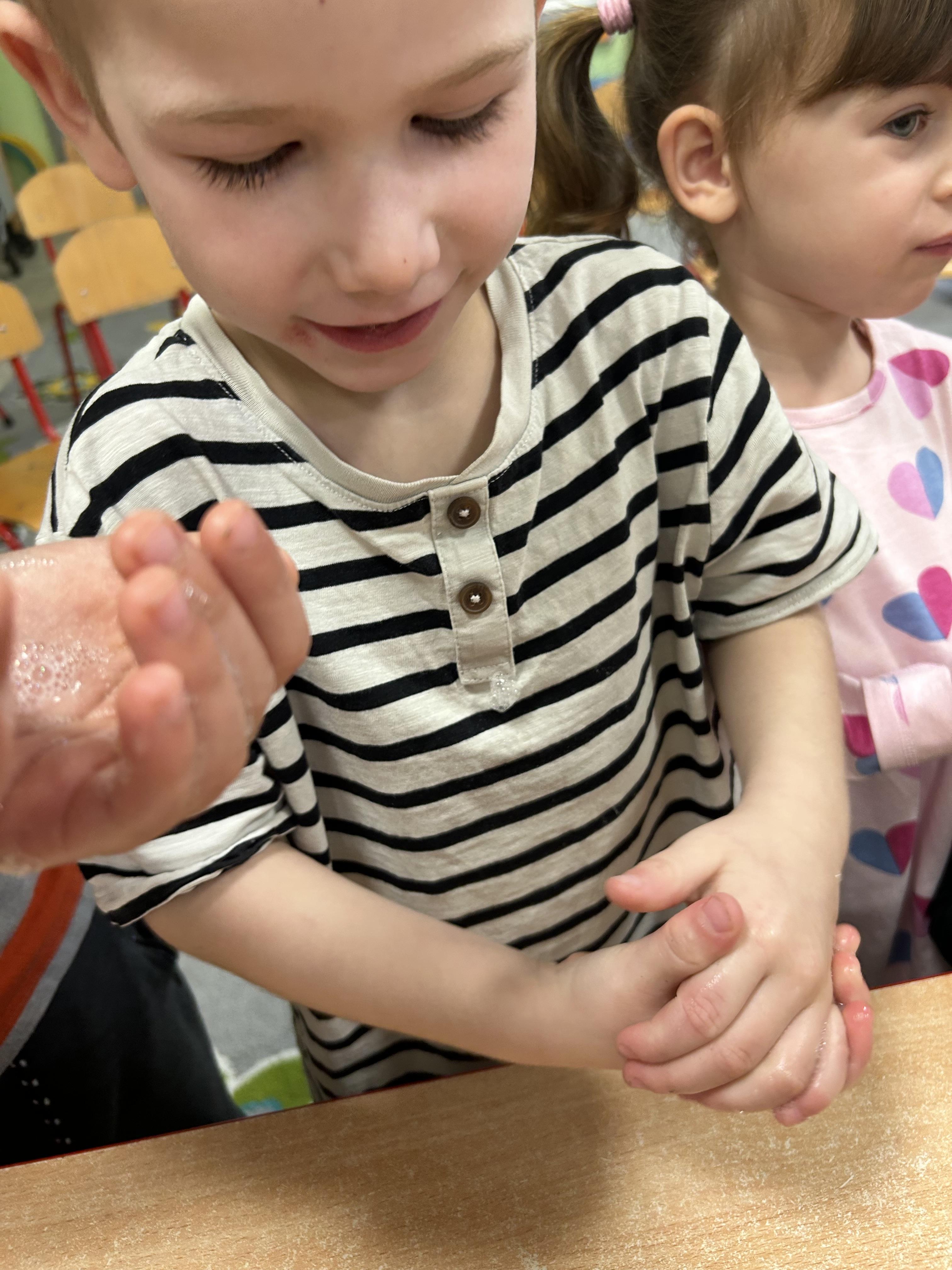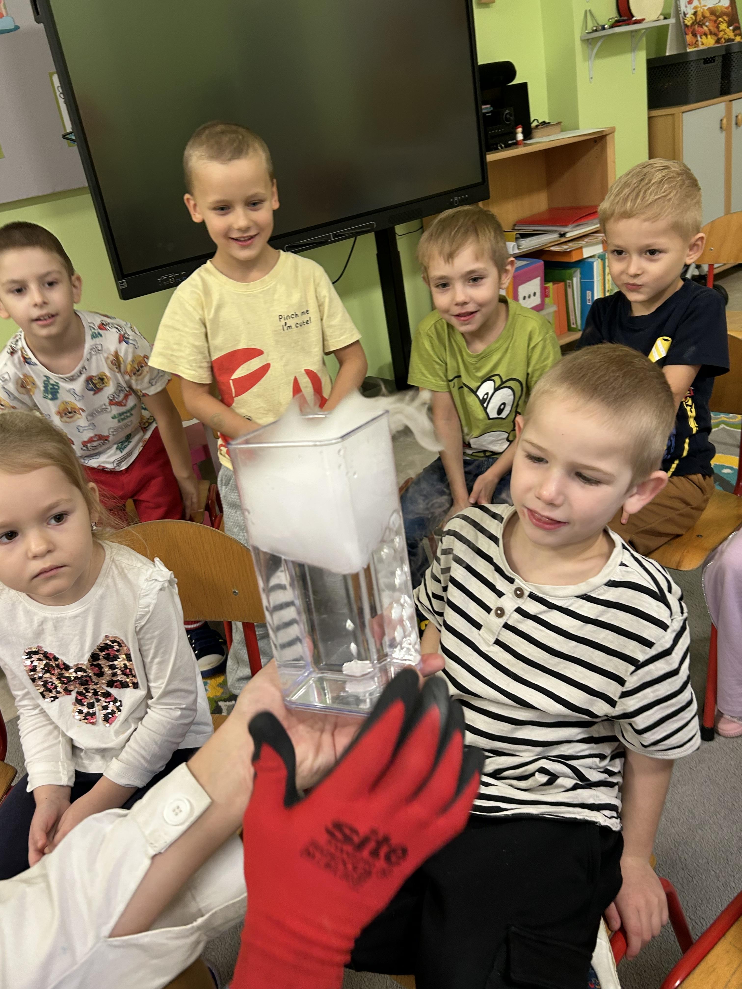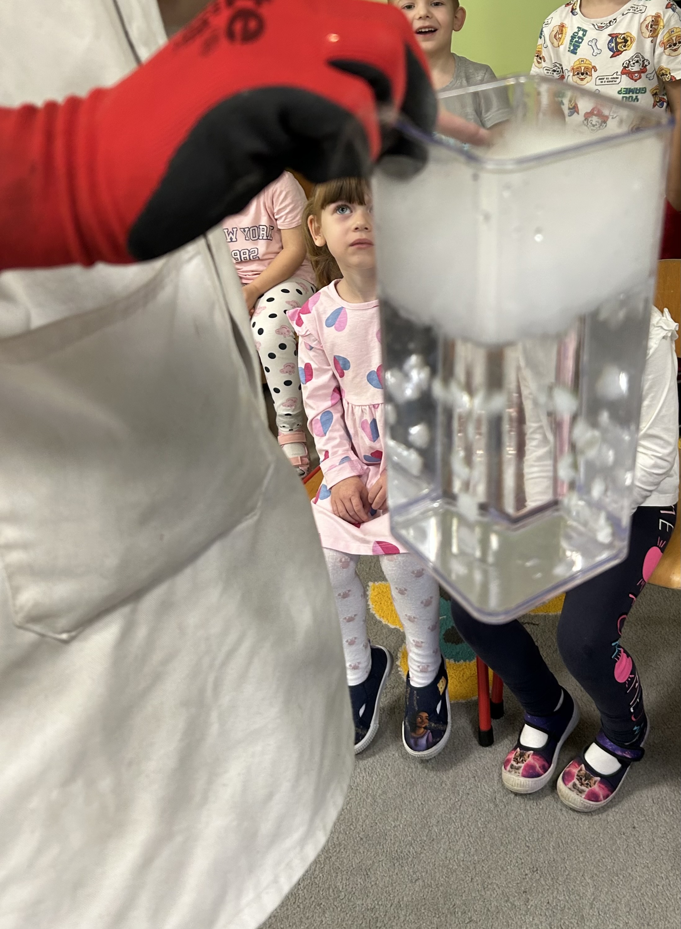 Gościem w naszej grupie był pan Bartek, który przygotował dla dzieci ciekawe doświadczenia z wodą i azotem. Przedszkolaki mogły samodzielnie dotykać wodę, obserwować jej zachowanie oraz zobaczyć, jak w prosty sposób powstaje gaz. Eksperymenty wzbudziły w dzieciach duże zainteresowanie i radość z odkrywania nowych zjawisk.