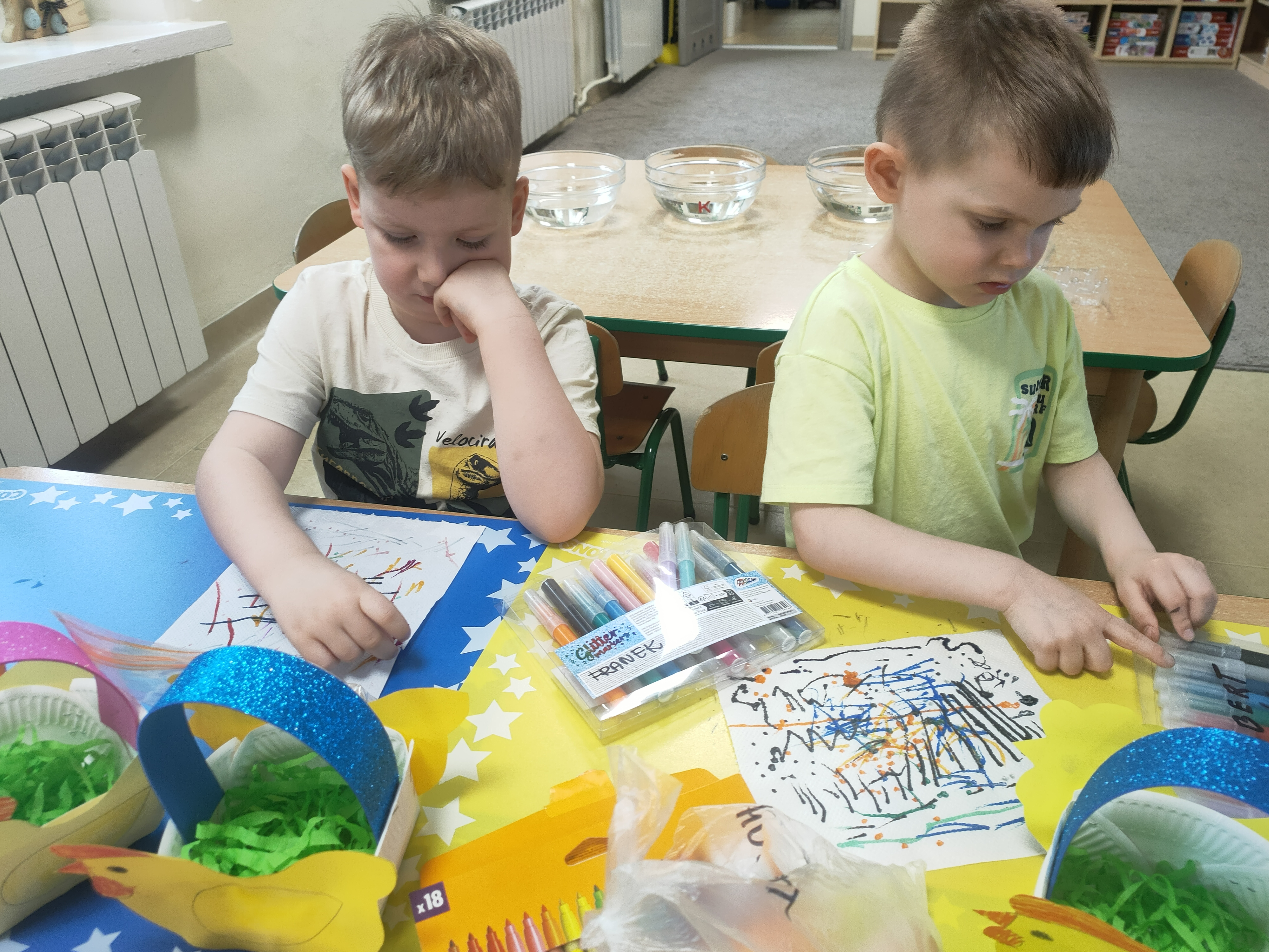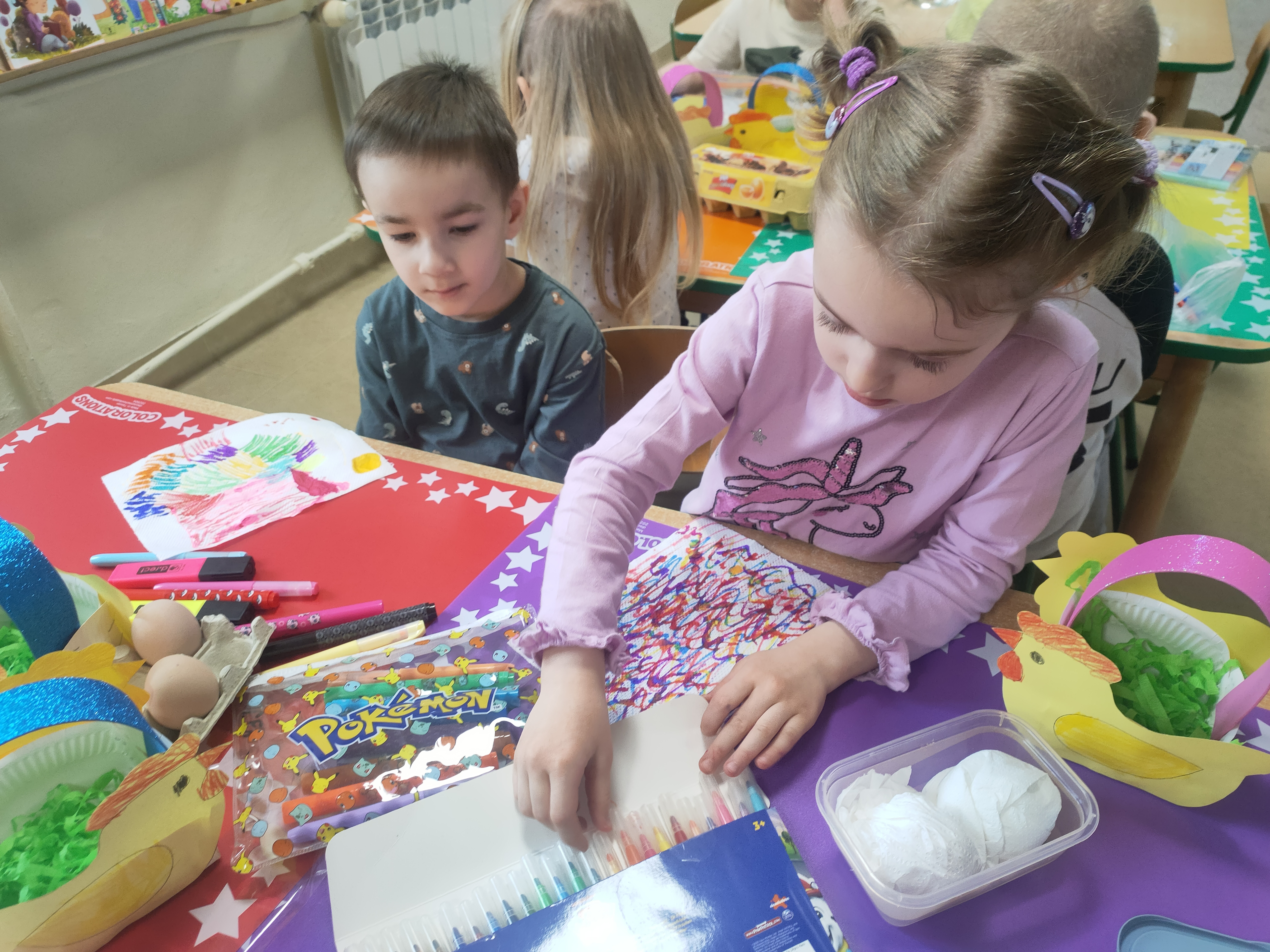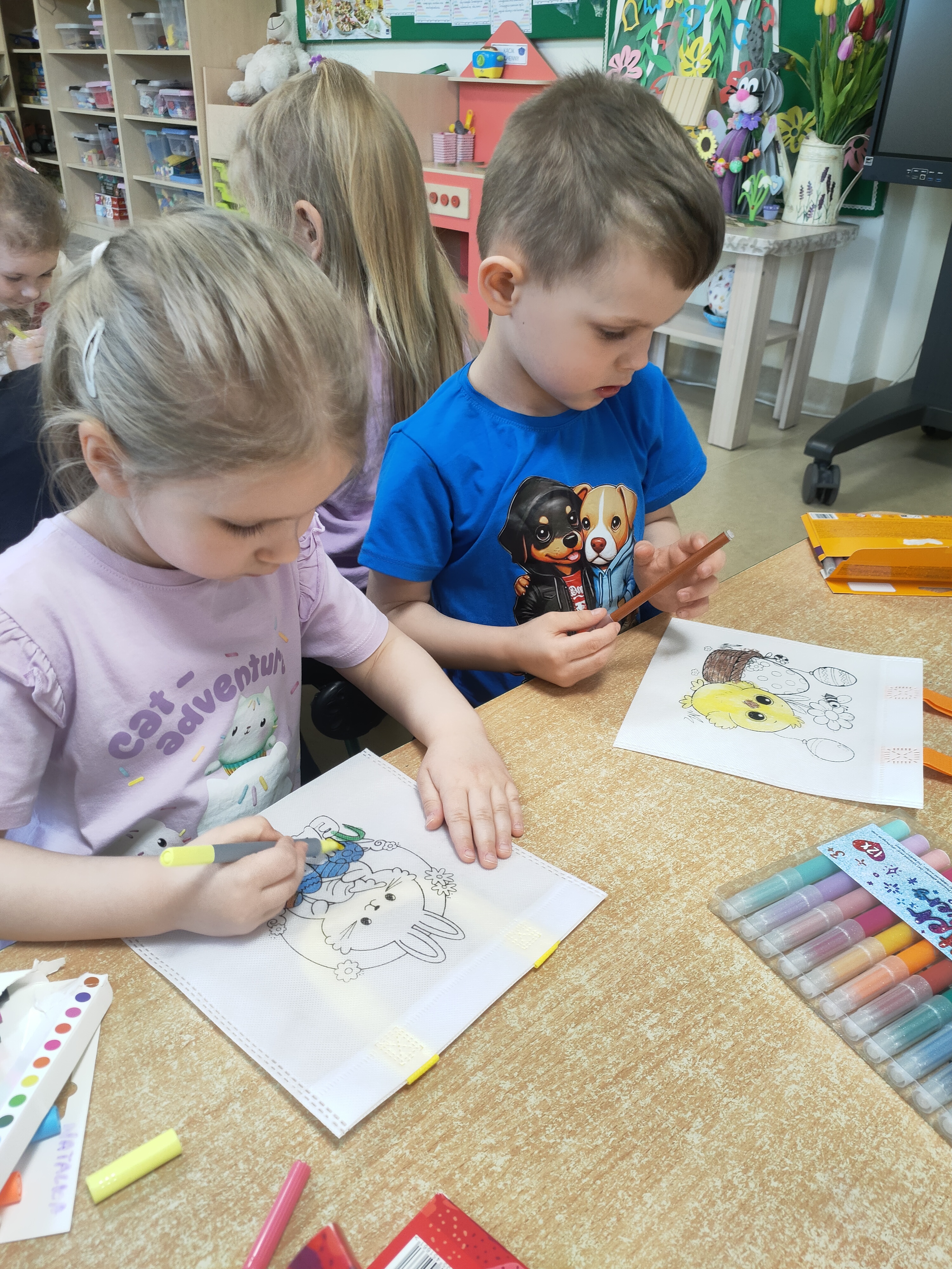 W tym tygodniu nasza grupa poświęciła czas tematyce związanej z Wielkanocą. Rozmawialiśmy o tradycjach wielkanocnych oraz o symbolach związanych z tym wyjątkowym świętem. Dzieci z dużym zaangażowaniem brały udział w różnych aktywnościach plastycznych. Wspólnie wykonywaliśmy wielkanocne torby, które dzieci ozdabiały według własnych pomysłów, a także malowaliśmy kolorowe pisanki. Zajęcia sprawiły dzieciom wiele radości i pozwoliły rozwijać ich kreatywność oraz zdolności manualne.