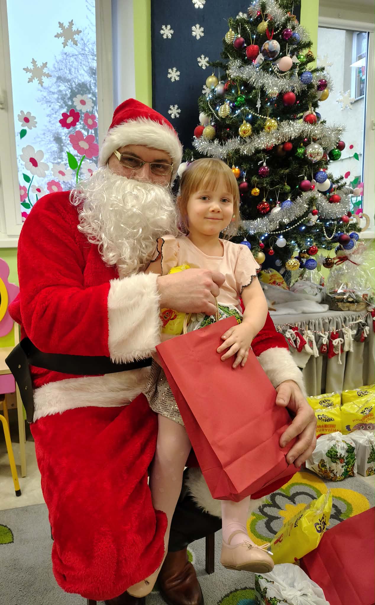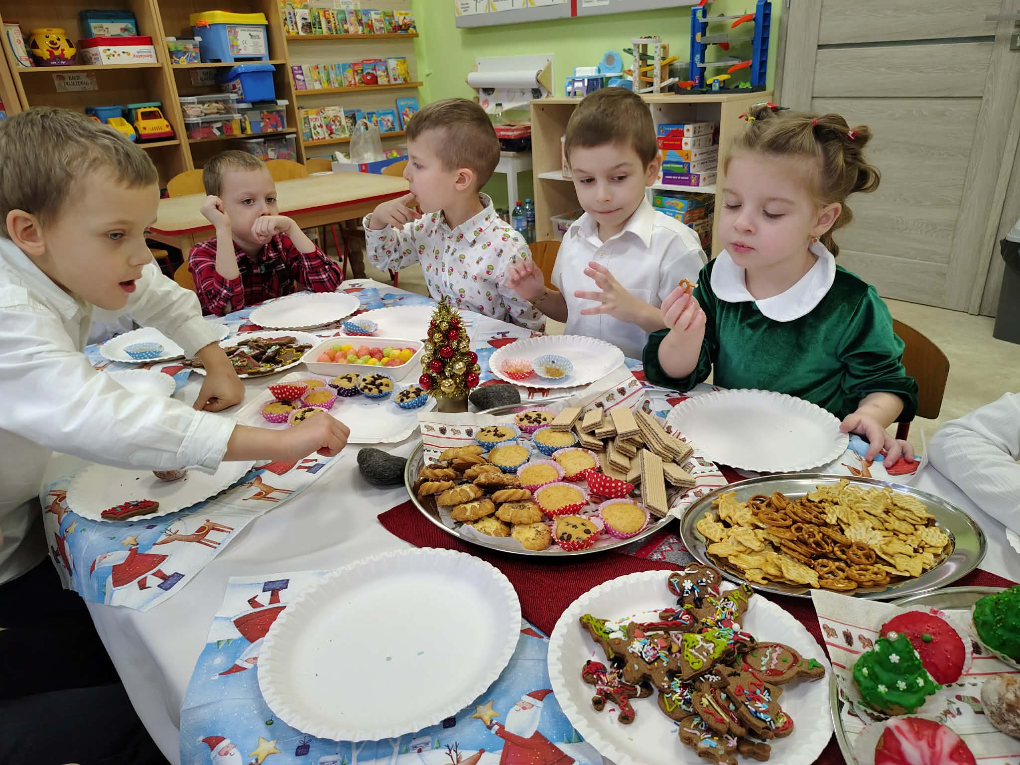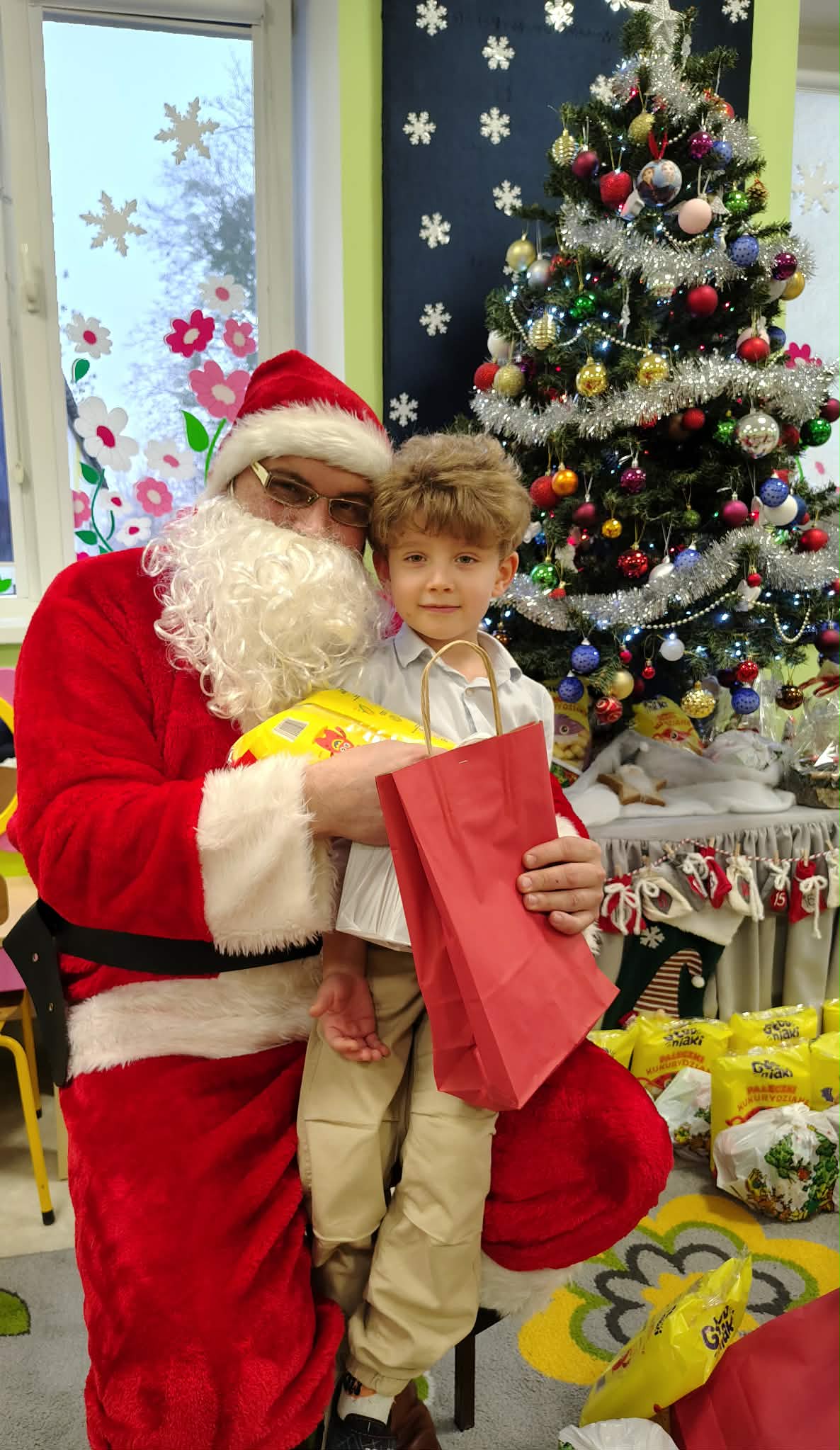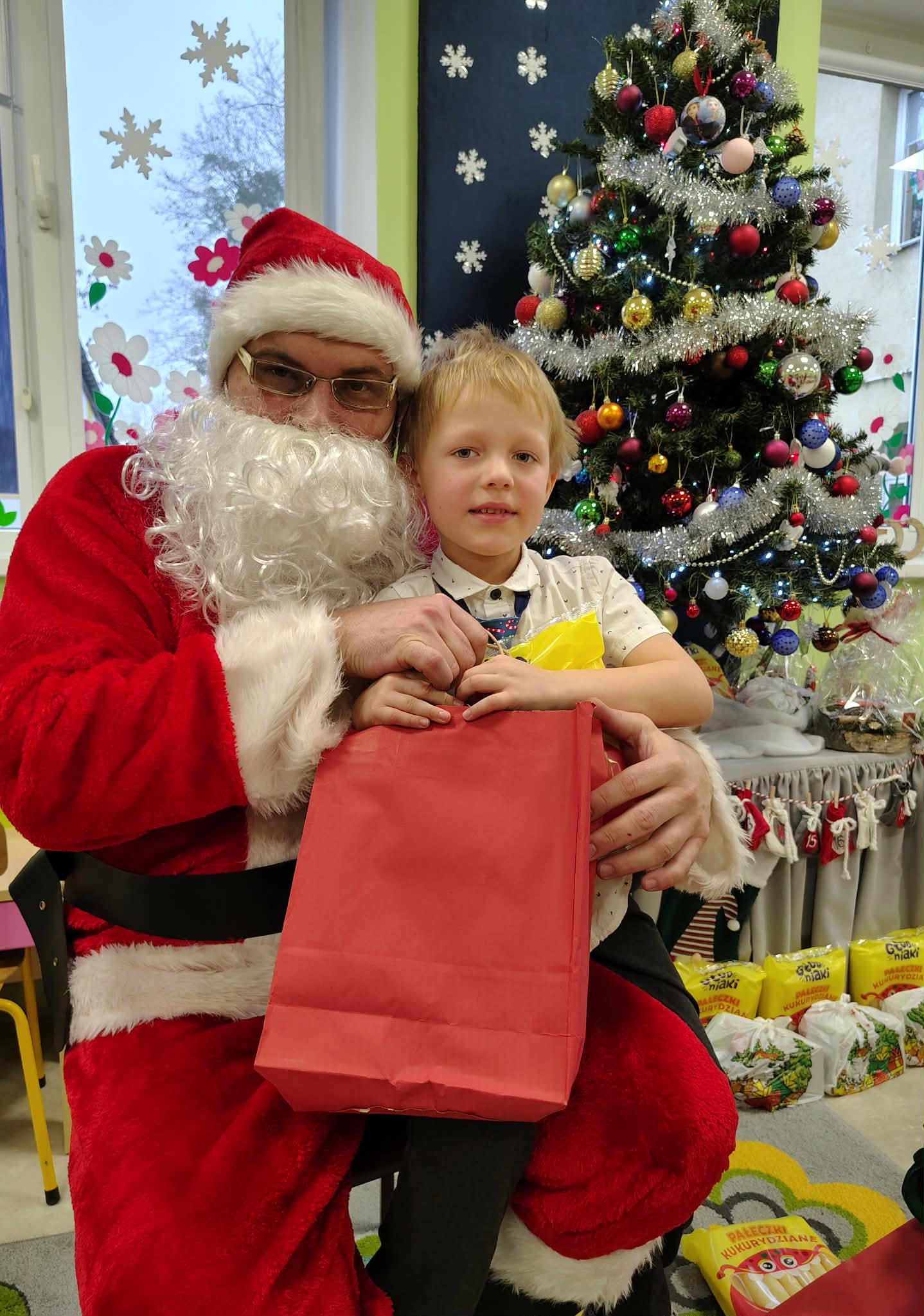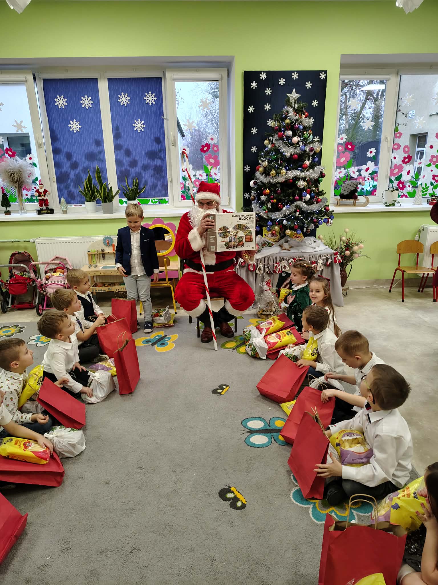 W wyjątkowej, świątecznej atmosferze odbyła się przedszkolna wigilia. Dzieci wspólnie kolędowały, składały sobie życzenia oraz dzieliły się opłatkiem. Nie zabrakło uśmiechów, radości i chwil pełnych wzruszeń. Ogromną niespodzianką była wizyta Świętego Mikołaja, który obdarował dzieci prezentami. To był niezapomniany czas, który wprowadził wszystkich w magiczny nastrój Świąt Bożego Narodzenia.