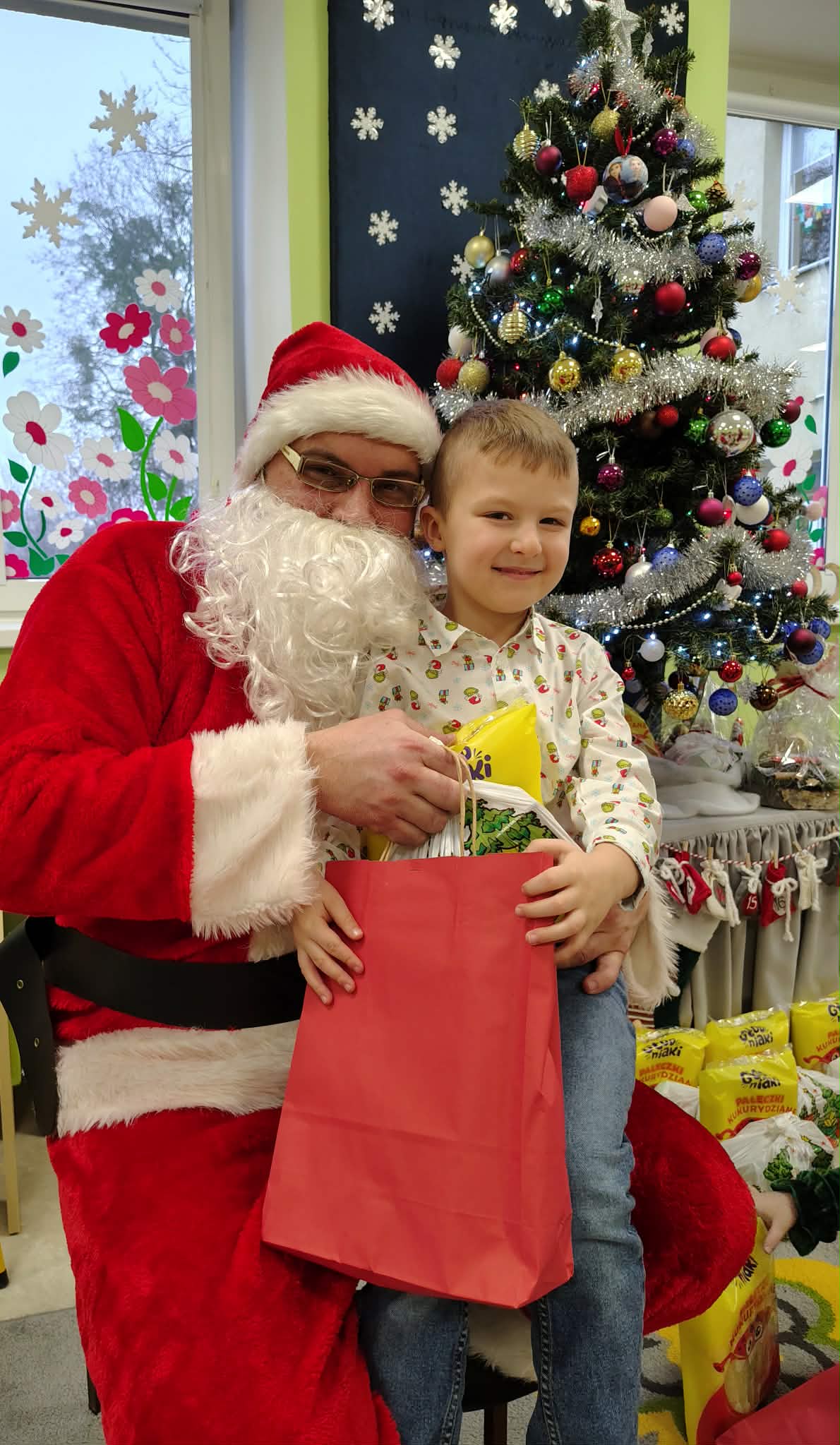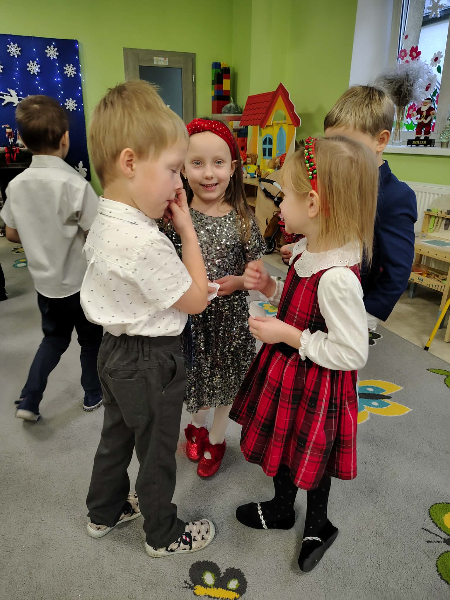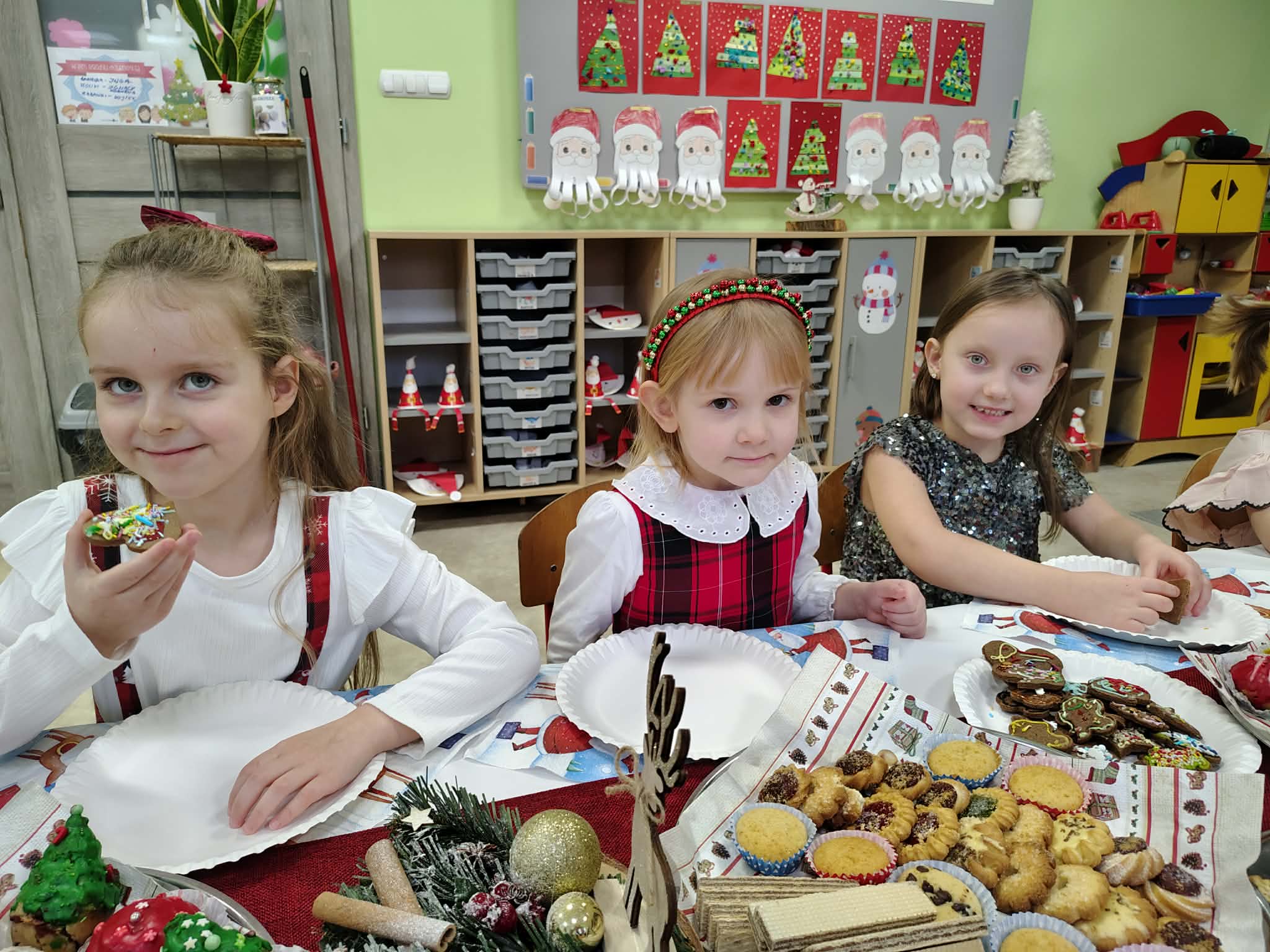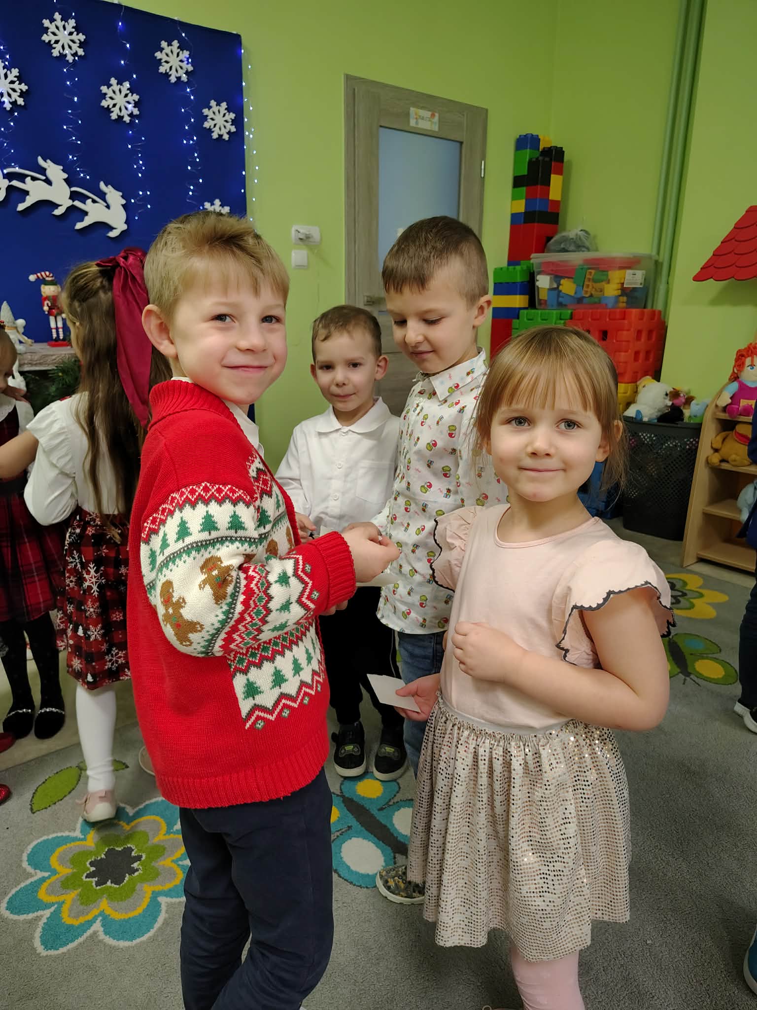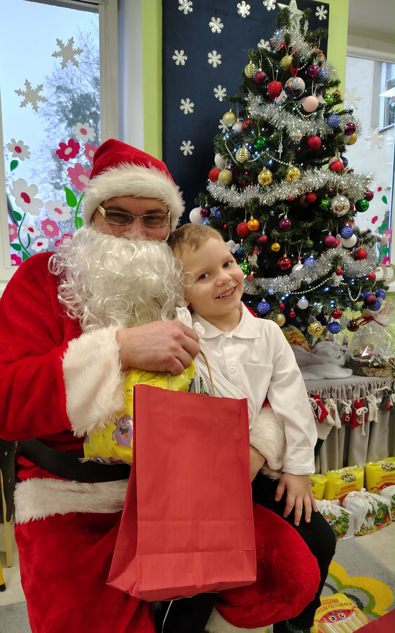 W wyjątkowej, świątecznej atmosferze odbyła się przedszkolna wigilia. Dzieci wspólnie kolędowały, składały sobie życzenia oraz dzieliły się opłatkiem. Nie zabrakło uśmiechów, radości i chwil pełnych wzruszeń. Ogromną niespodzianką była wizyta Świętego Mikołaja, który obdarował dzieci prezentami. To był niezapomniany czas, który wprowadził wszystkich w magiczny nastrój Świąt Bożego Narodzenia.