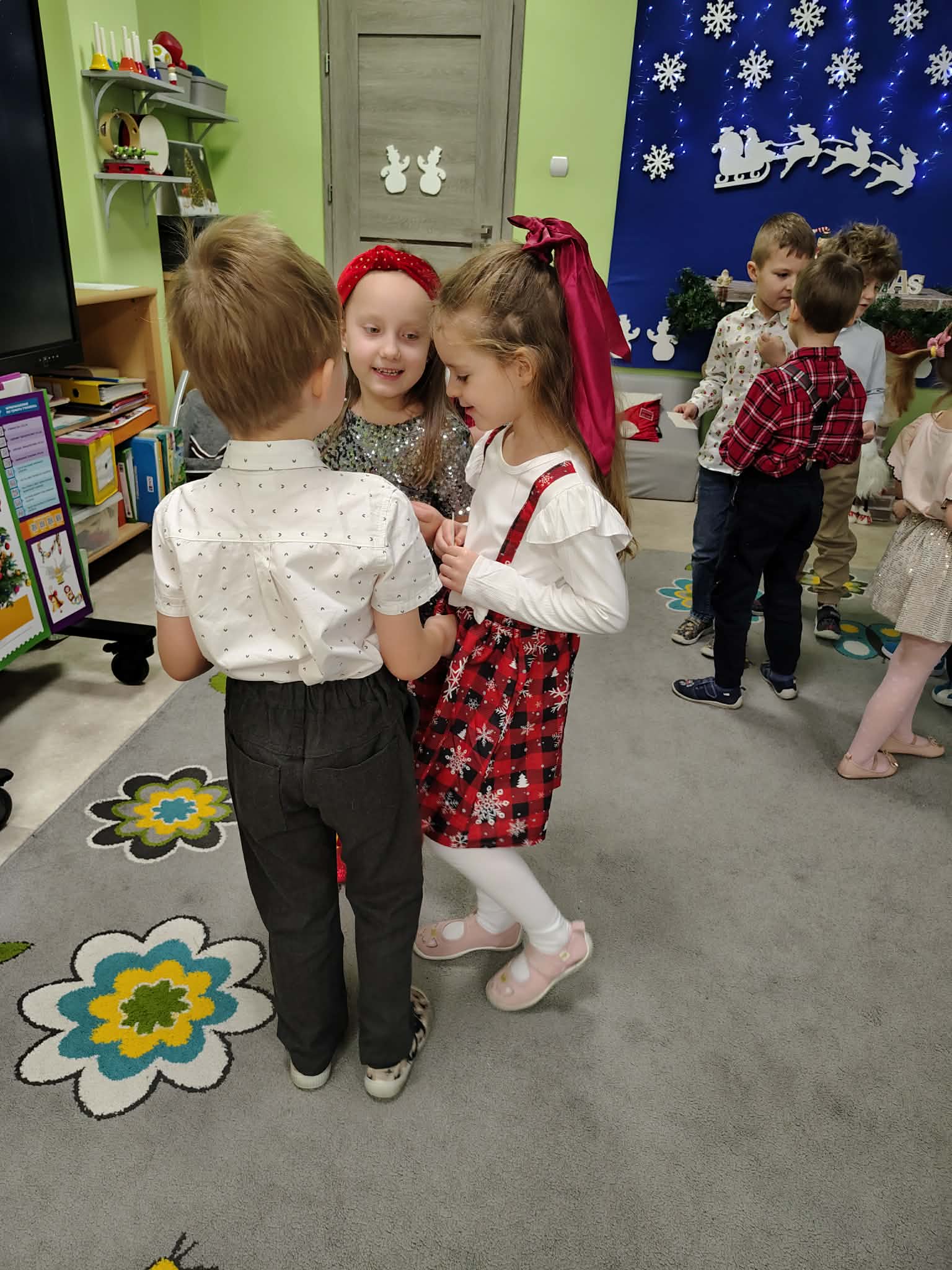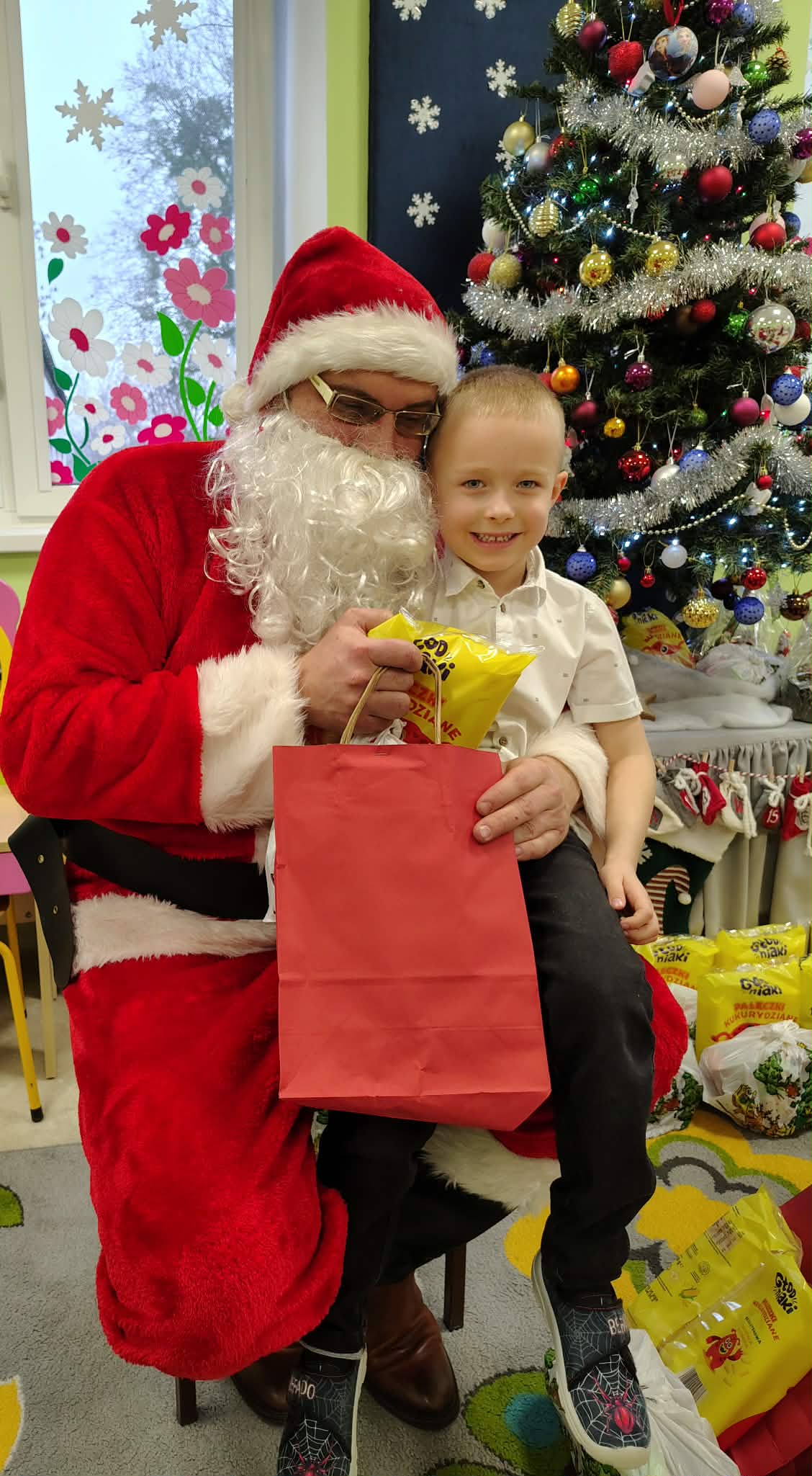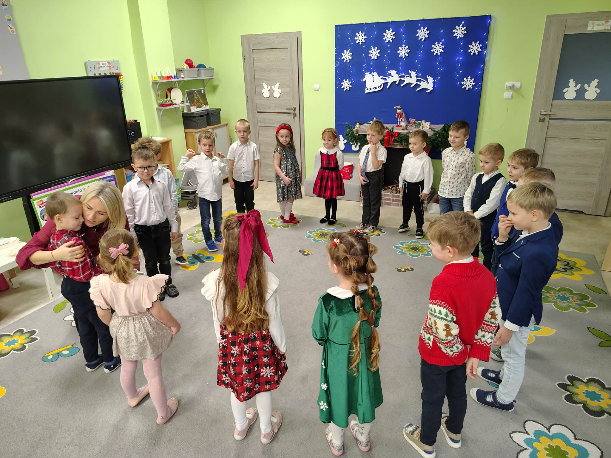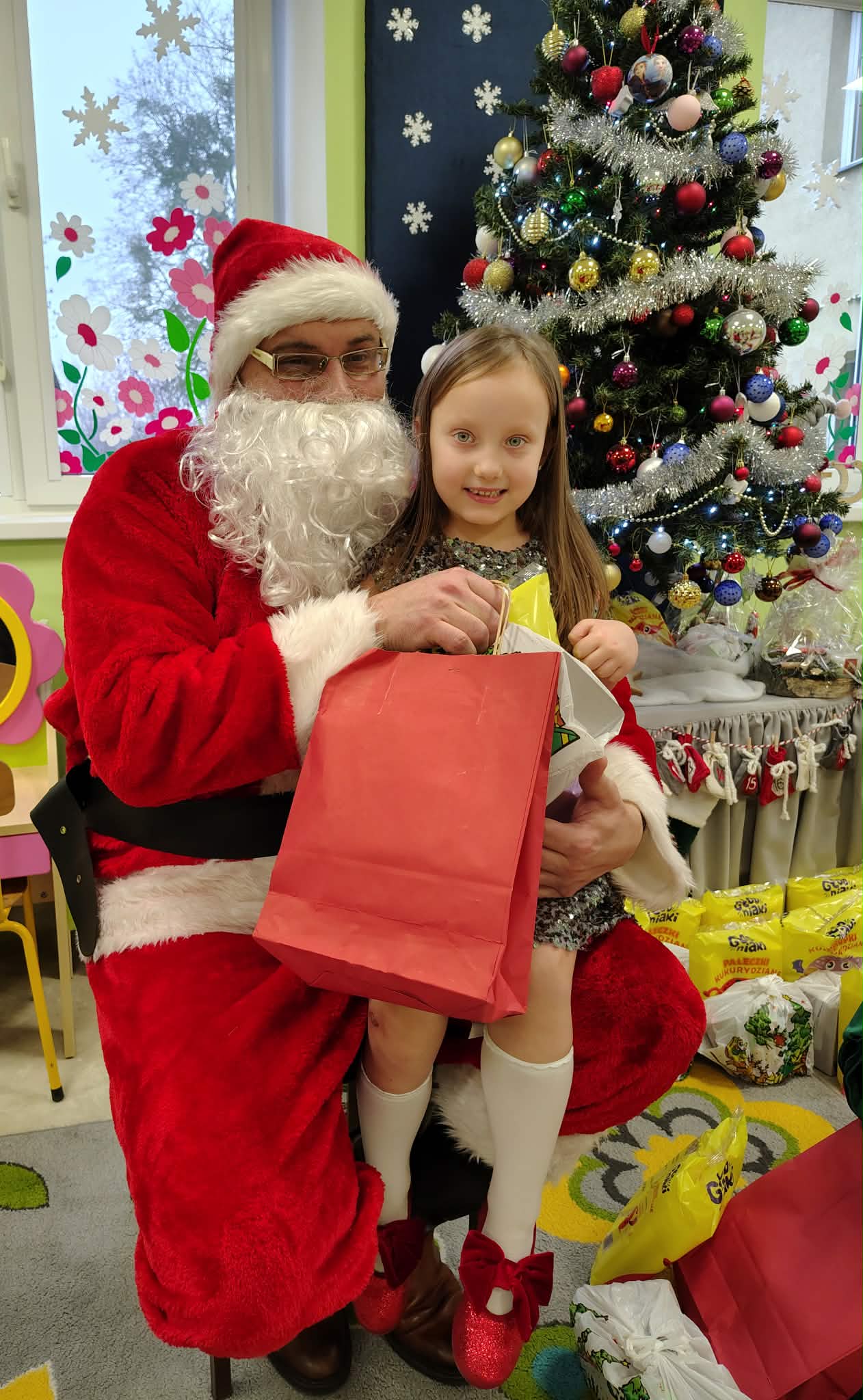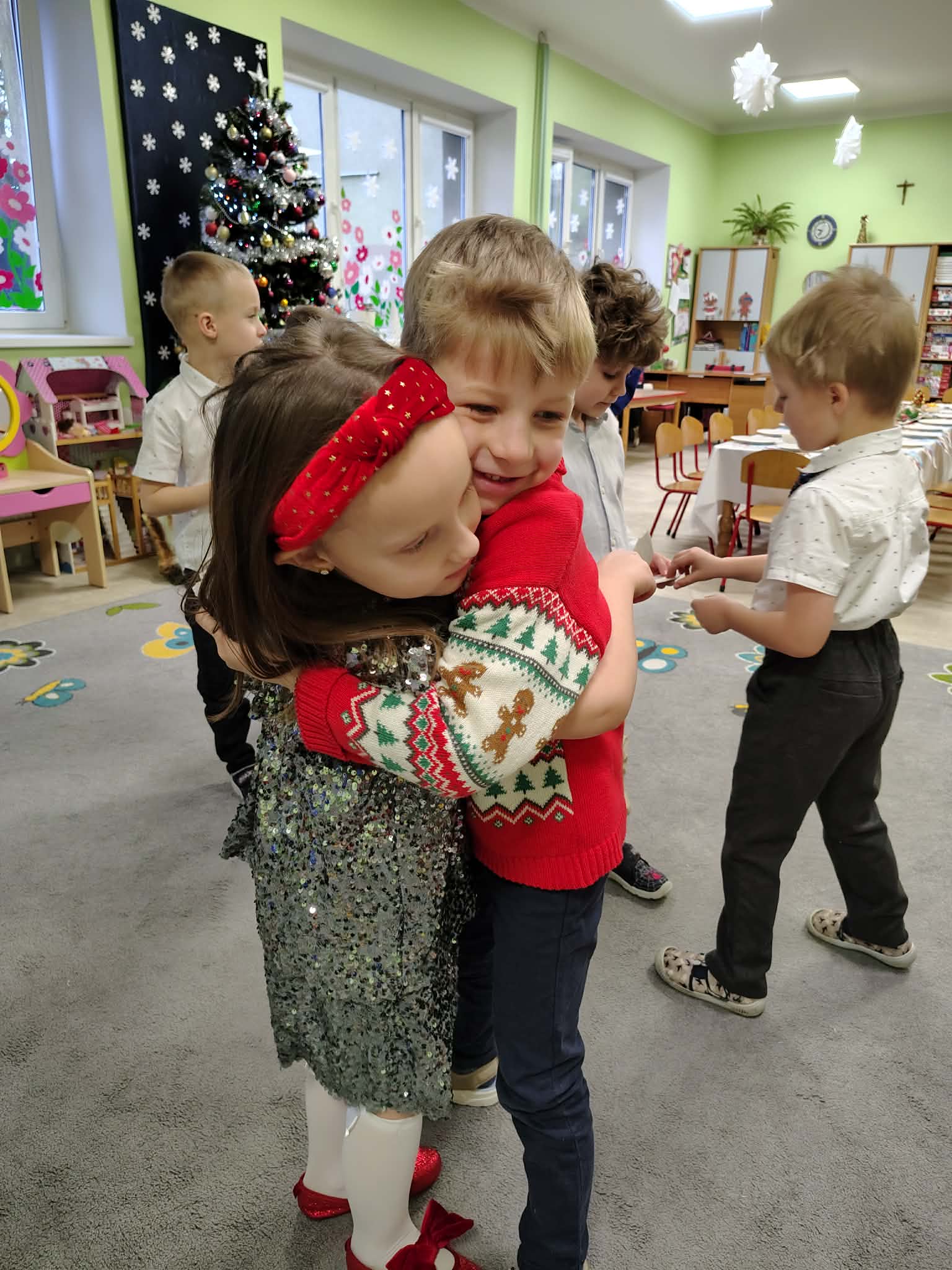 W wyjątkowej, świątecznej atmosferze odbyła się przedszkolna wigilia. Dzieci wspólnie kolędowały, składały sobie życzenia oraz dzieliły się opłatkiem. Nie zabrakło uśmiechów, radości i chwil pełnych wzruszeń. Ogromną niespodzianką była wizyta Świętego Mikołaja, który obdarował dzieci prezentami. To był niezapomniany czas, który wprowadził wszystkich w magiczny nastrój Świąt Bożego Narodzenia.