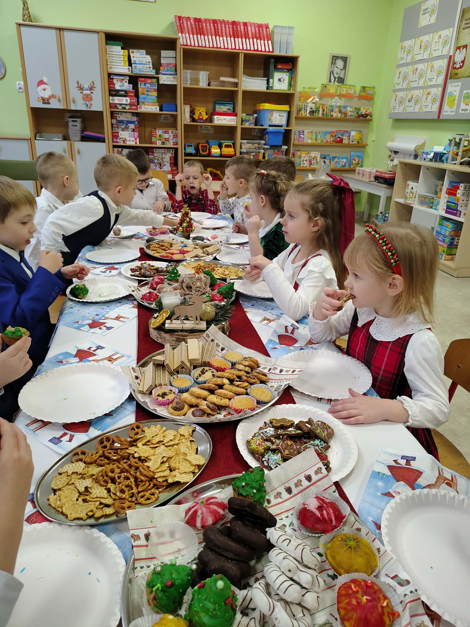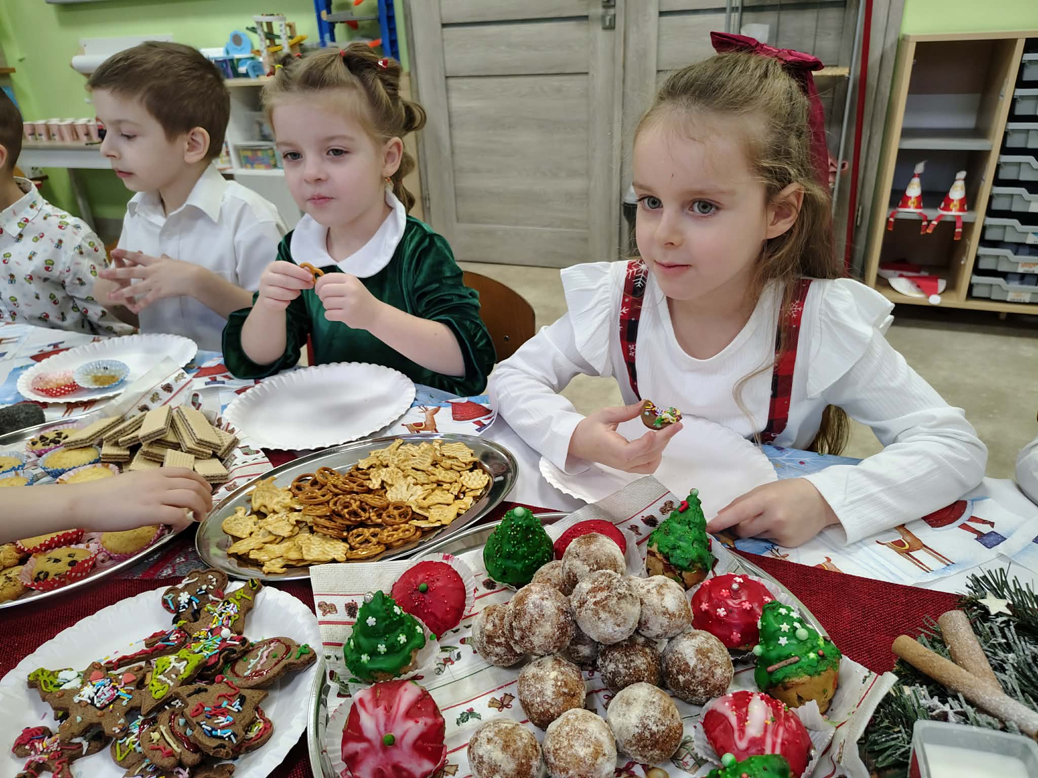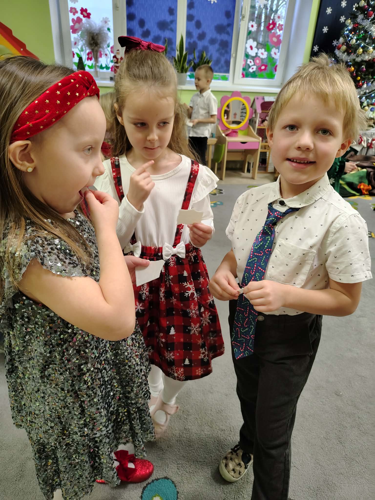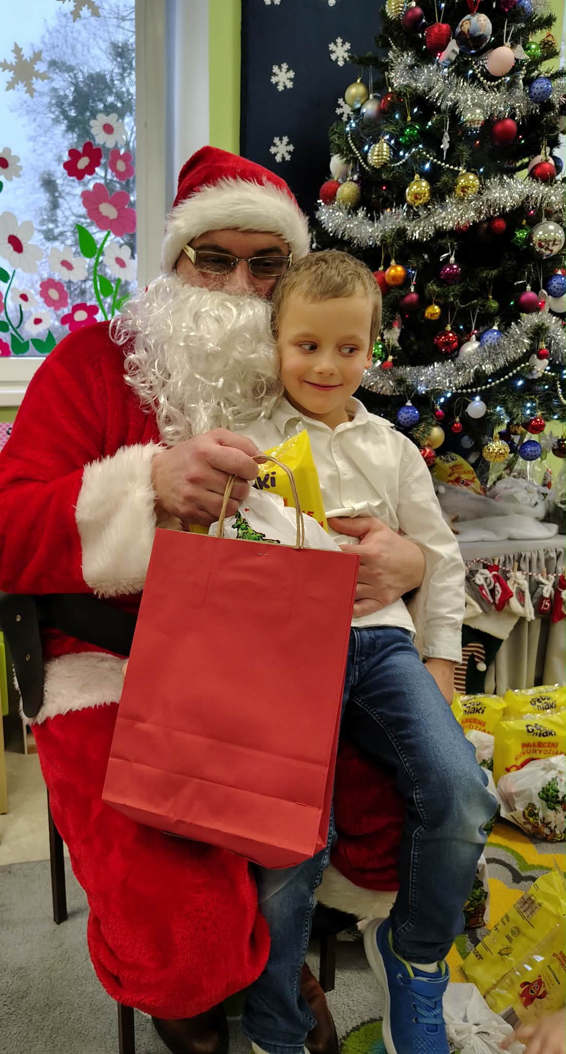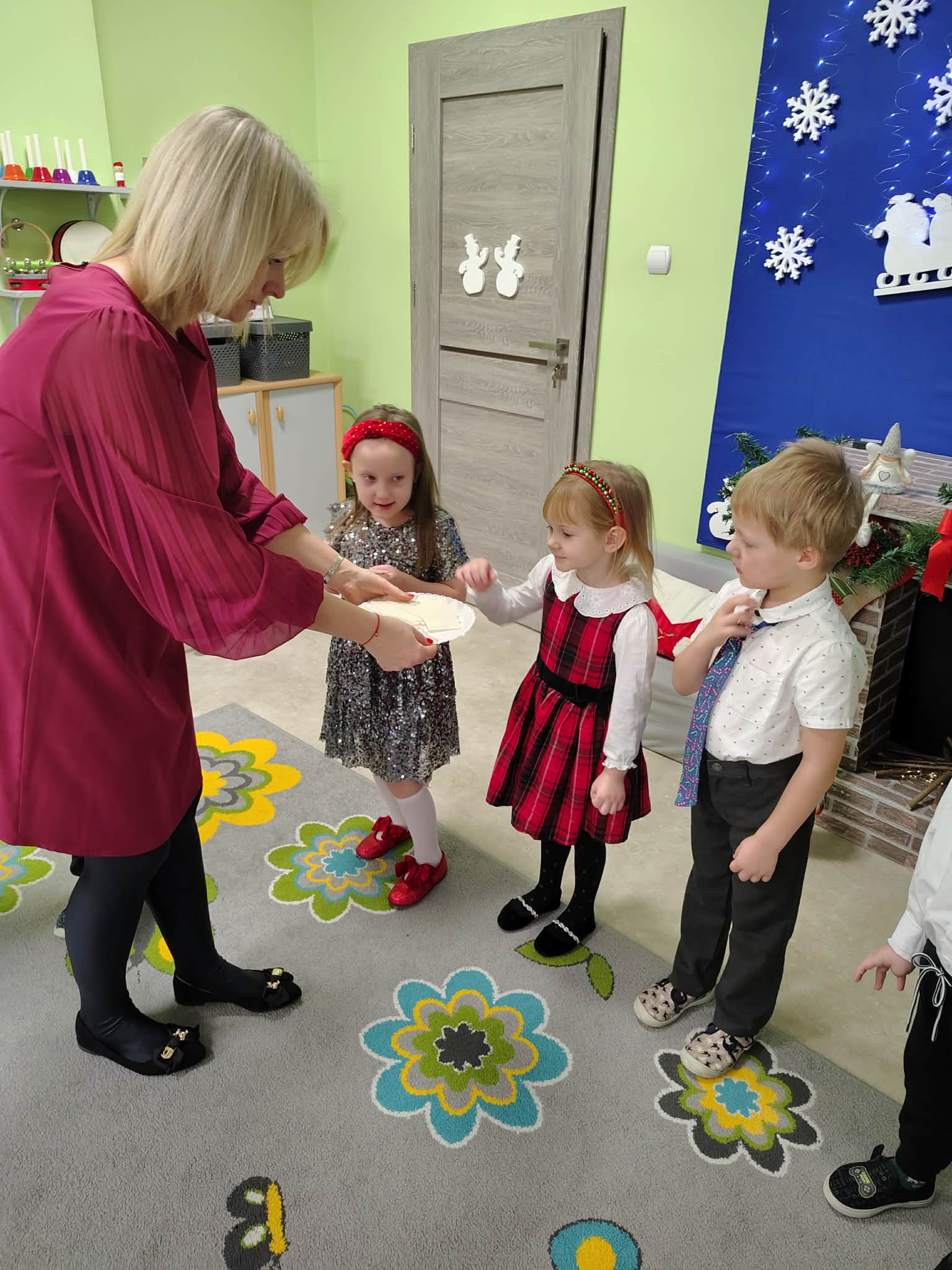W wyjątkowej, świątecznej atmosferze odbyła się przedszkolna wigilia. Dzieci wspólnie kolędowały, składały sobie życzenia oraz dzieliły się opłatkiem. Nie zabrakło uśmiechów, radości i chwil pełnych wzruszeń. Ogromną niespodzianką była wizyta Świętego Mikołaja, który obdarował dzieci prezentami. To był niezapomniany czas, który wprowadził wszystkich w magiczny nastrój Świąt Bożego Narodzenia.
