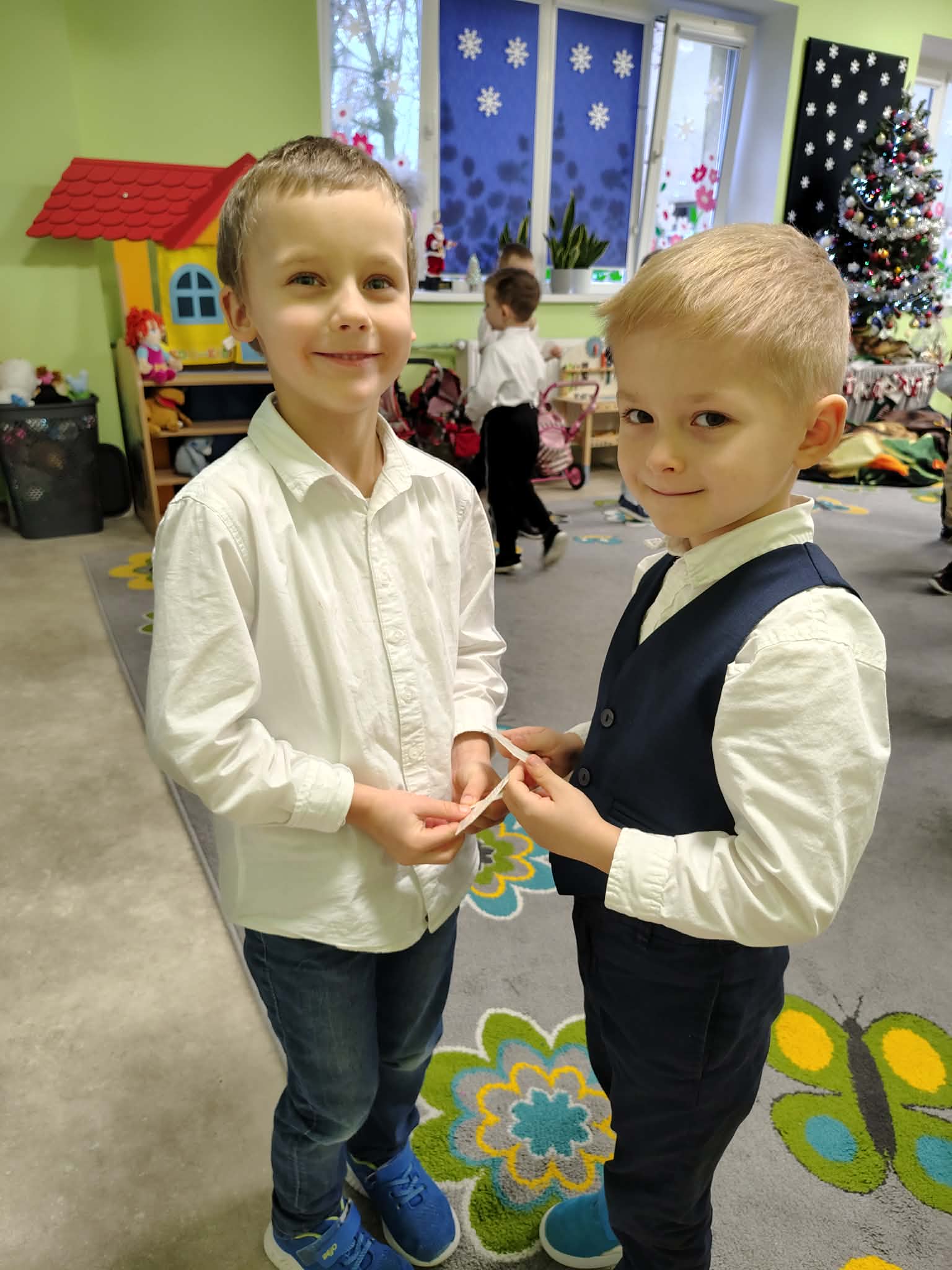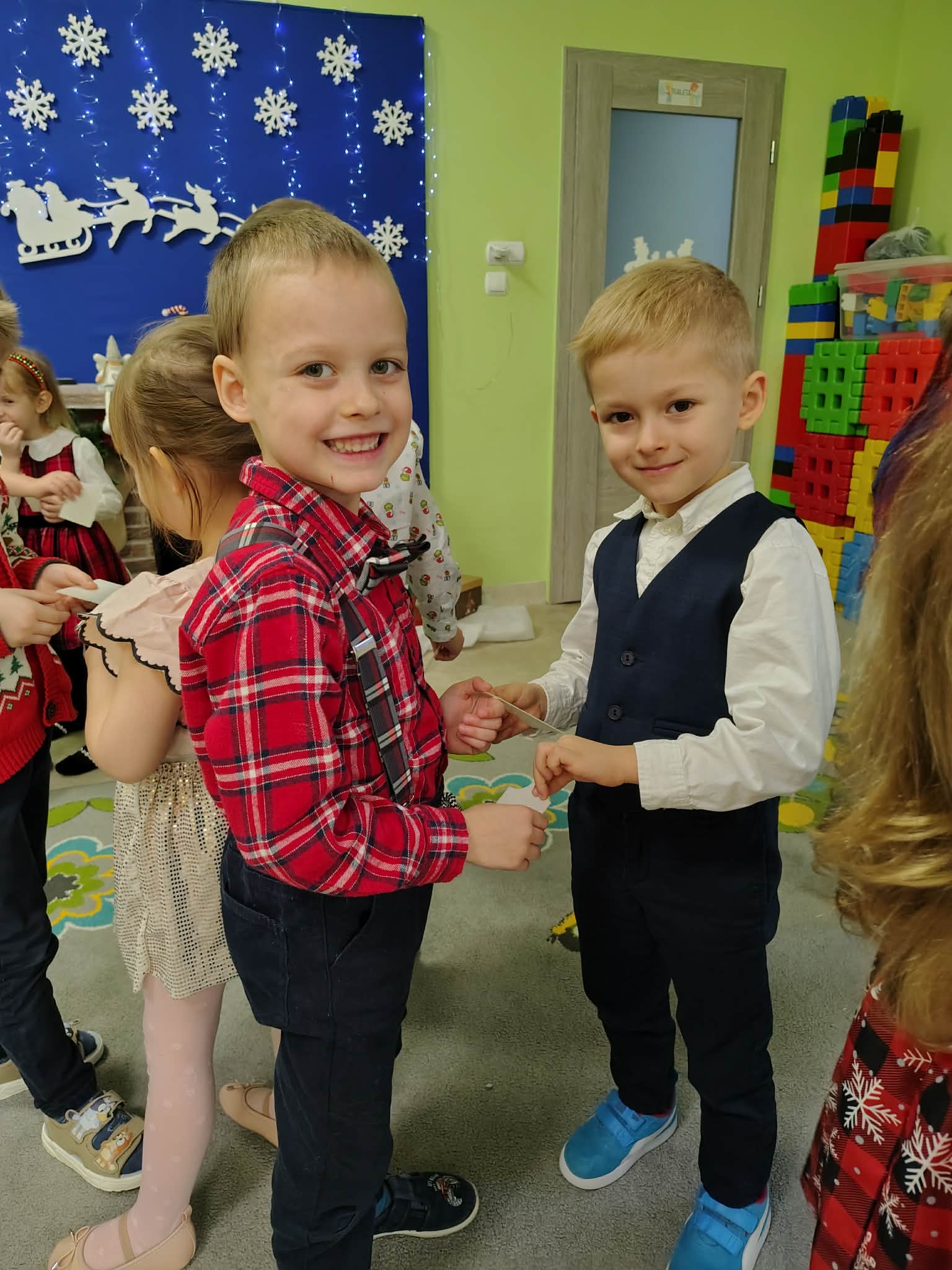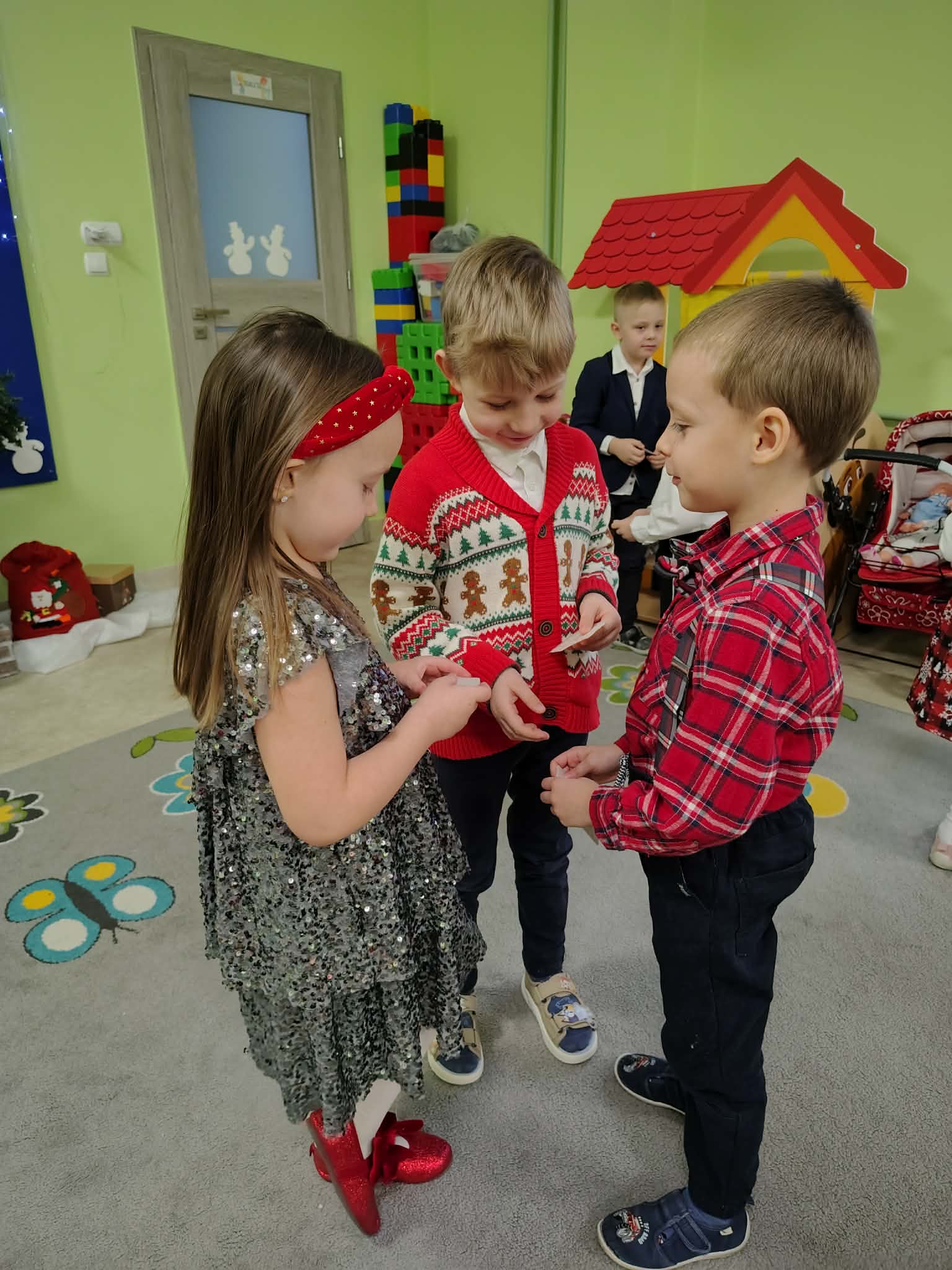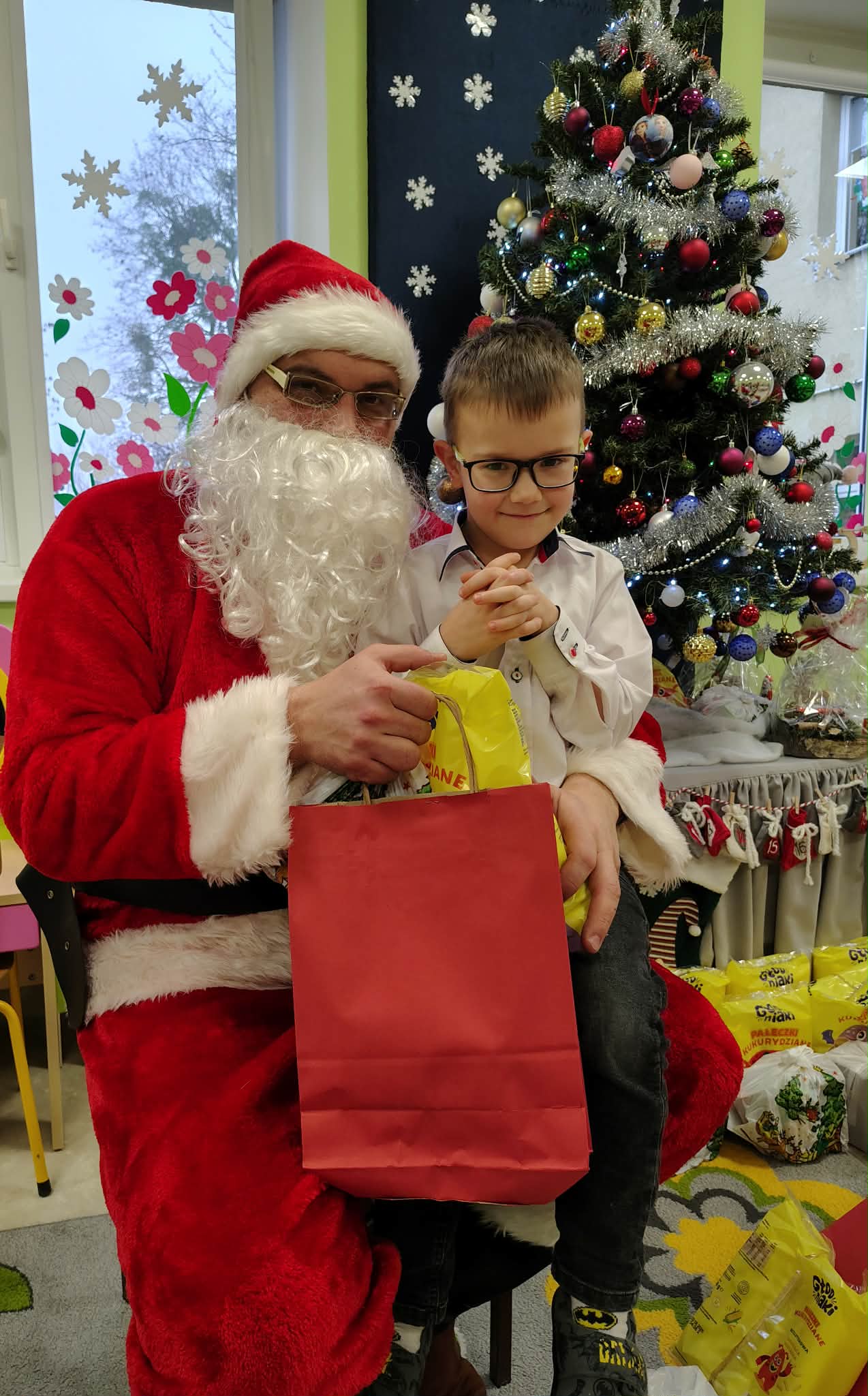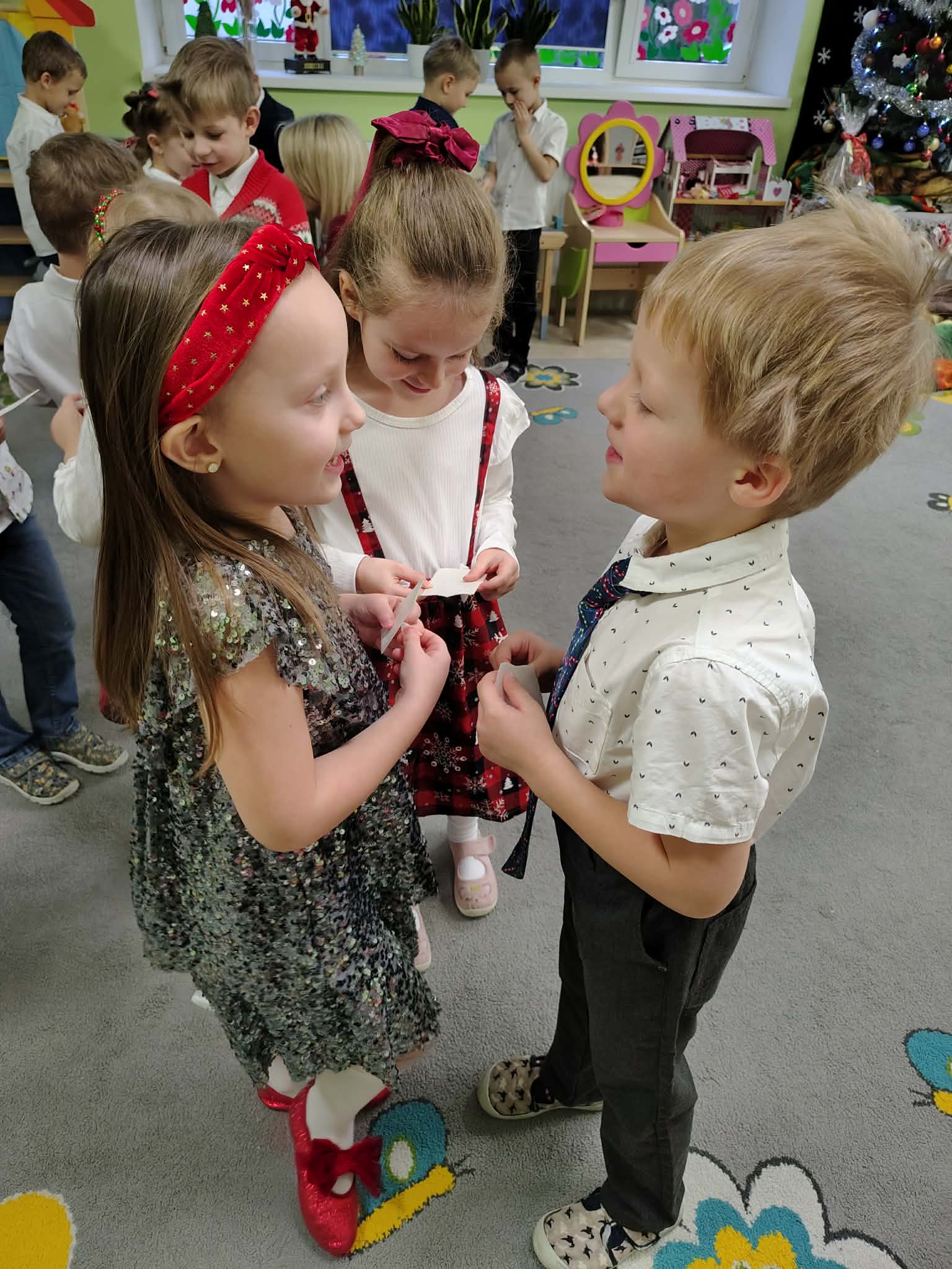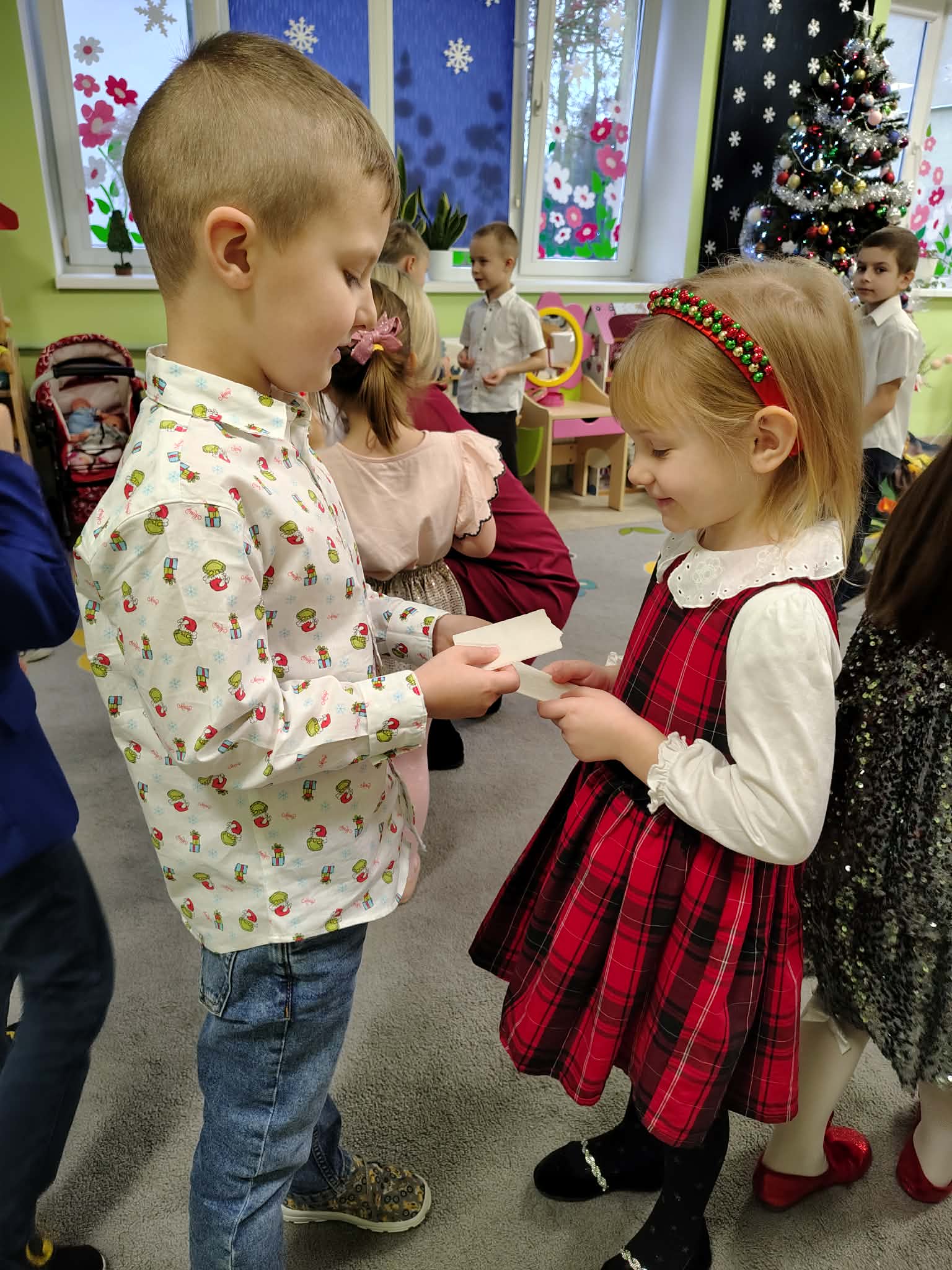 W wyjątkowej, świątecznej atmosferze odbyła się przedszkolna wigilia. Dzieci wspólnie kolędowały, składały sobie życzenia oraz dzieliły się opłatkiem. Nie zabrakło uśmiechów, radości i chwil pełnych wzruszeń. Ogromną niespodzianką była wizyta Świętego Mikołaja, który obdarował dzieci prezentami. To był niezapomniany czas, który wprowadził wszystkich w magiczny nastrój Świąt Bożego Narodzenia.