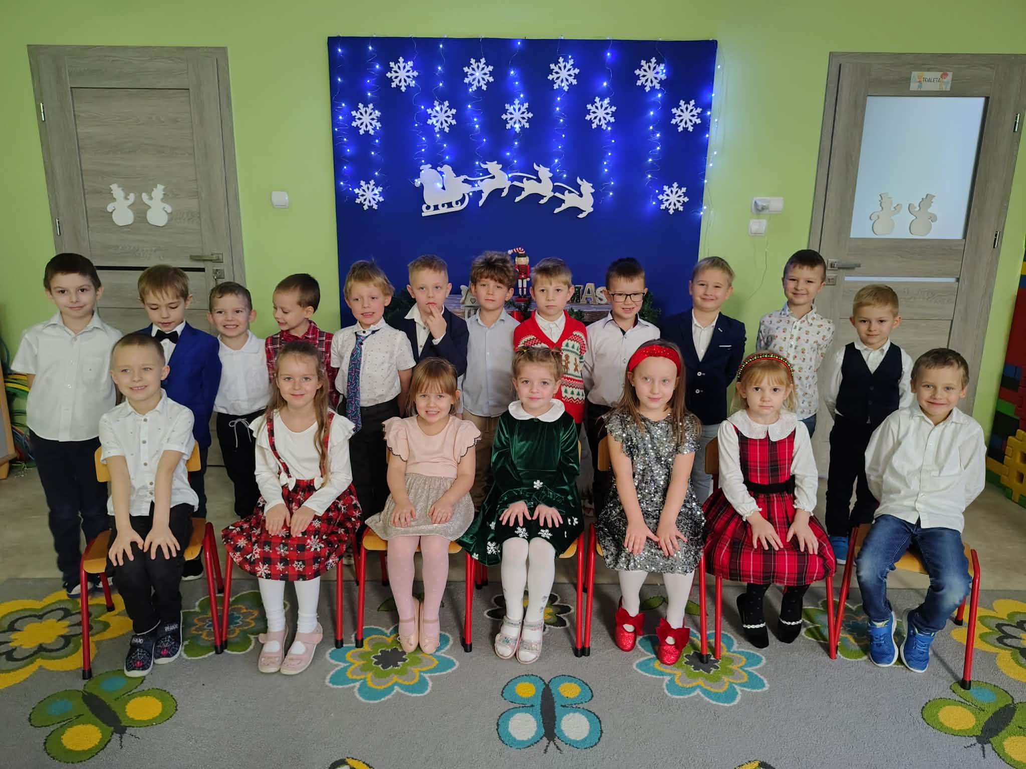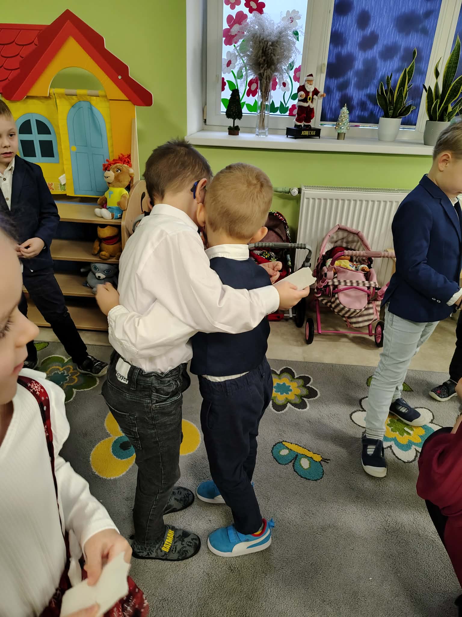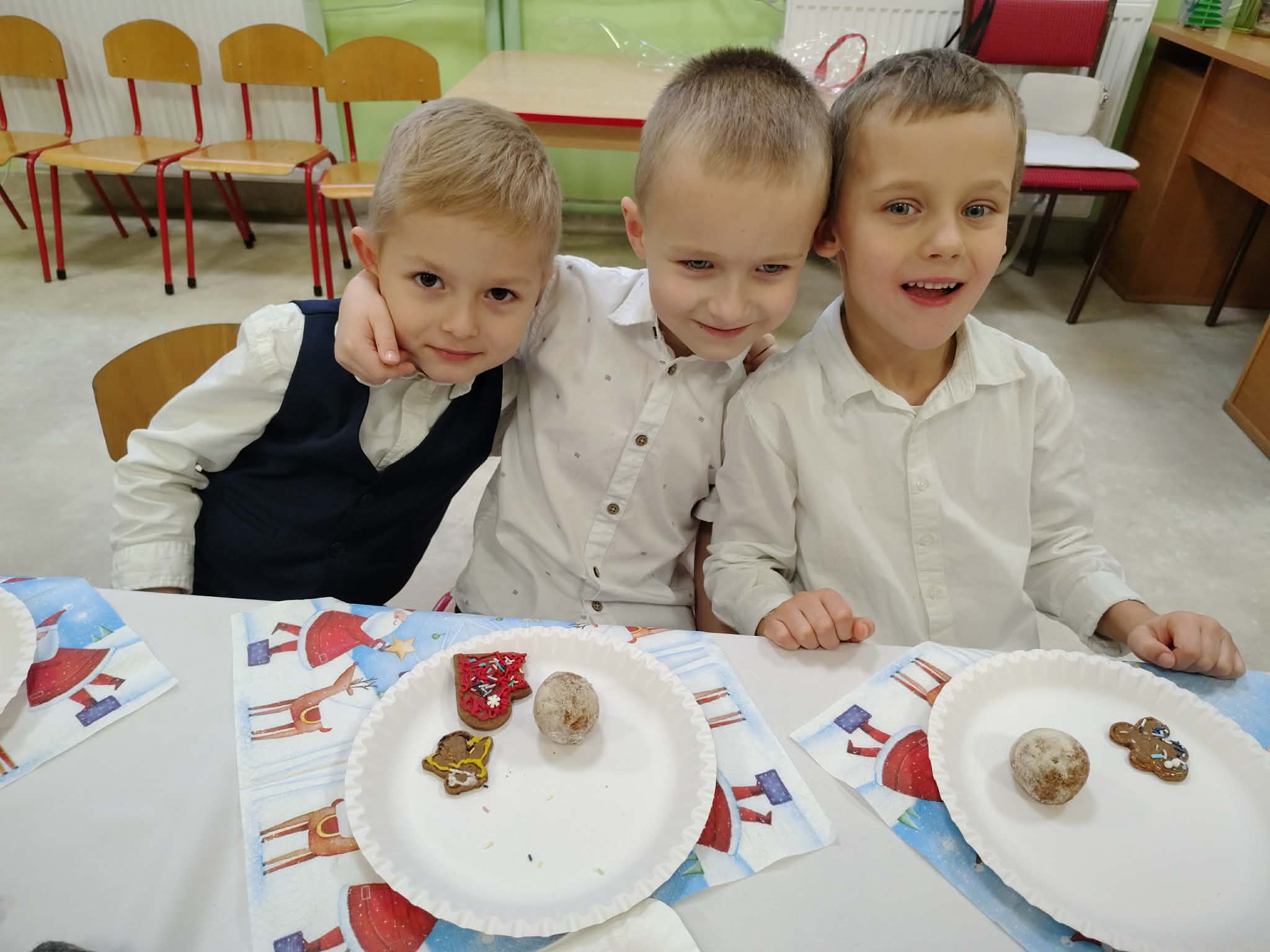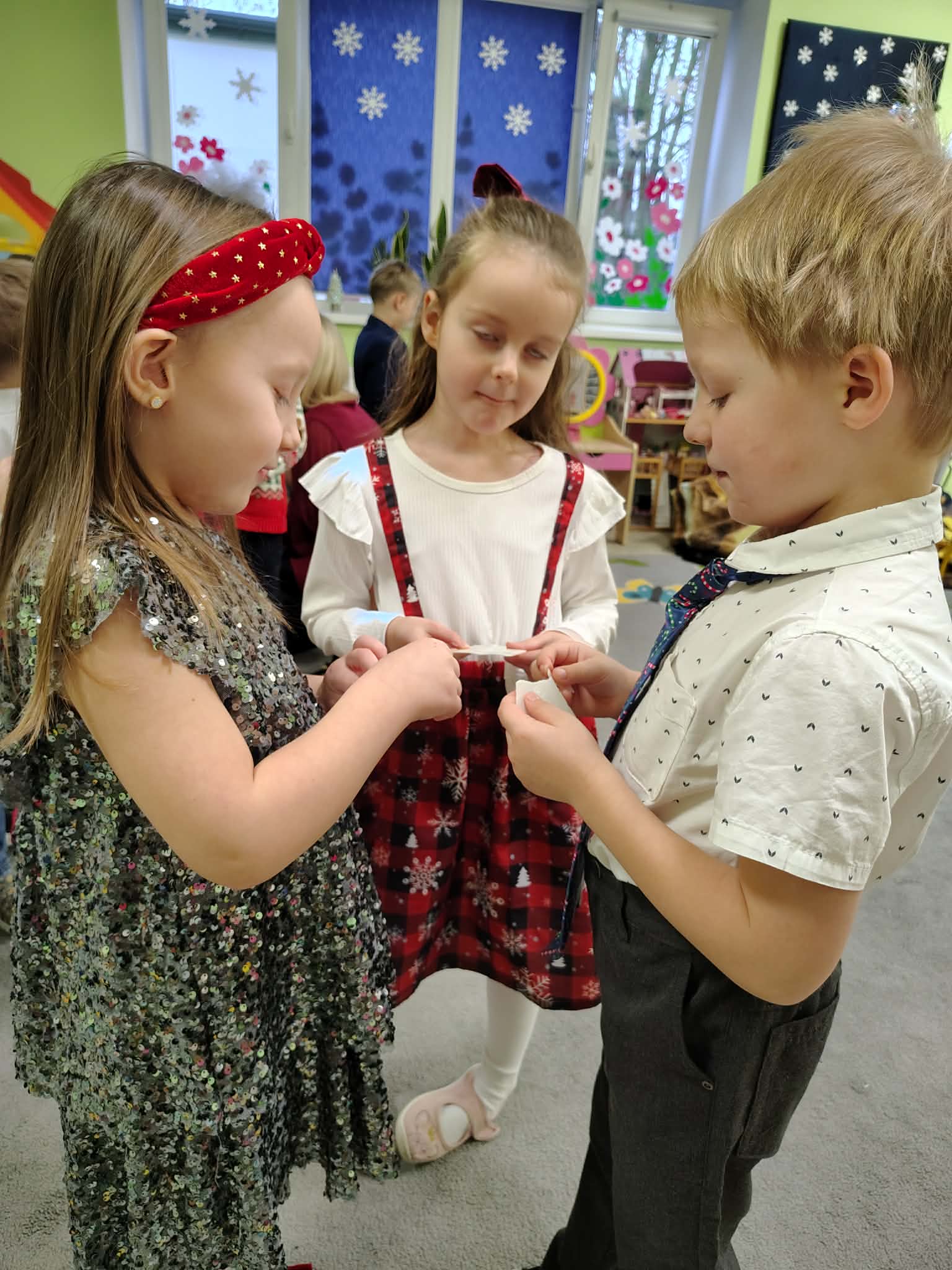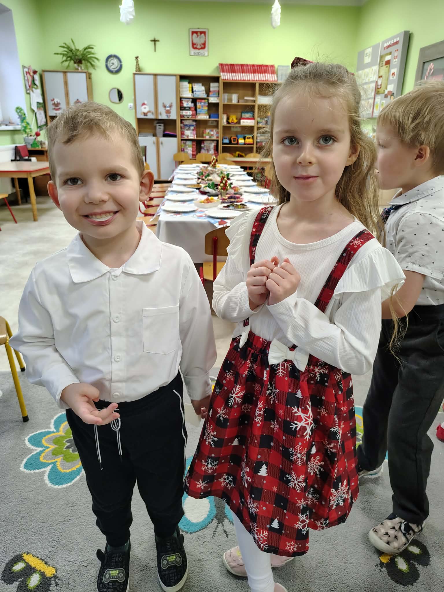 W wyjątkowej, świątecznej atmosferze odbyła się przedszkolna wigilia. Dzieci wspólnie kolędowały, składały sobie życzenia oraz dzieliły się opłatkiem. Nie zabrakło uśmiechów, radości i chwil pełnych wzruszeń. Ogromną niespodzianką była wizyta Świętego Mikołaja, który obdarował dzieci prezentami. To był niezapomniany czas, który wprowadził wszystkich w magiczny nastrój Świąt Bożego Narodzenia.