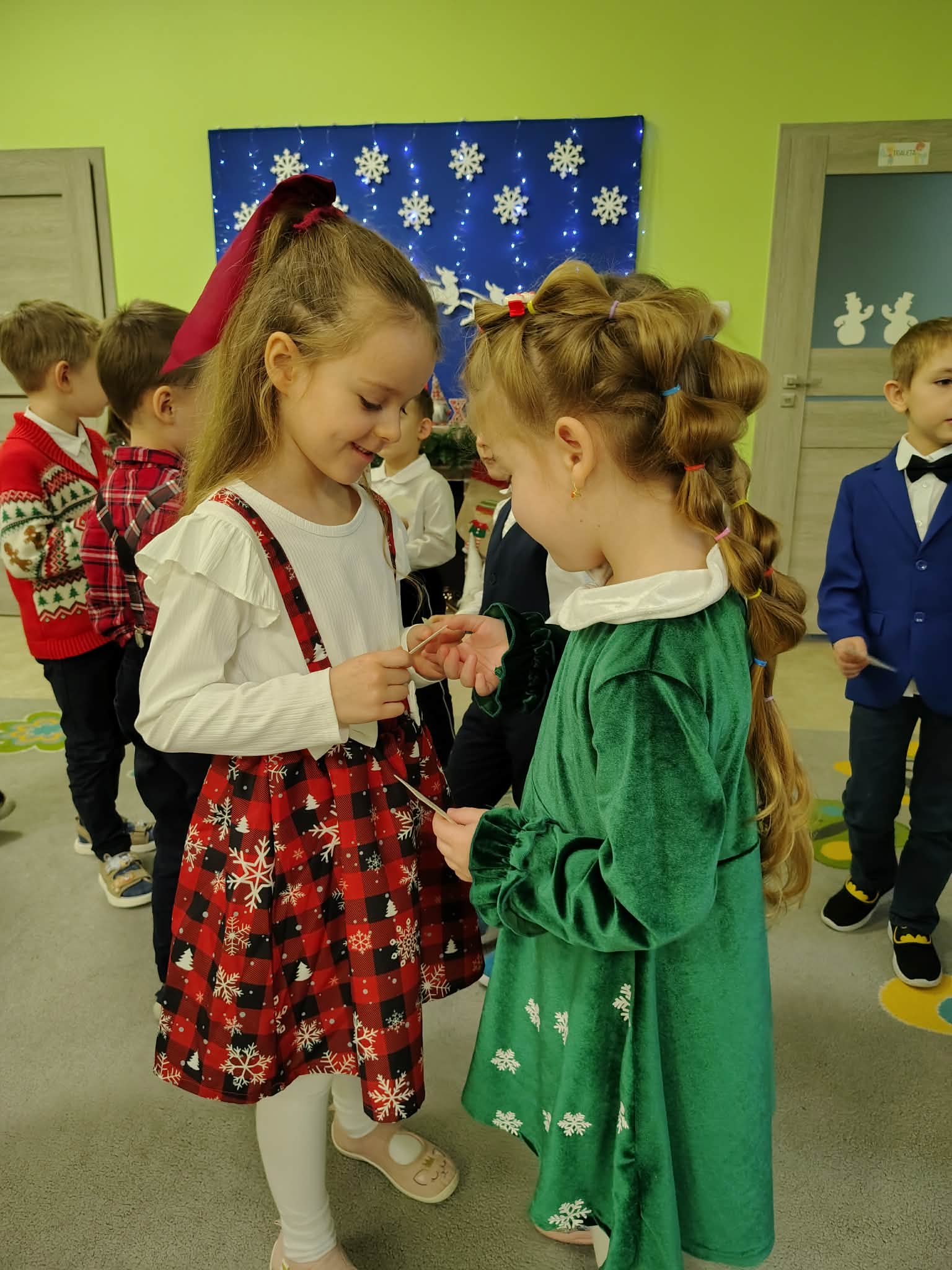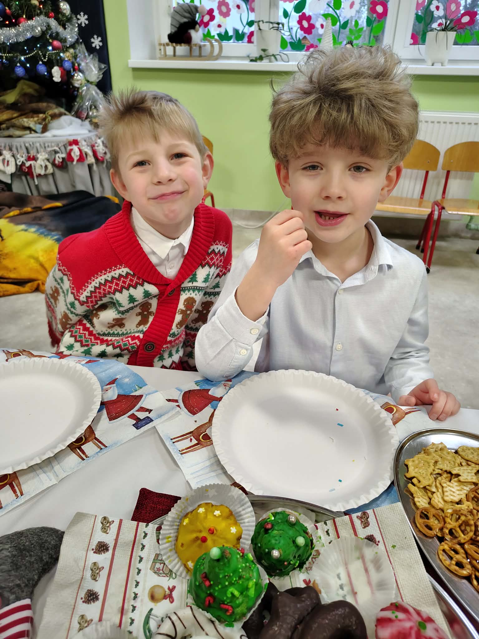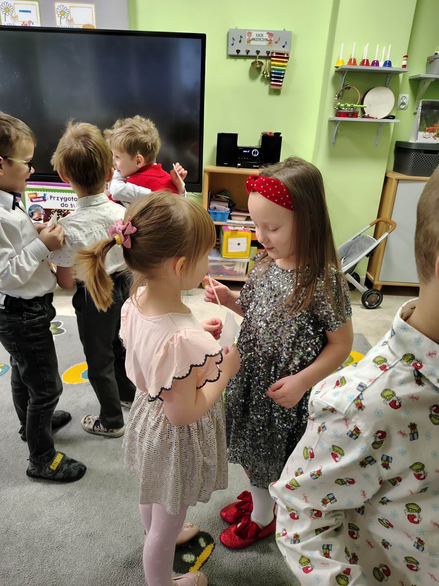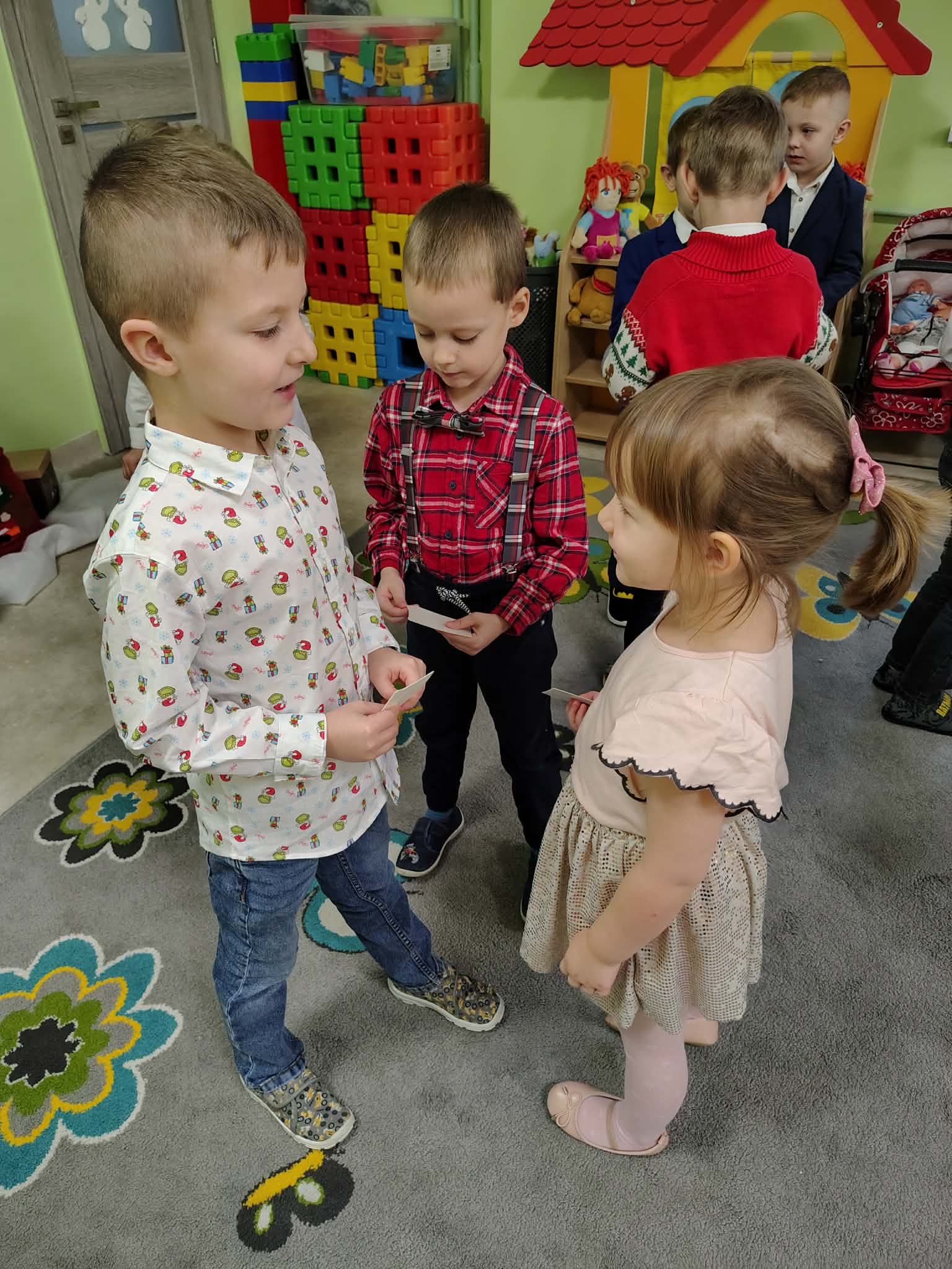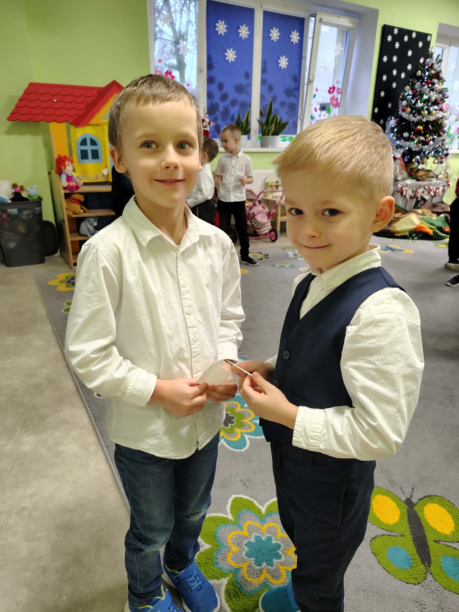 W wyjątkowej, świątecznej atmosferze odbyła się przedszkolna wigilia. Dzieci wspólnie kolędowały, składały sobie życzenia oraz dzieliły się opłatkiem. Nie zabrakło uśmiechów, radości i chwil pełnych wzruszeń. Ogromną niespodzianką była wizyta Świętego Mikołaja, który obdarował dzieci prezentami. To był niezapomniany czas, który wprowadził wszystkich w magiczny nastrój Świąt Bożego Narodzenia.