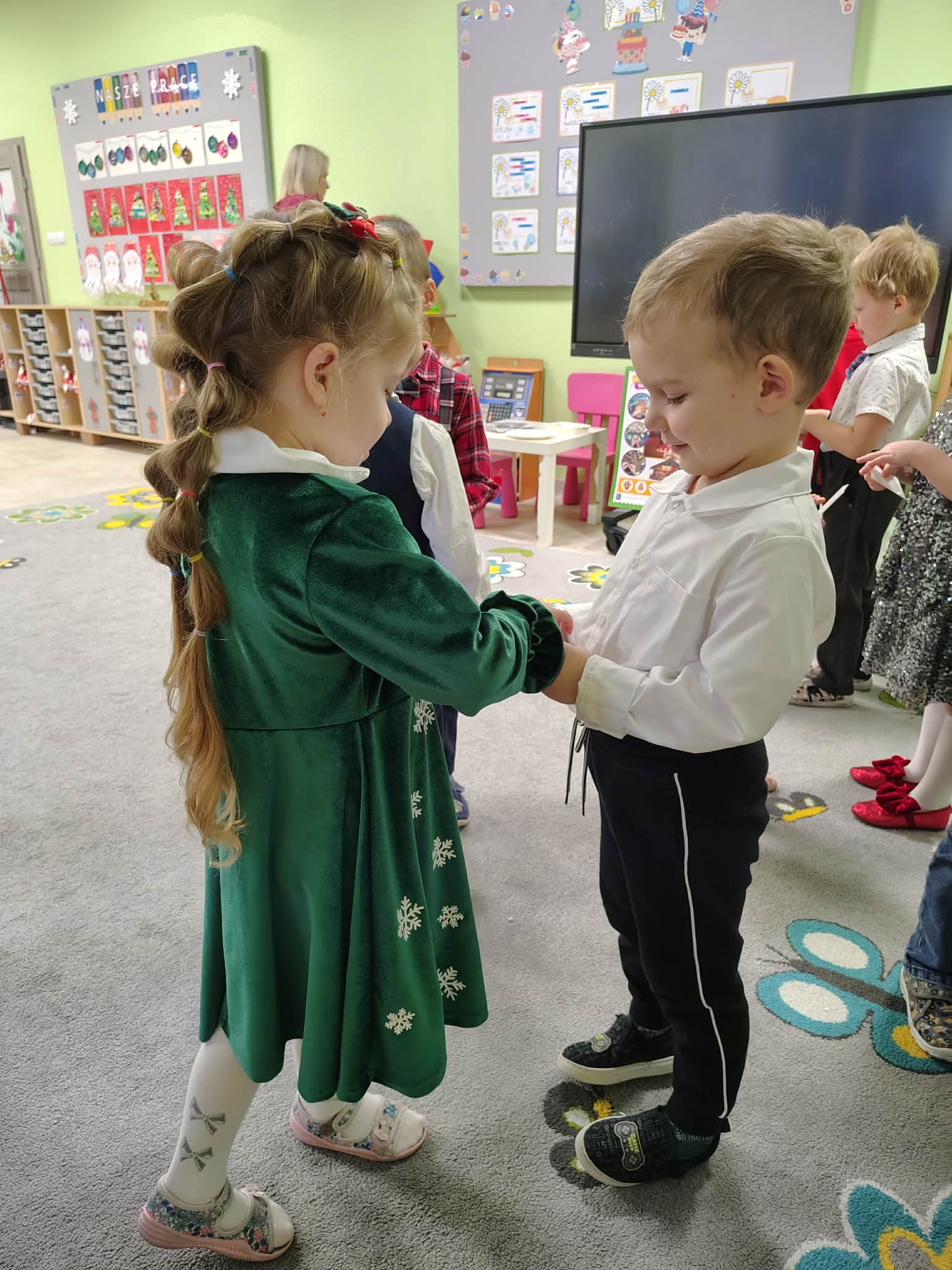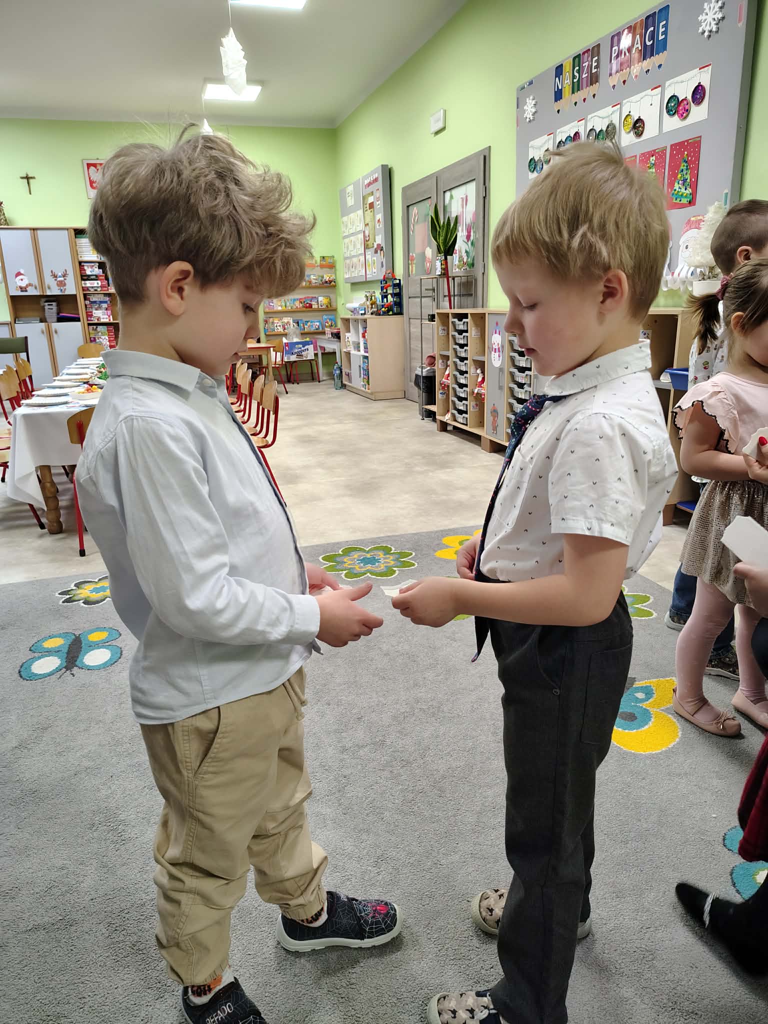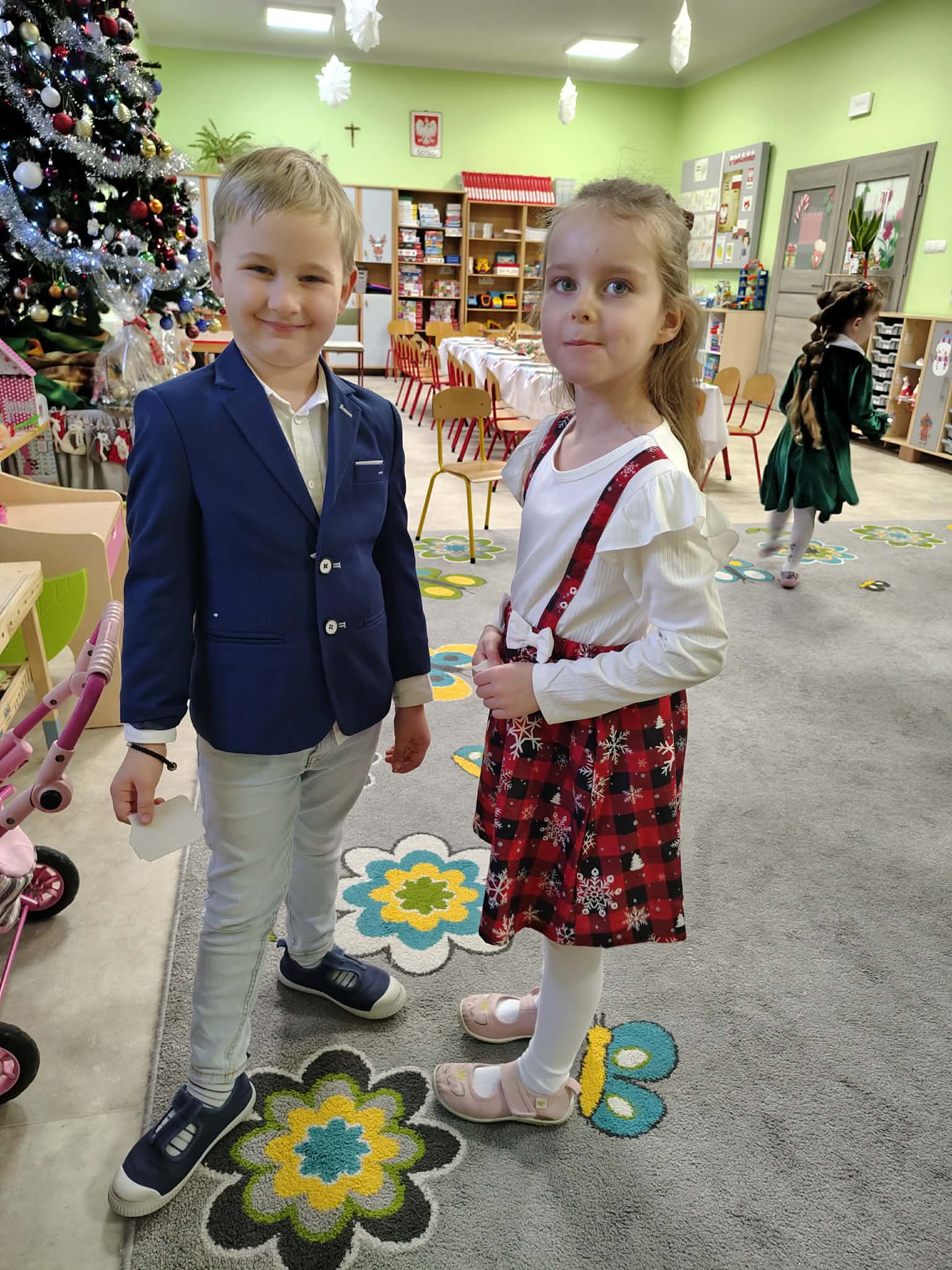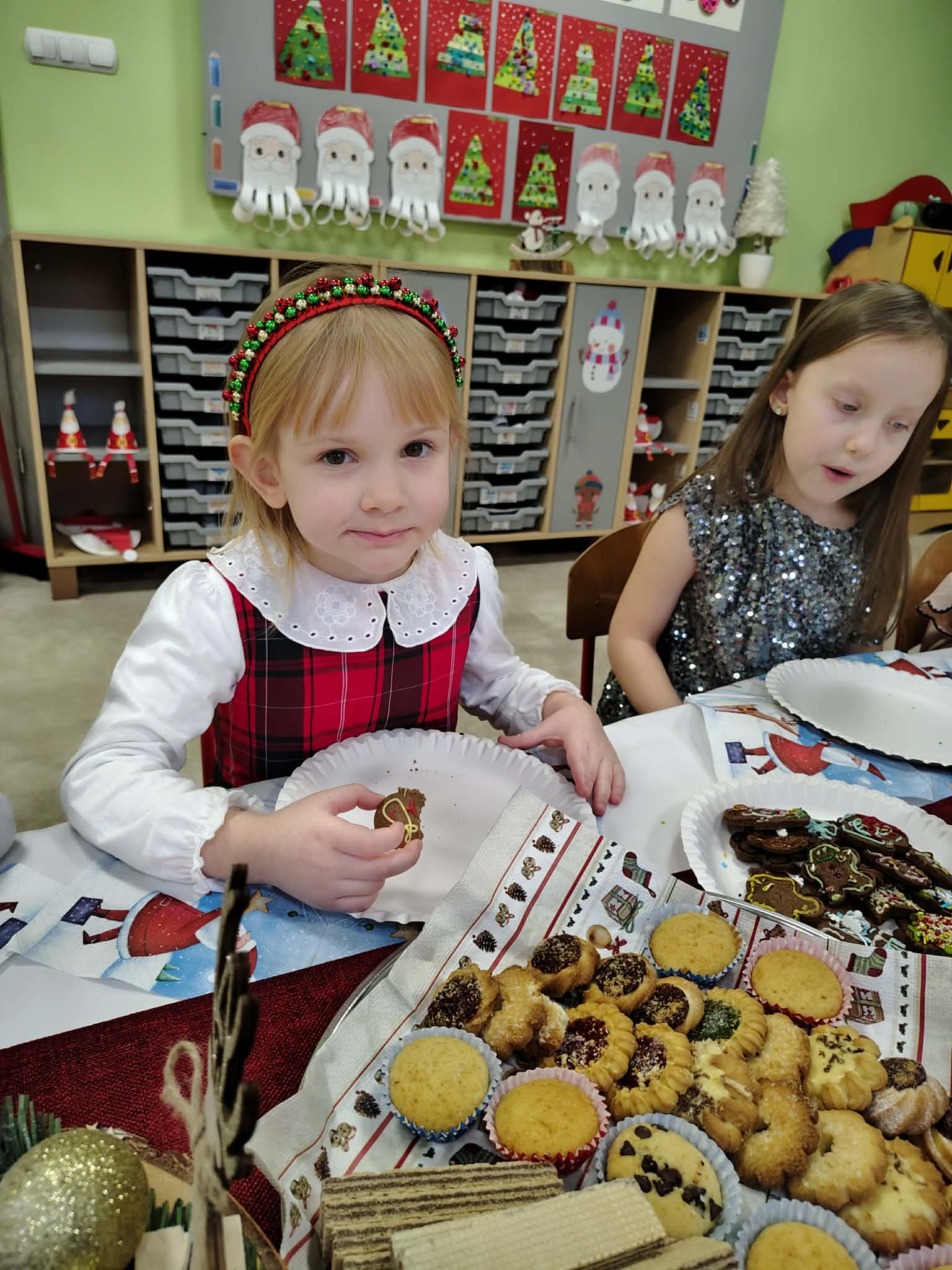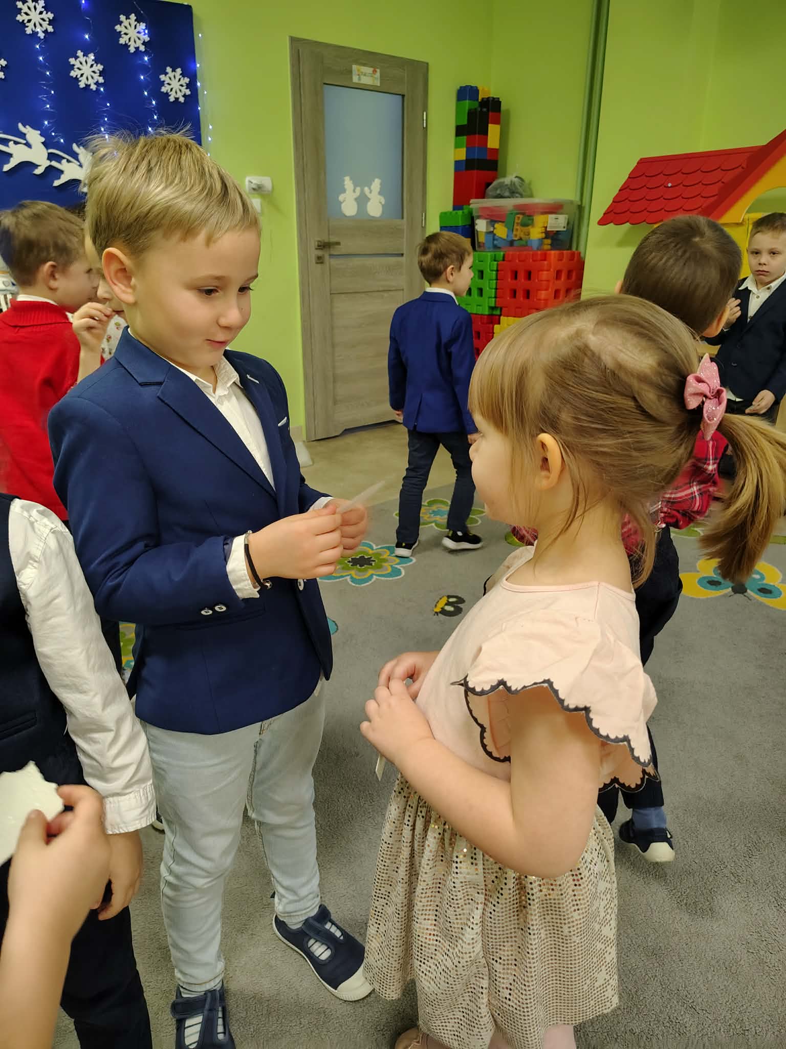W wyjątkowej, świątecznej atmosferze odbyła się przedszkolna wigilia. Dzieci wspólnie kolędowały, składały sobie życzenia oraz dzieliły się opłatkiem. Nie zabrakło uśmiechów, radości i chwil pełnych wzruszeń. Ogromną niespodzianką była wizyta Świętego Mikołaja, który obdarował dzieci prezentami. To był niezapomniany czas, który wprowadził wszystkich w magiczny nastrój Świąt Bożego Narodzenia.