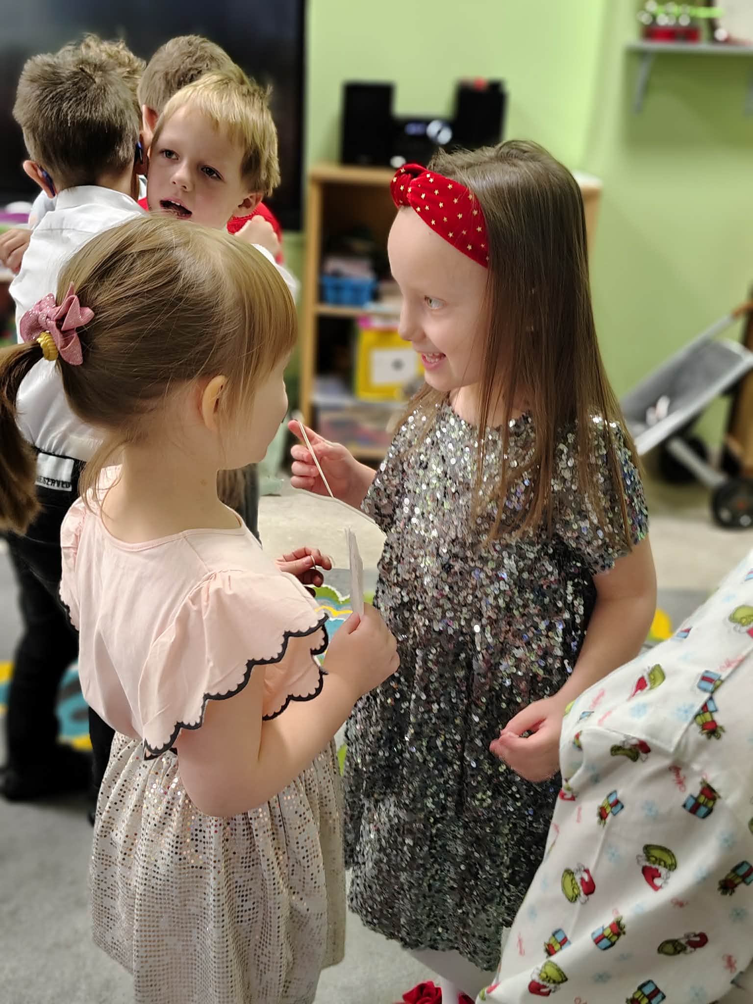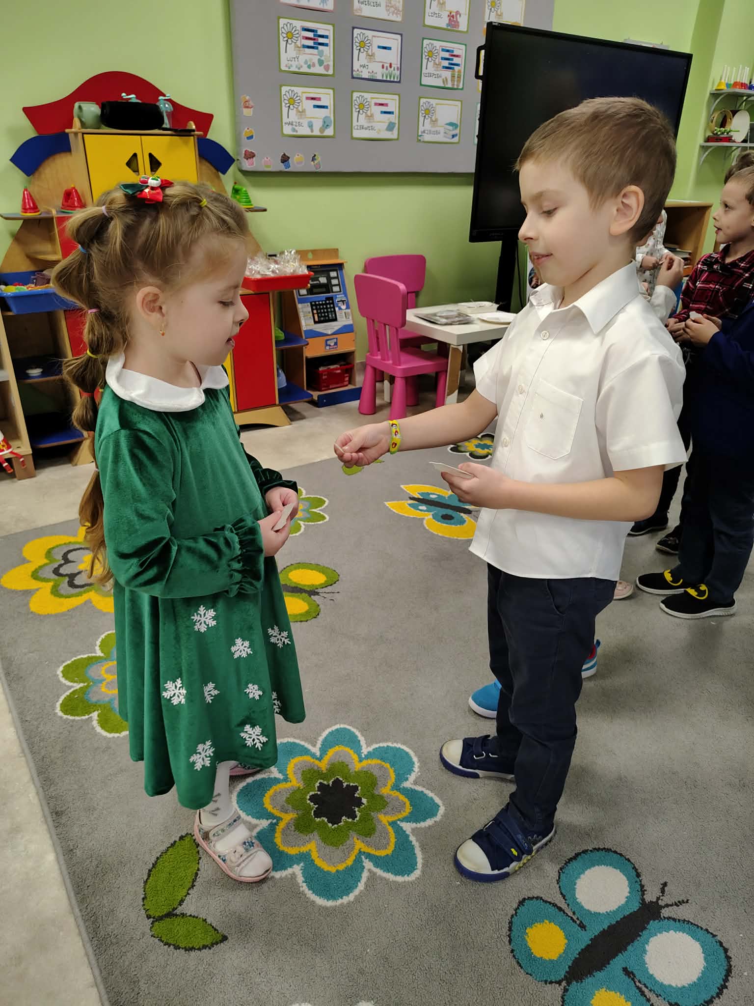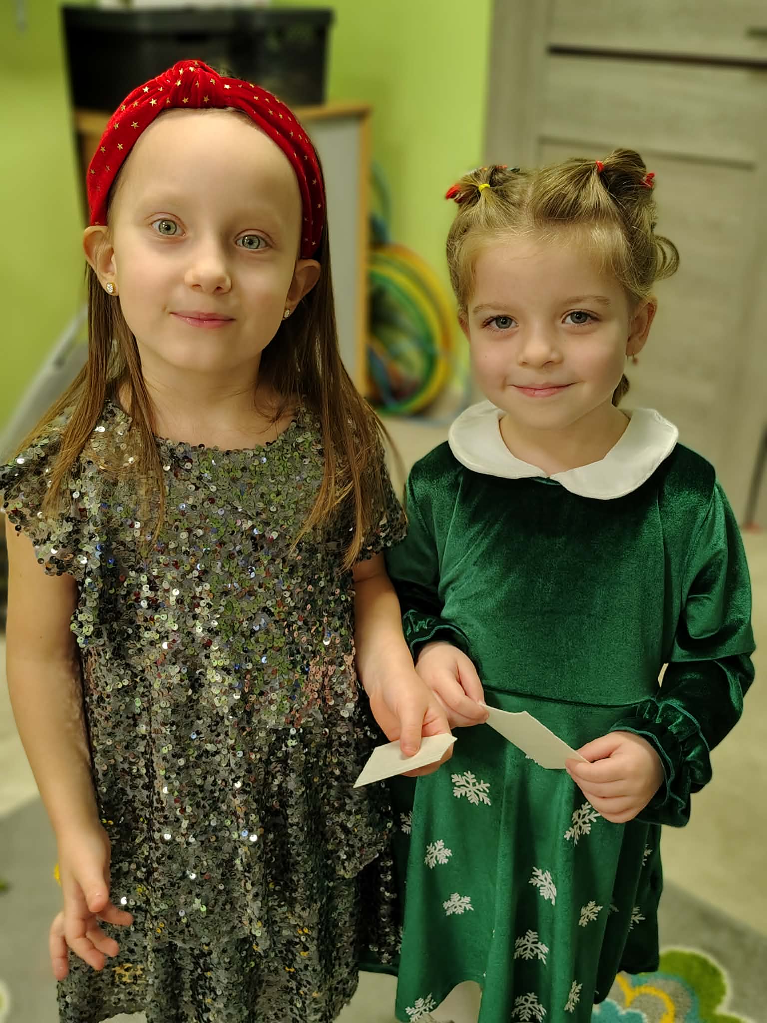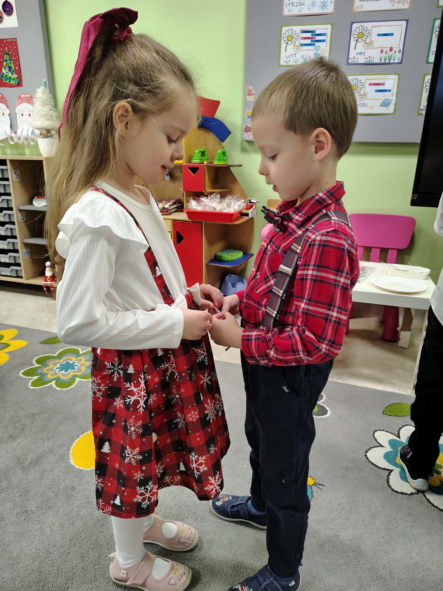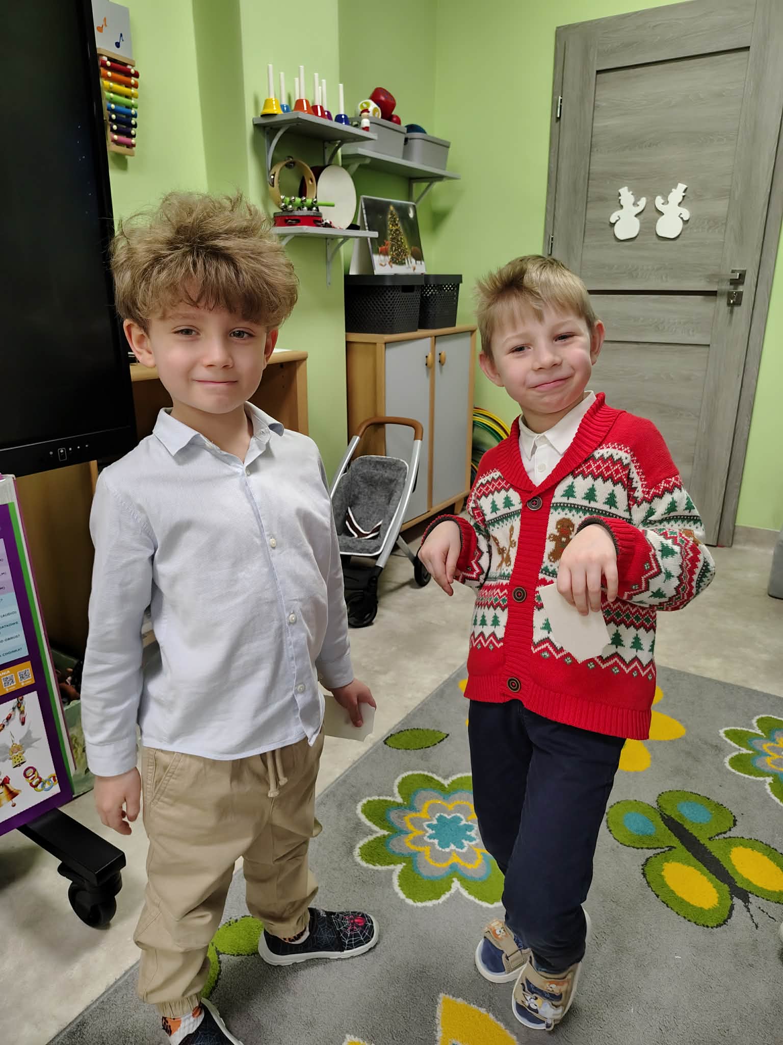 W wyjątkowej, świątecznej atmosferze odbyła się przedszkolna wigilia. Dzieci wspólnie kolędowały, składały sobie życzenia oraz dzieliły się opłatkiem. Nie zabrakło uśmiechów, radości i chwil pełnych wzruszeń. Ogromną niespodzianką była wizyta Świętego Mikołaja, który obdarował dzieci prezentami. To był niezapomniany czas, który wprowadził wszystkich w magiczny nastrój Świąt Bożego Narodzenia.